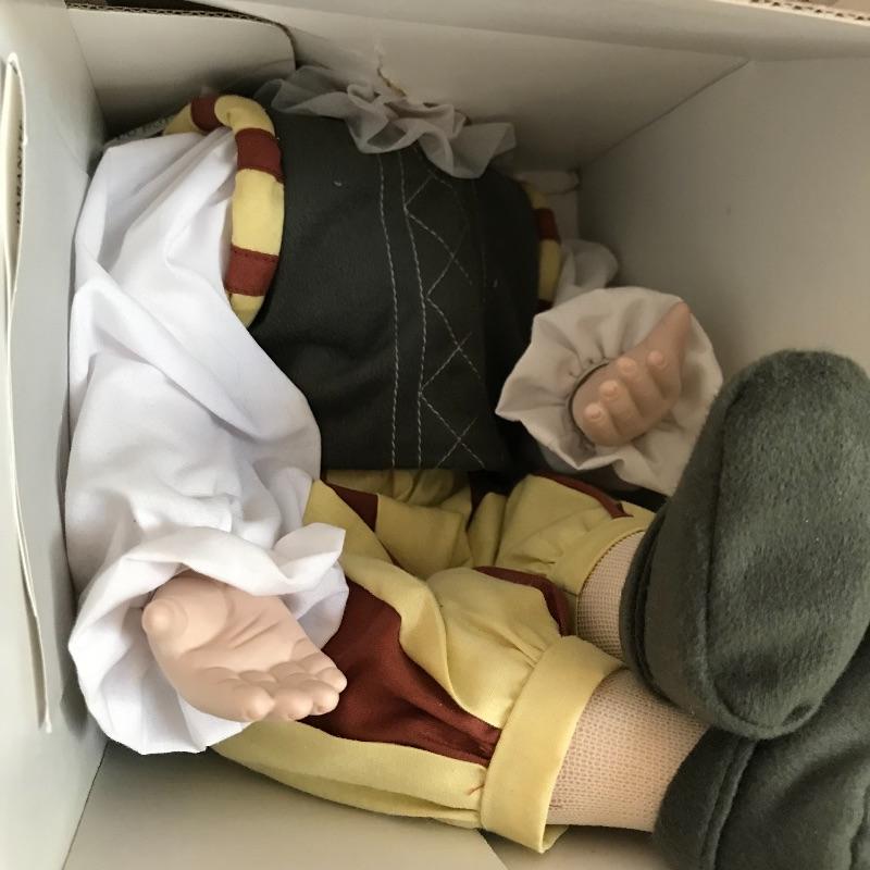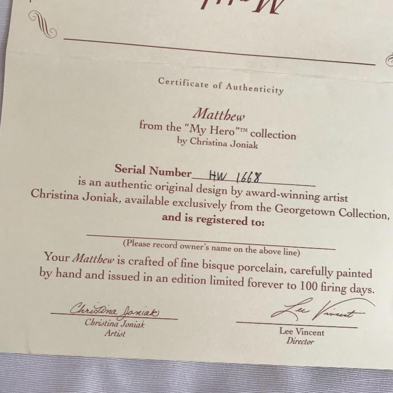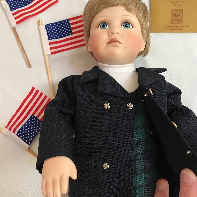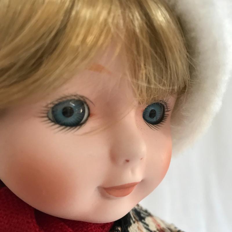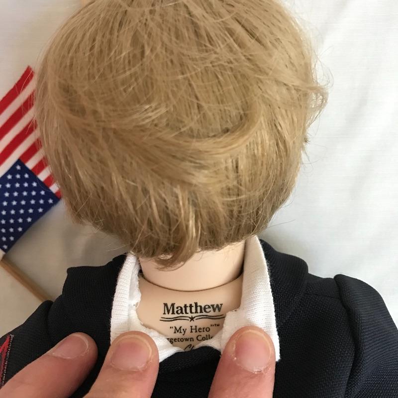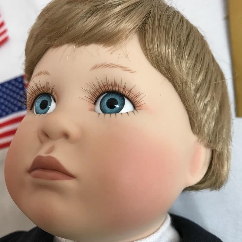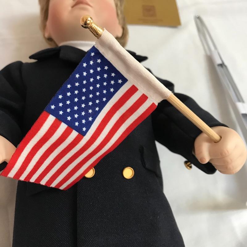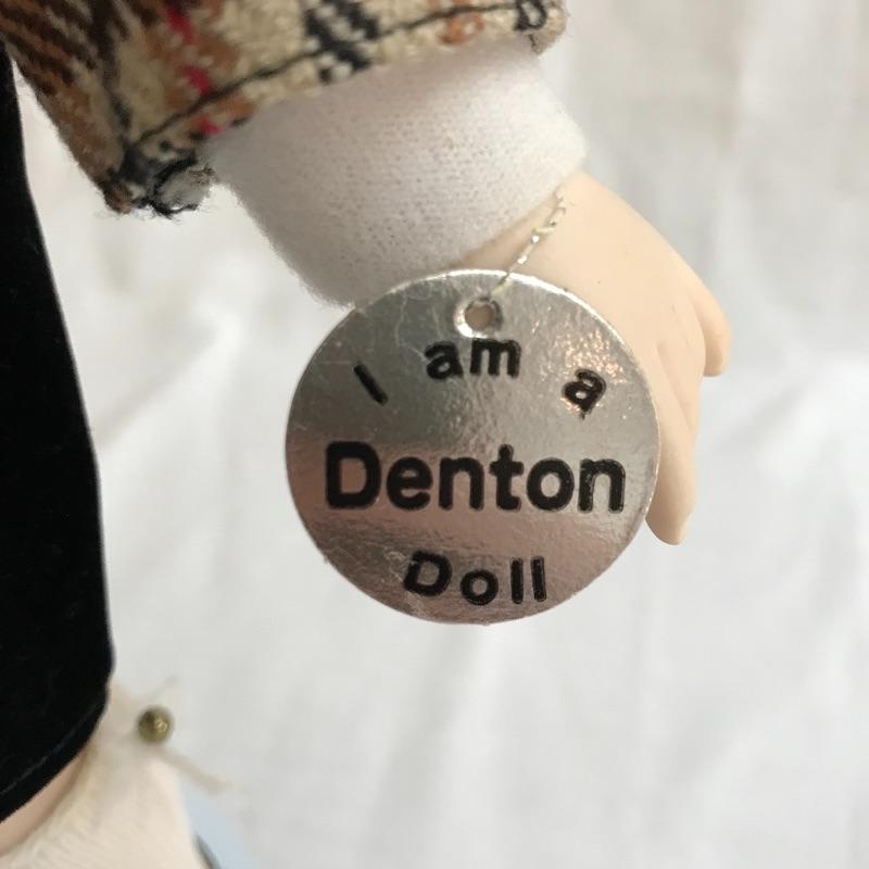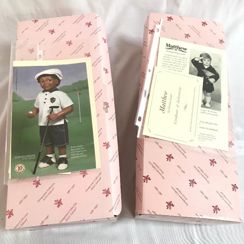 Matthew is a patriotic doll from the “My Hero” Collection by Christina Joniak. He has a double-breasted jacket and three American flags that appeared to be glued to their poles, one of which is upside down. Matthew is complete with stand and certificate. Tyler is up next with his hat and club in tow. The ball found with Tyler doesn’t appear to be original and made of a puddy like substance. Tyler also has his stand and certificate. Sailing the ocean blue is little Christopher Columbus with a feathered hat, world map and ship. Christopher also has his certificate of authenticity, he does not appear to have a stand. Lastly is a boy doll in winter knee pants. He has a tag around his wrist stating “I am a Denton Doll”. He has no known markings to confirm and also lacks a certificate. This little boy has glass eyes and apparently has porcelain features with a cloth torso. His stand is included in lot. See photos. Shipping available.