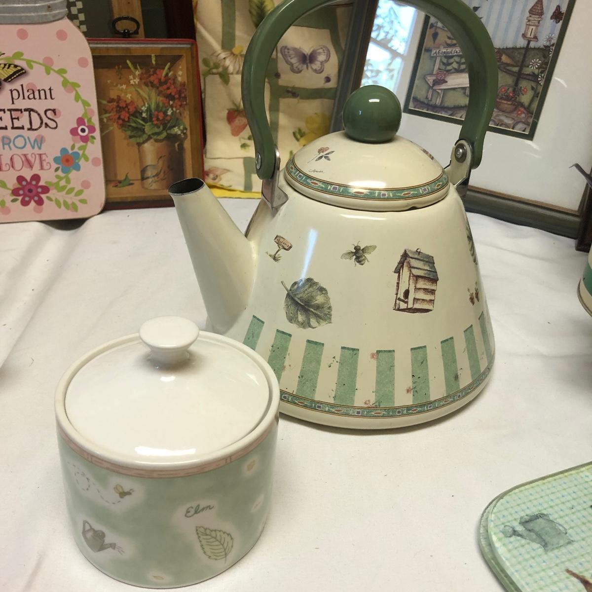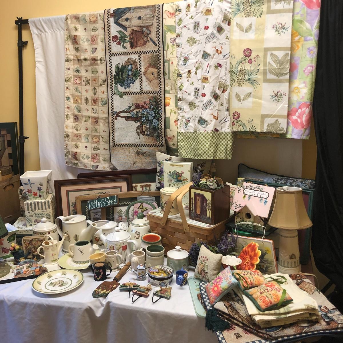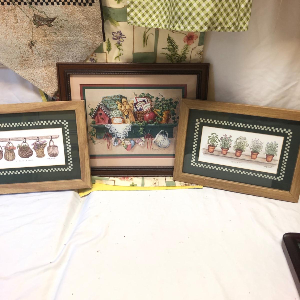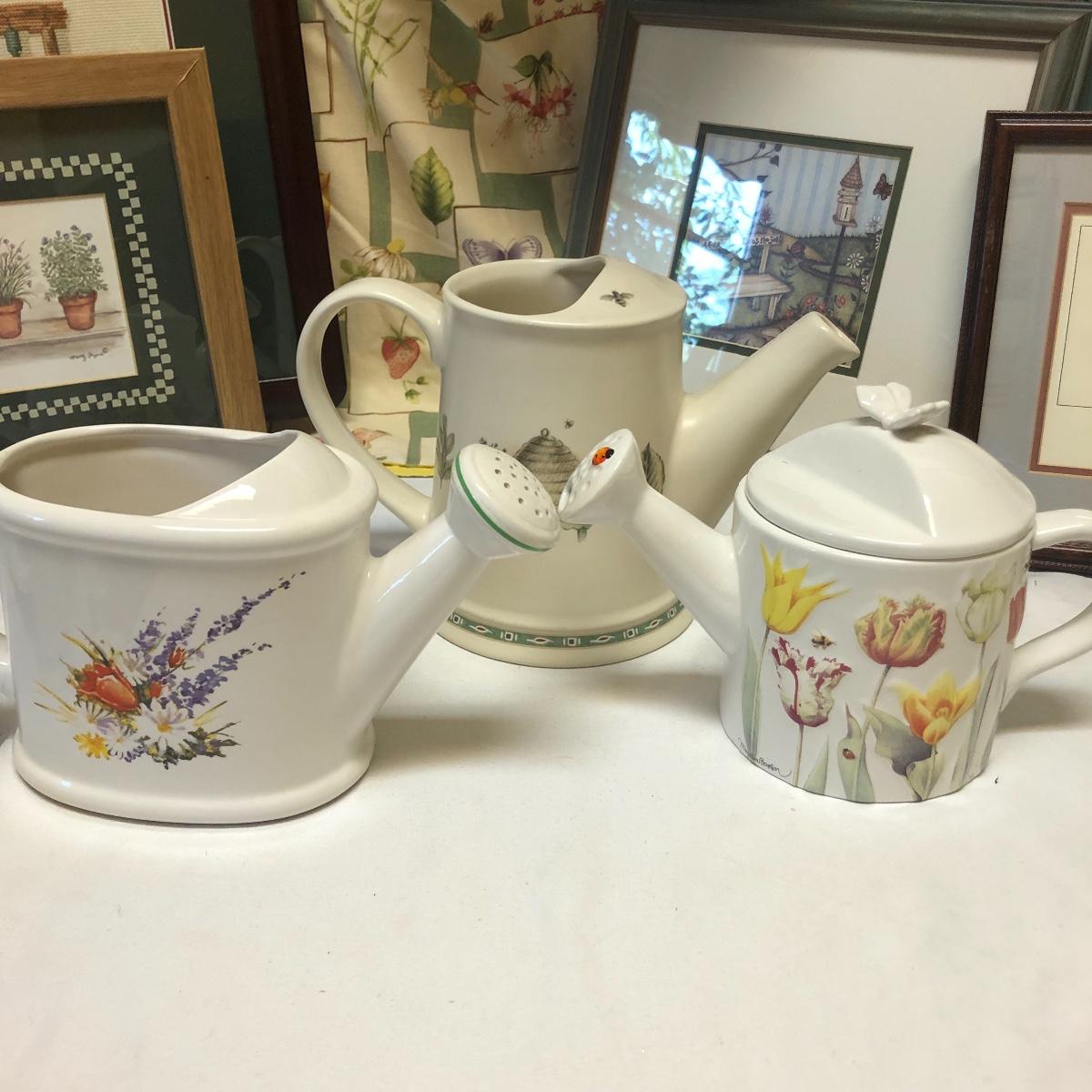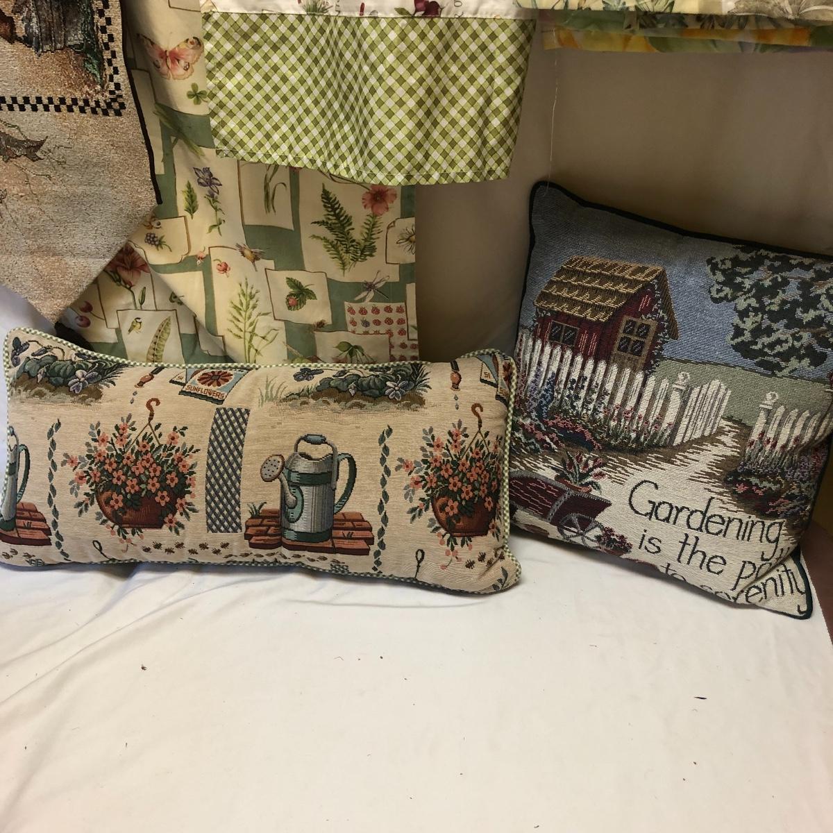This very large lot is for all you garden lovers who like nothing better than bringing the outdoors in! Some of the many items include a picnic style basket, metal stovetop kettle, Marjolein Bastin teapot, 3 glass chopping boards, 2 small ceramic lamps (one untested as it takes a tiny bulb), throw pillows, both metal and ceramic decorative watering cans (including 1 Aynsley bone China), framed art prints (includes a Barbara Mock and NC artist Cotton Ketchie), 4 table runners, napkins (note the stain shown in last last image), 2 shower curtains, 3 curtains (2 are rod curtains and the other a valance), decorative plates and much more.