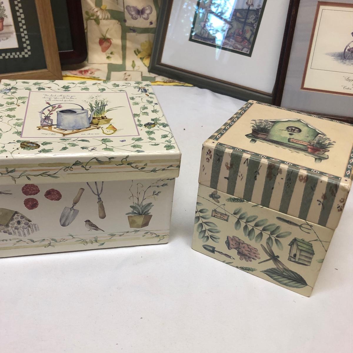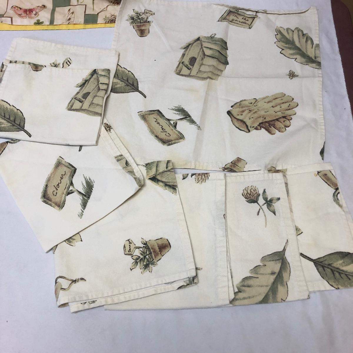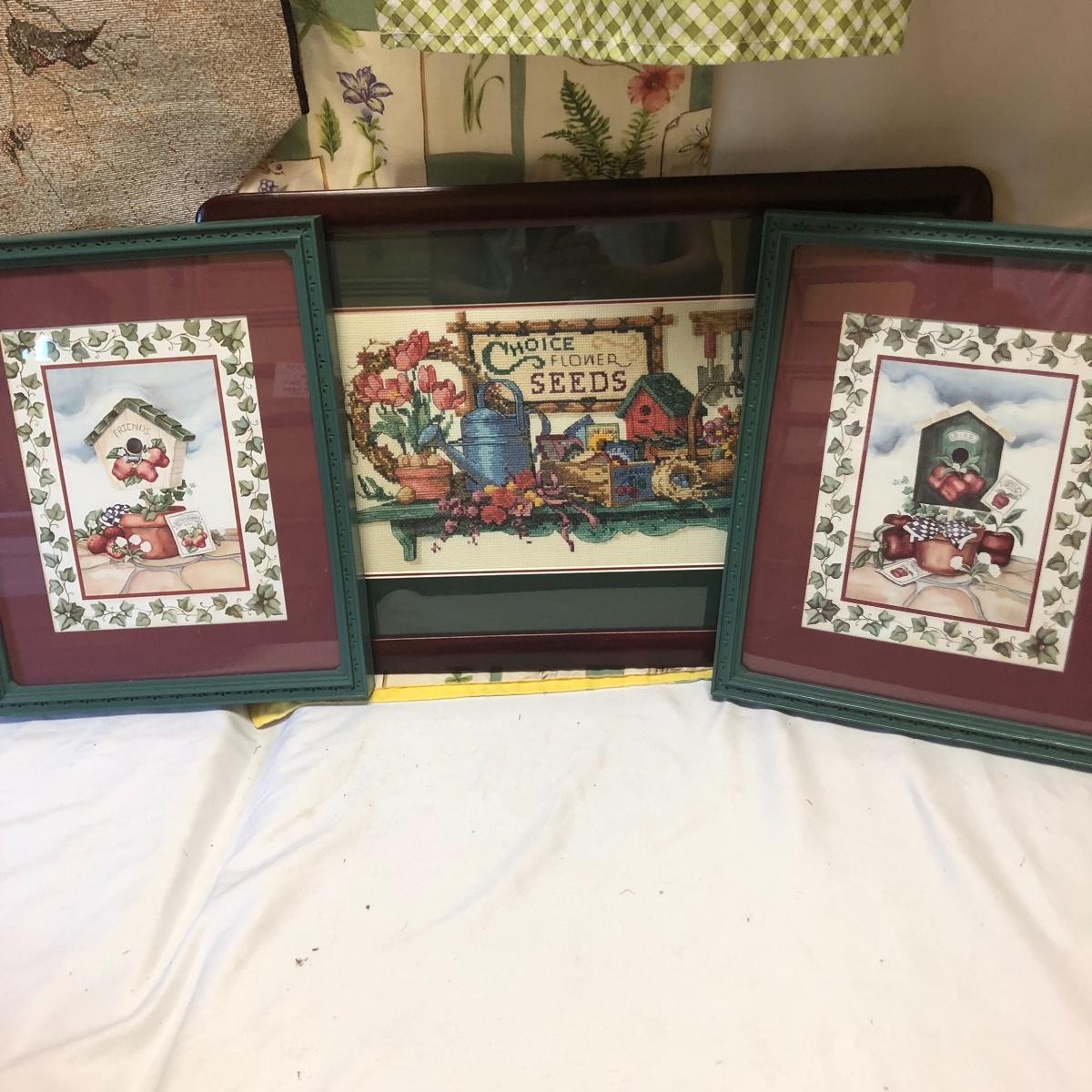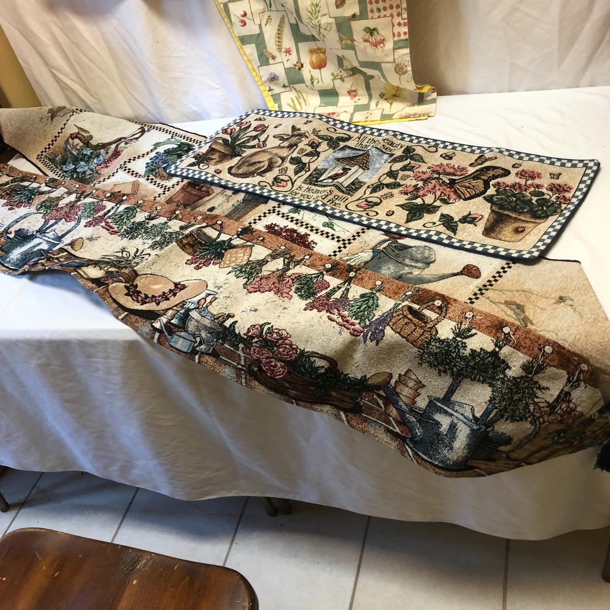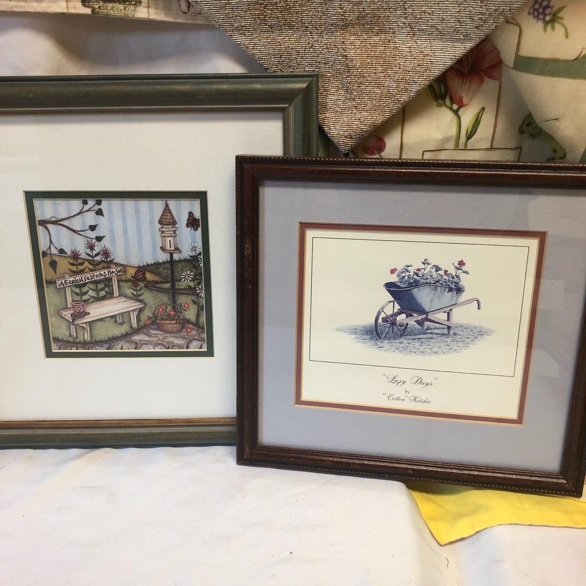 This very large lot is for all you garden lovers who like nothing better than bringing the outdoors in! Some of the many items include a picnic style basket, metal stovetop kettle, Marjolein Bastin teapot, 3 glass chopping boards, 2 small ceramic lamps (one untested as it takes a tiny bulb), throw pillows, both metal and ceramic decorative watering cans (including 1 Aynsley bone China), framed art prints (includes a Barbara Mock and NC artist Cotton Ketchie), 4 table runners, napkins (note the stain shown in last last image), 2 shower curtains, 3 curtains (2 are rod curtains and the other a valance), decorative plates and much more.