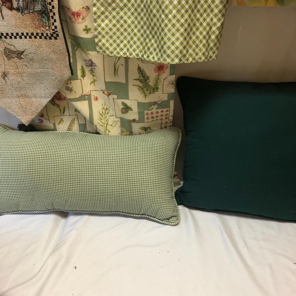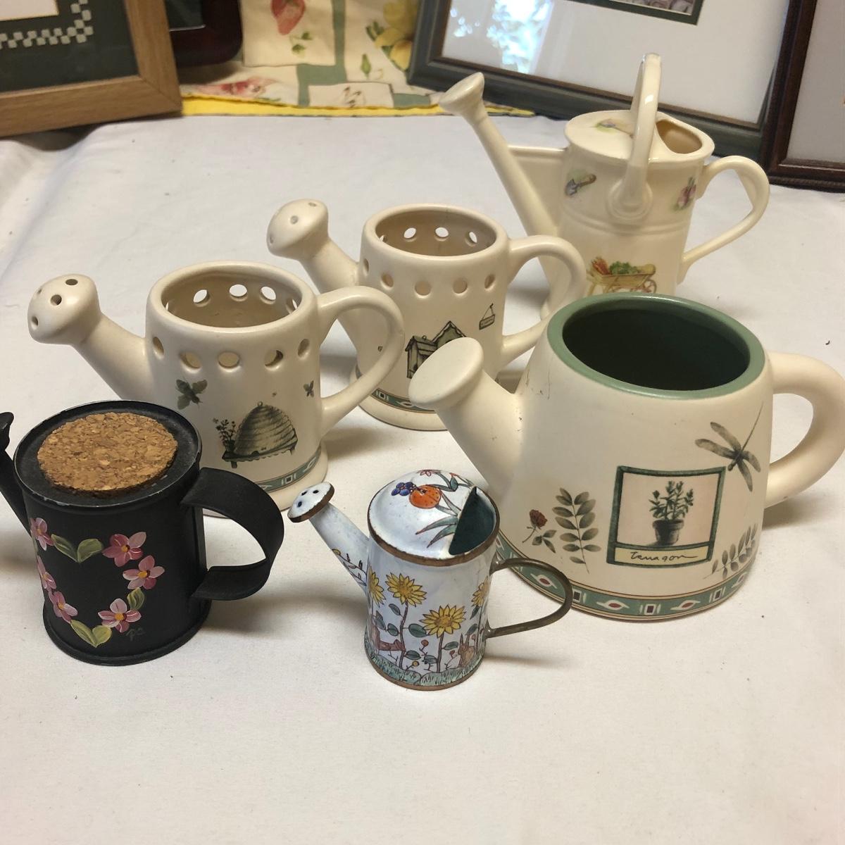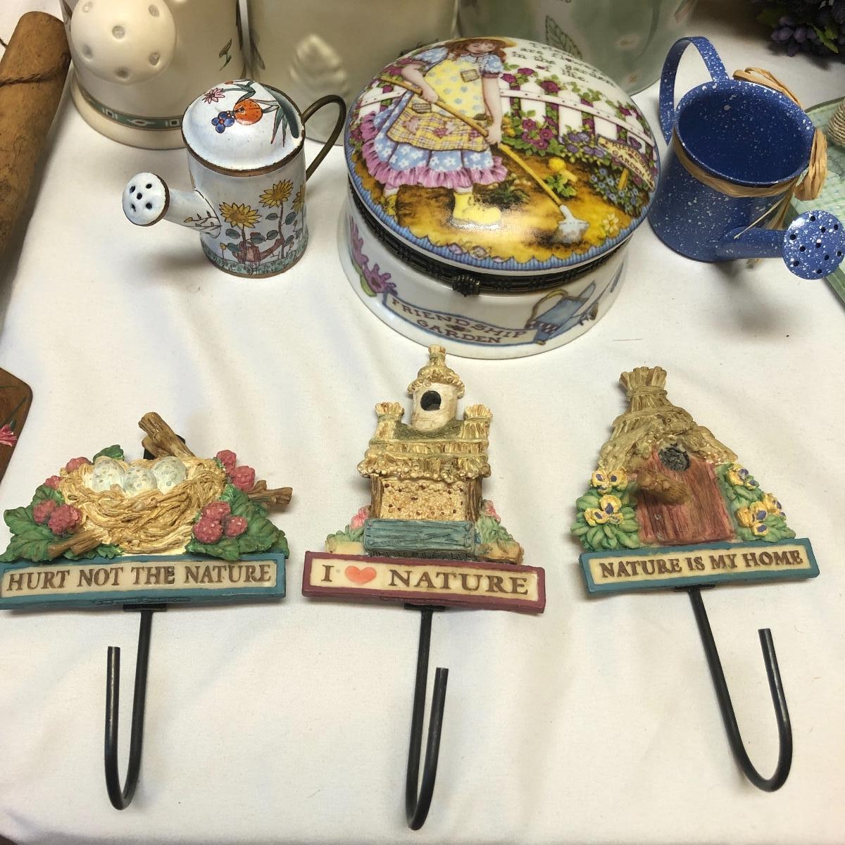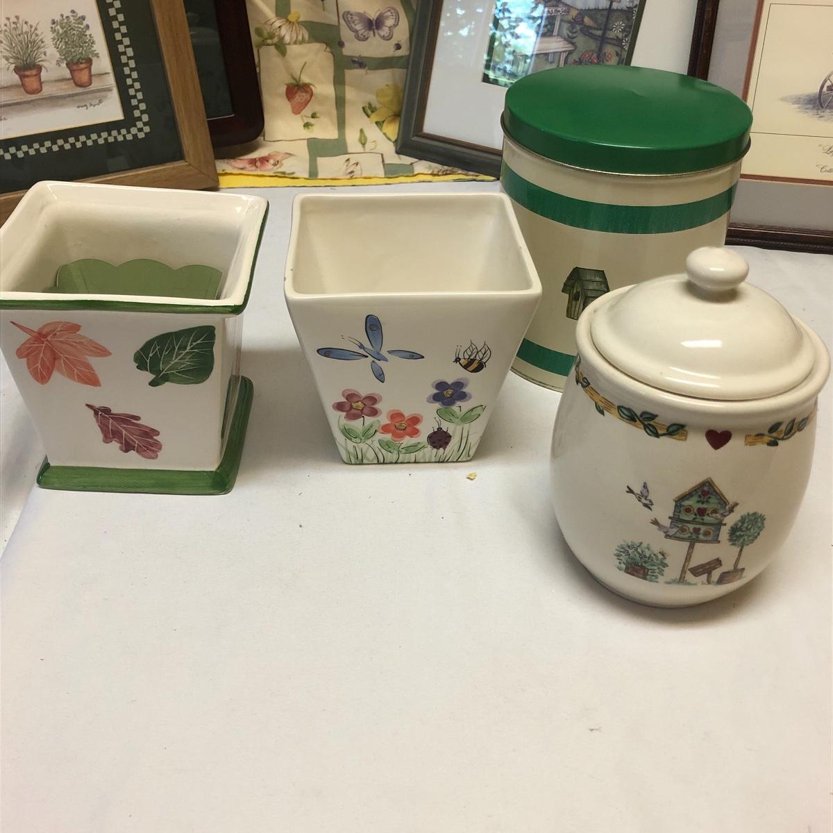This very large lot is for all you garden lovers who like nothing better than bringing the outdoors in! Some of the many items include a picnic style basket, metal stovetop kettle, Marjolein Bastin teapot, 3 glass chopping boards, 2 small ceramic lamps (one untested as it takes a tiny bulb), throw pillows, both metal and ceramic decorative watering cans (including 1 Aynsley bone China), framed art prints (includes a Barbara Mock and NC artist Cotton Ketchie), 4 table runners, napkins (note the stain shown in last last image), 2 shower curtains, 3 curtains (2 are rod curtains and the other a valance), decorative plates and much more.