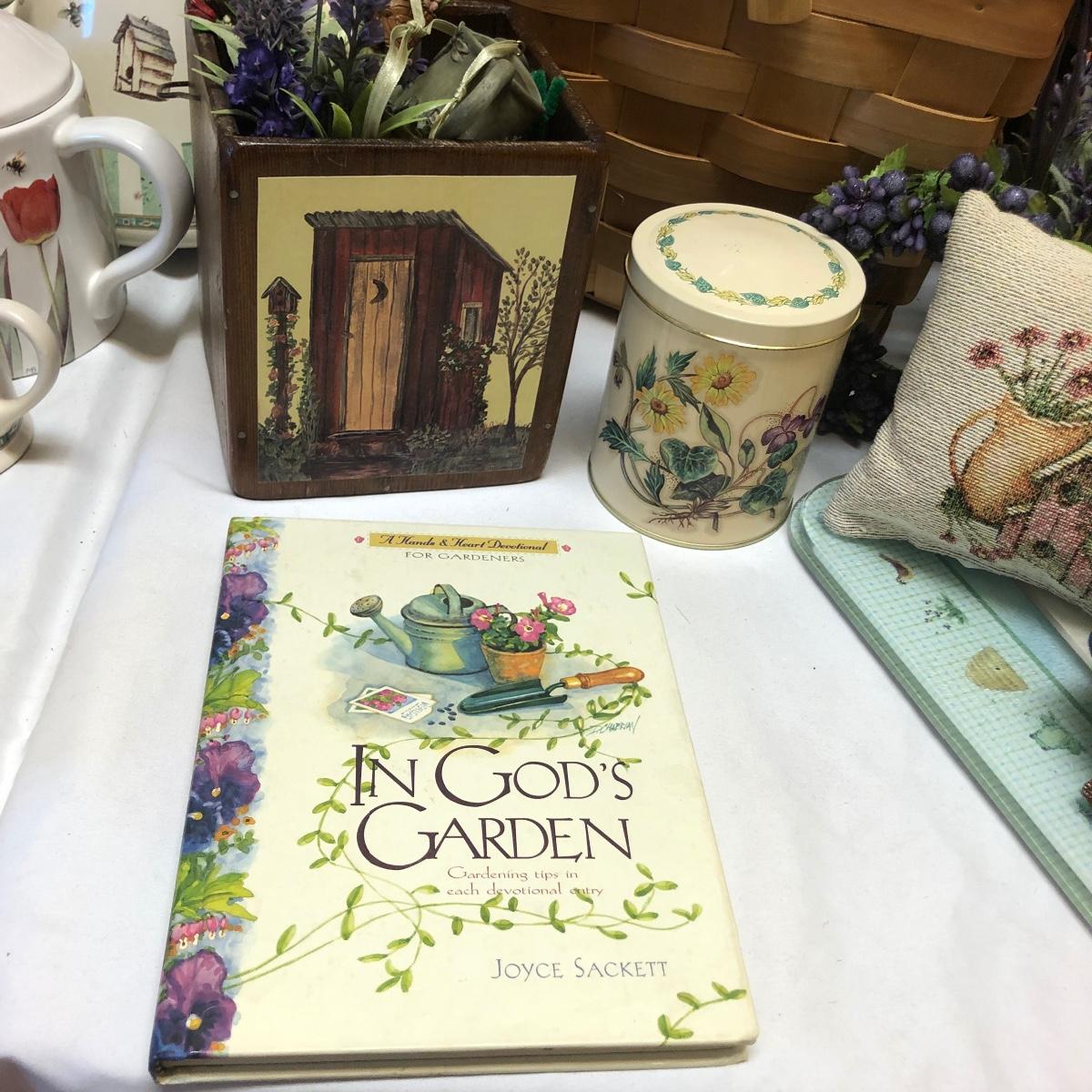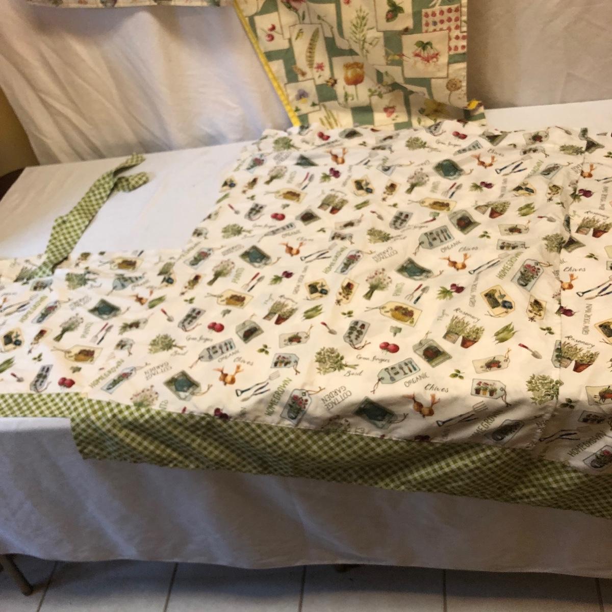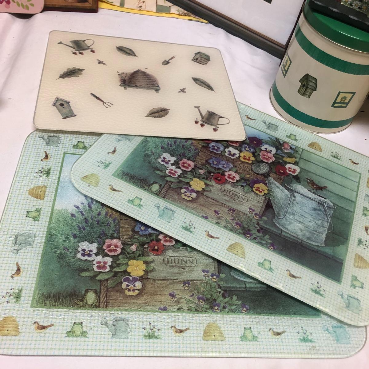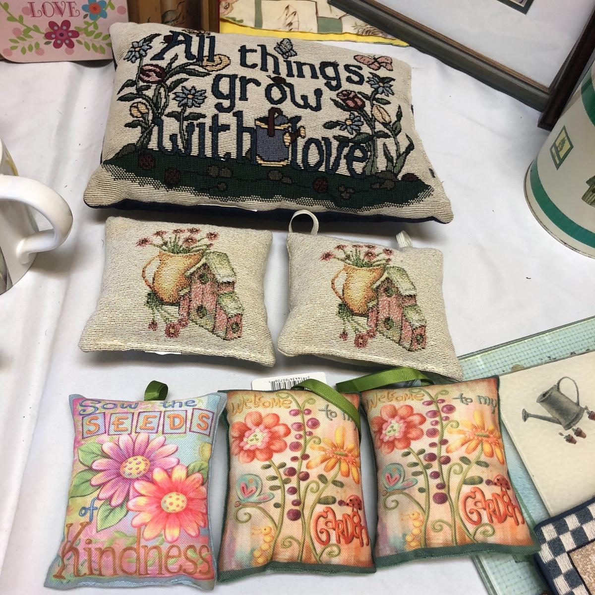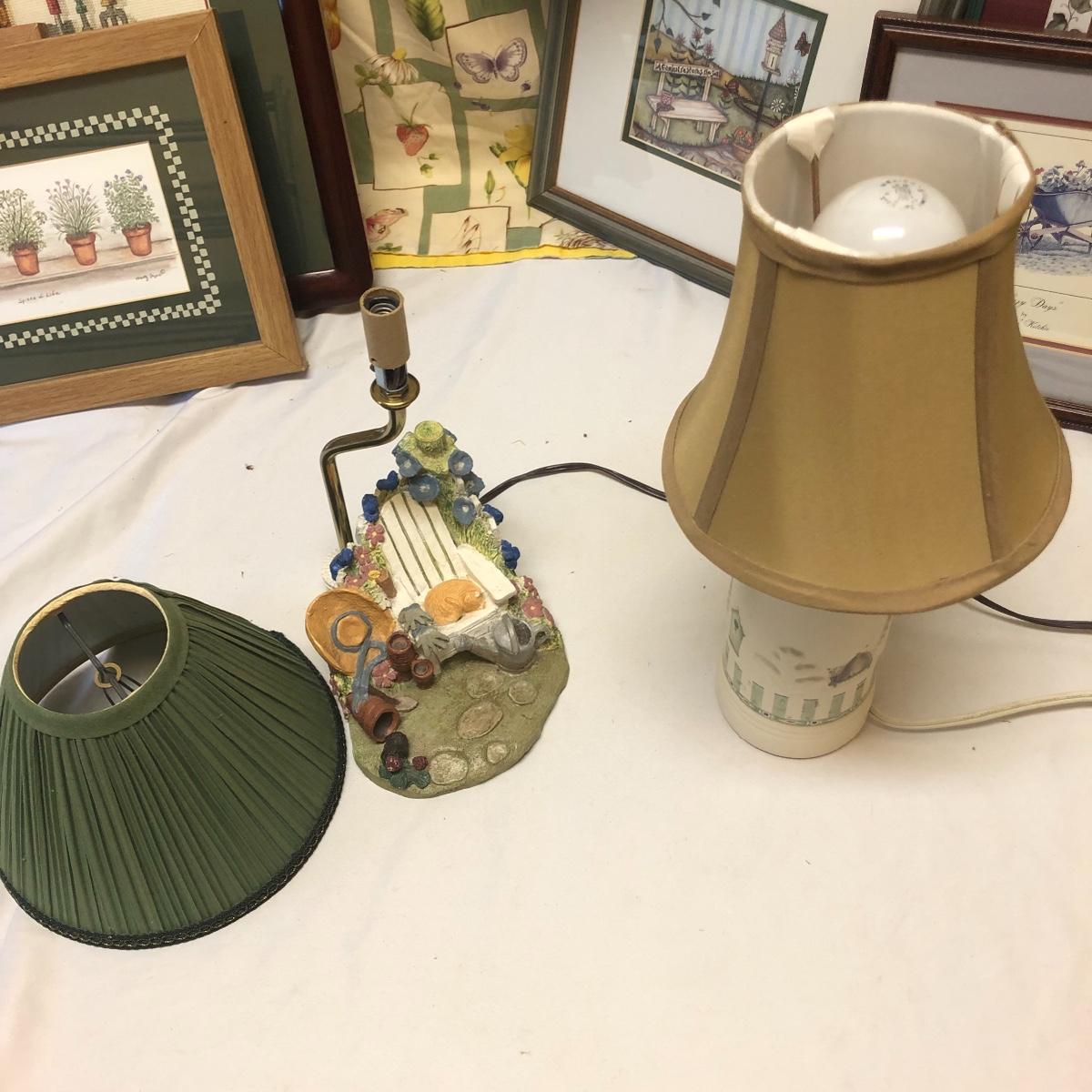 This very large lot is for all you garden lovers who like nothing better than bringing the outdoors in! Some of the many items include a picnic style basket, metal stovetop kettle, Marjolein Bastin teapot, 3 glass chopping boards, 2 small ceramic lamps (one untested as it takes a tiny bulb), throw pillows, both metal and ceramic decorative watering cans (including 1 Aynsley bone China), framed art prints (includes a Barbara Mock and NC artist Cotton Ketchie), 4 table runners, napkins (note the stain shown in last last image), 2 shower curtains, 3 curtains (2 are rod curtains and the other a valance), decorative plates and much more.
