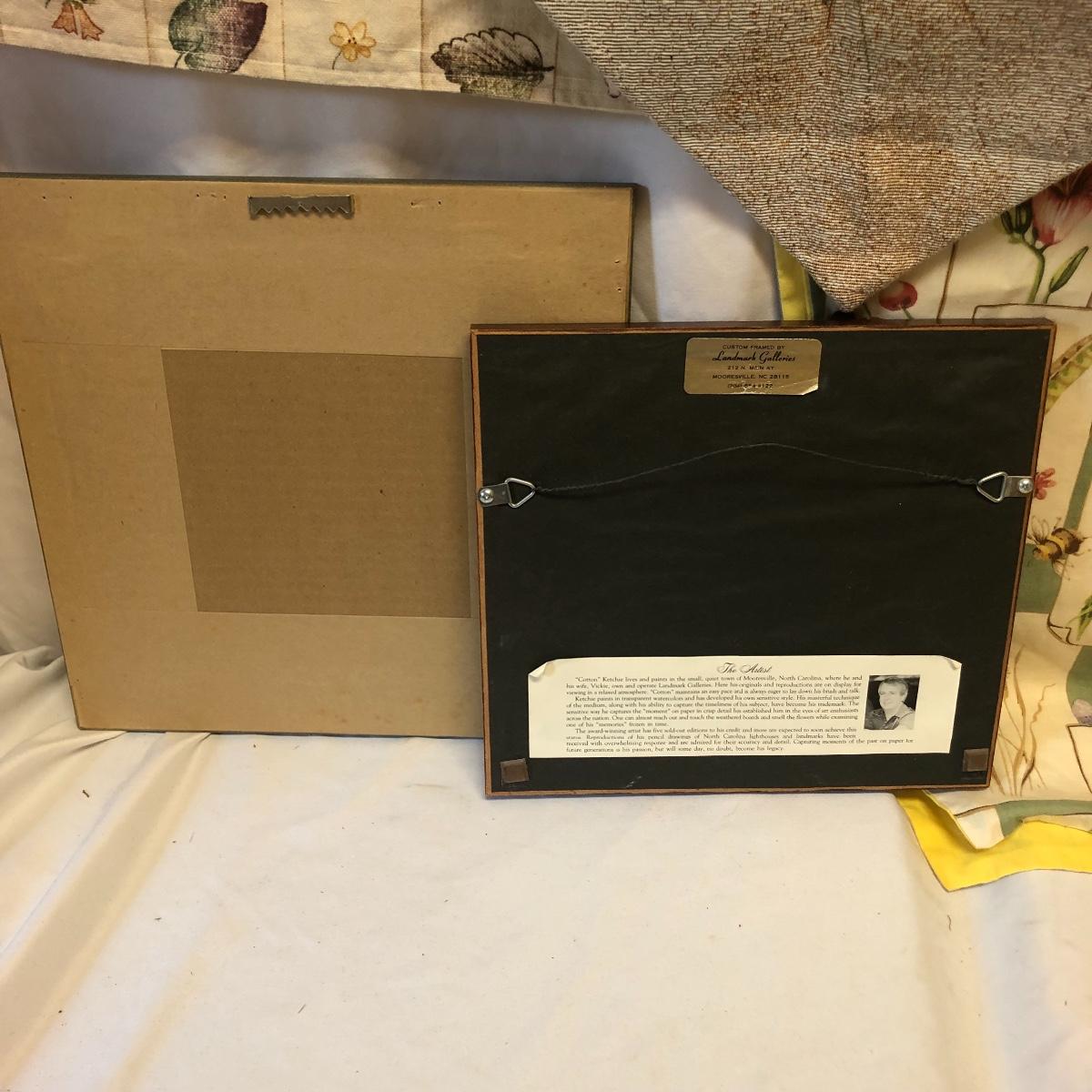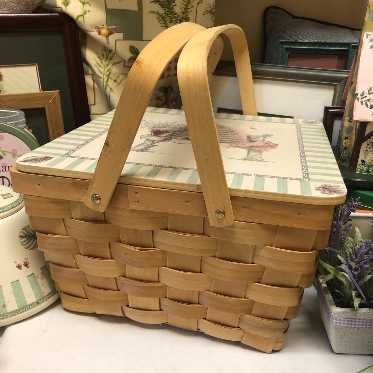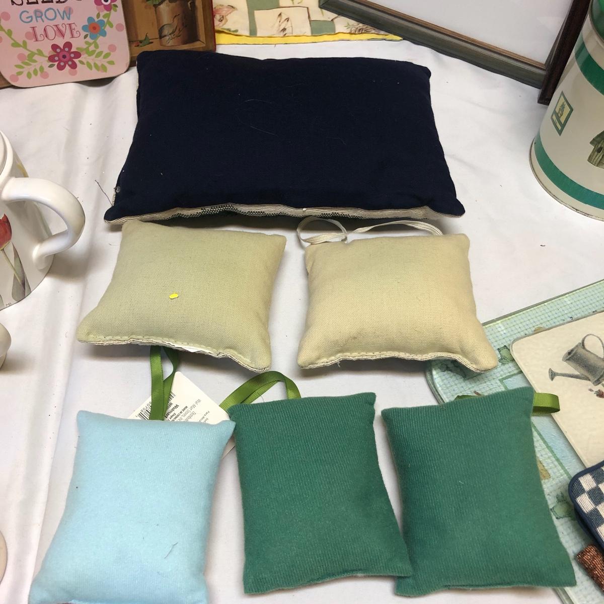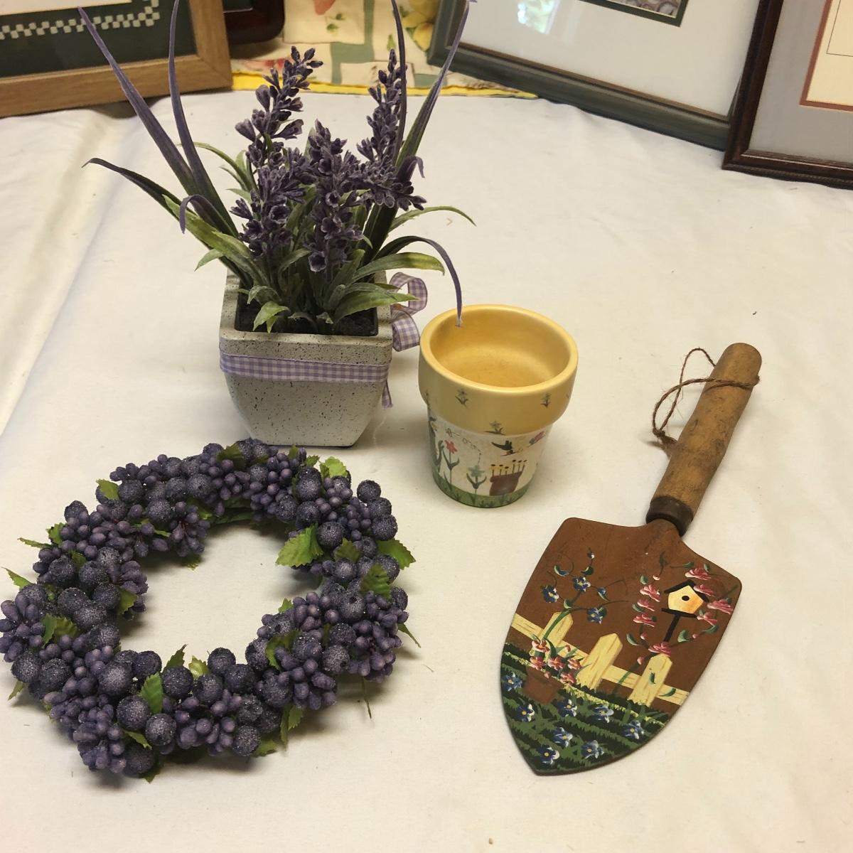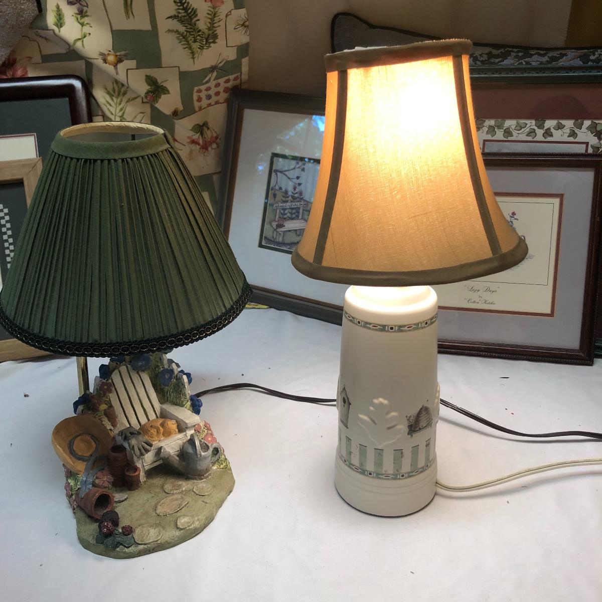 This very large lot is for all you garden lovers who like nothing better than bringing the outdoors in! Some of the many items include a picnic style basket, metal stovetop kettle, Marjolein Bastin teapot, 3 glass chopping boards, 2 small ceramic lamps (one untested as it takes a tiny bulb), throw pillows, both metal and ceramic decorative watering cans (including 1 Aynsley bone China), framed art prints (includes a Barbara Mock and NC artist Cotton Ketchie), 4 table runners, napkins (note the stain shown in last last image), 2 shower curtains, 3 curtains (2 are rod curtains and the other a valance), decorative plates and much more.