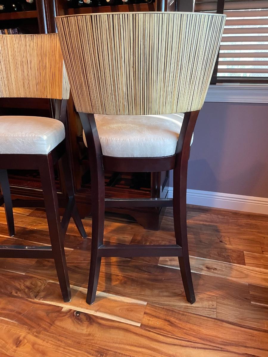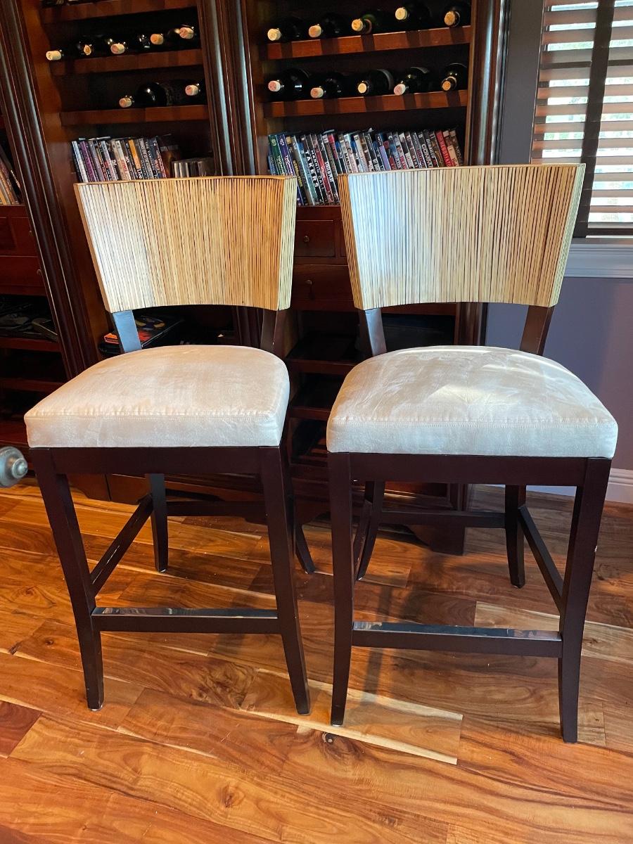 Bamboo back with faux suede upholstered seat and dark, glossy wood legs. Like new condition. Can deliver locally for a fee