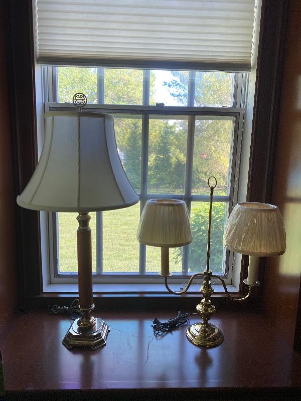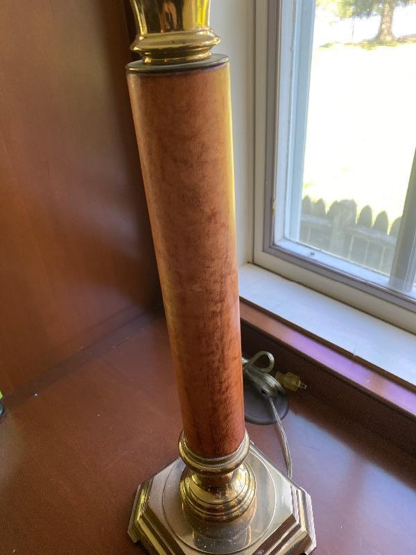 Tall heavy leather wrapped lamp Measures 22 inches tall without the shade the desk lamp is approximately 24 inches high in the center and each lamp with the shade is approximately 20 1/2 inches tall