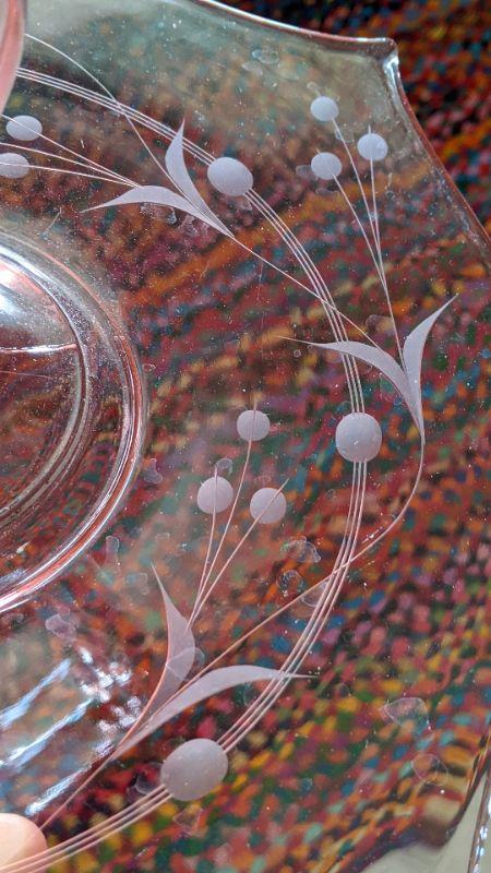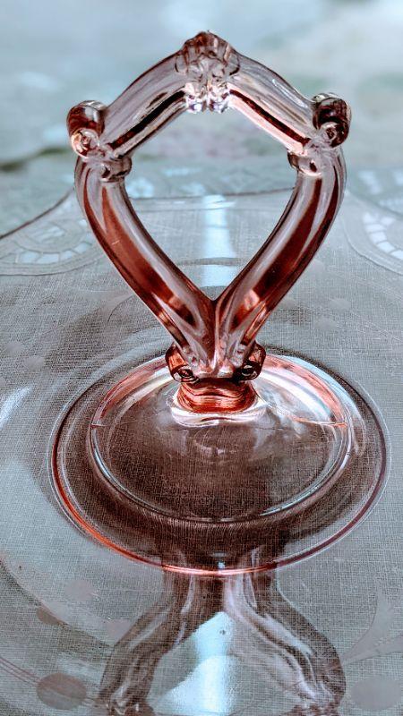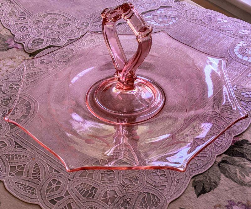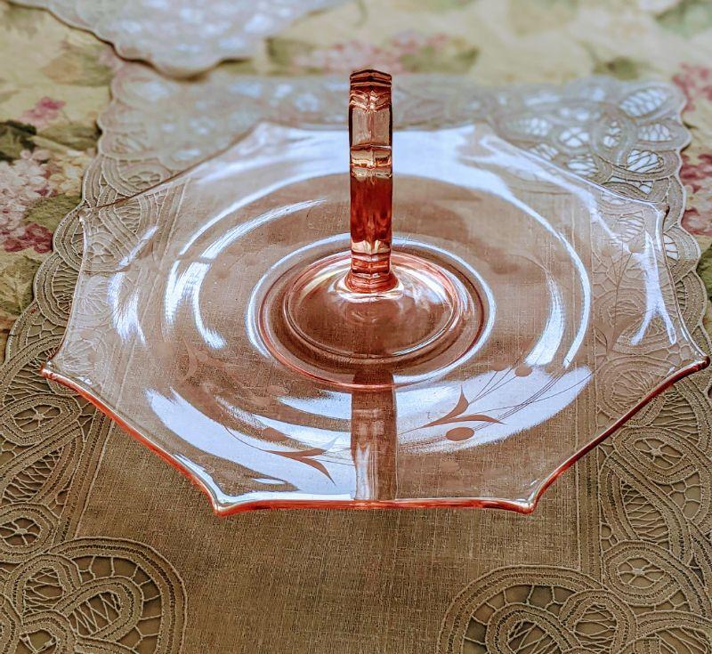 Lot 287 Pink Depression glass Handle octagonal tidbit Sandwich Cake serving tray Etched design