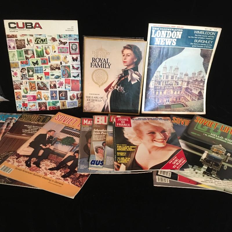 Lot includes The Story of the Royal Family coffee table book and a variety of international magazines including London News, Soviet Life, Cuba and more. This will help you travel when you are stuck at home.