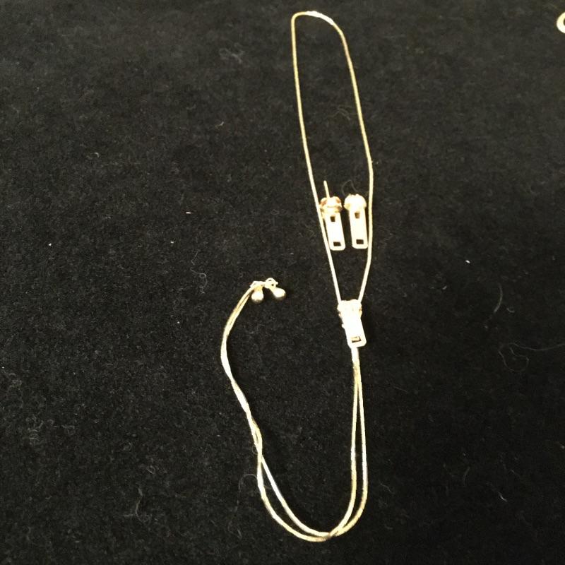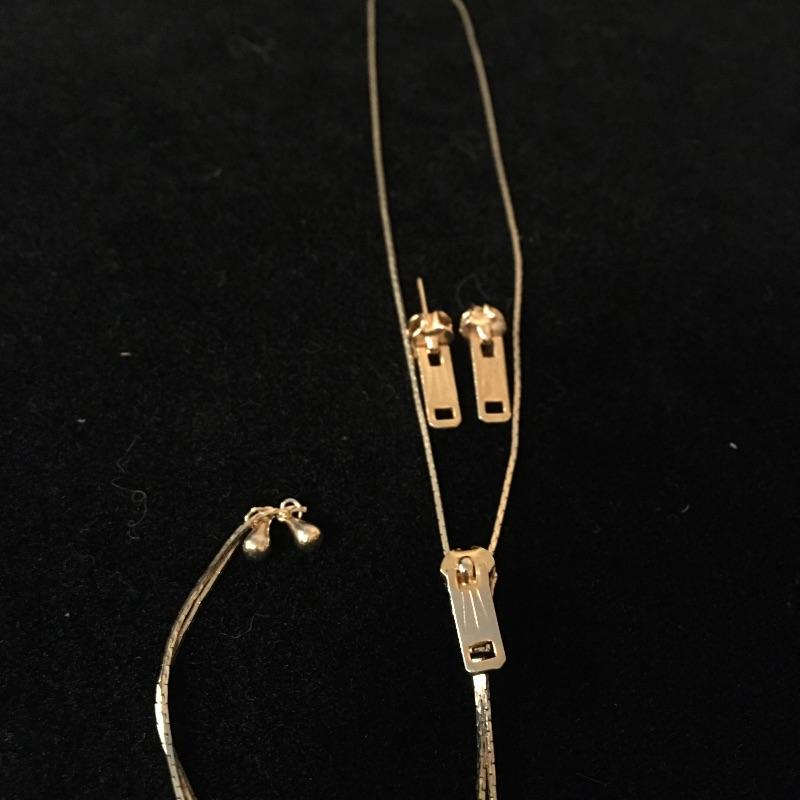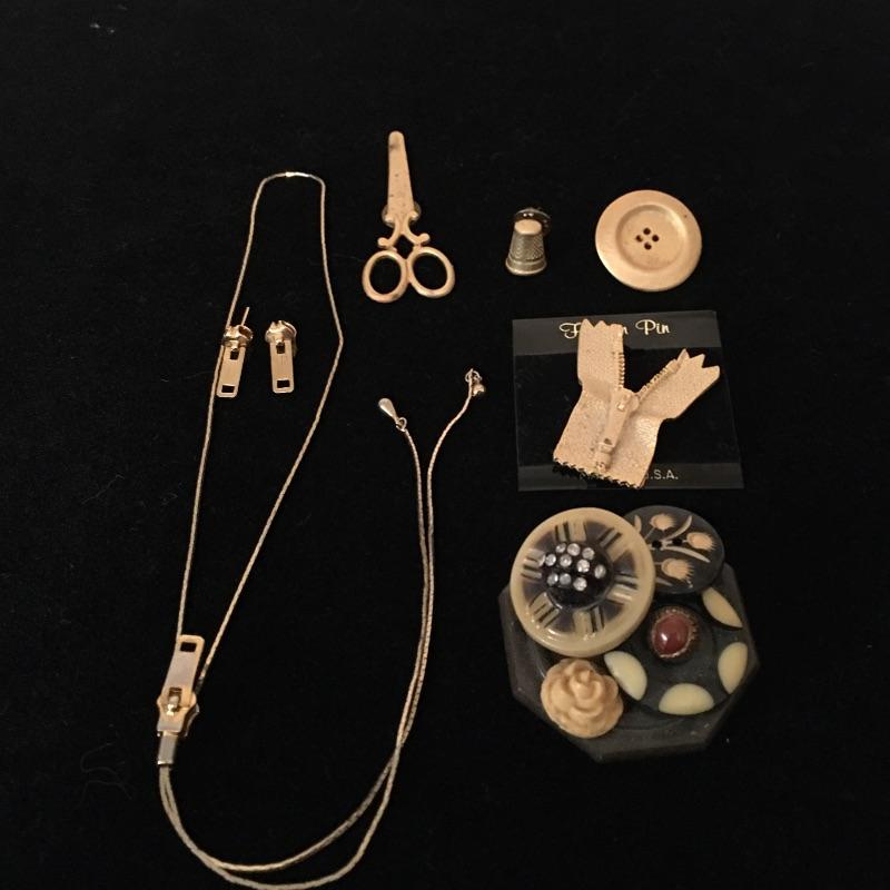 Seamstress fun jewelry includes matching earrings and necklace zipper, scissors pin, thimble pin, button pin, zipper pin and a pin made of buttons. A great treat for the seamstress in your life or treat yourself.