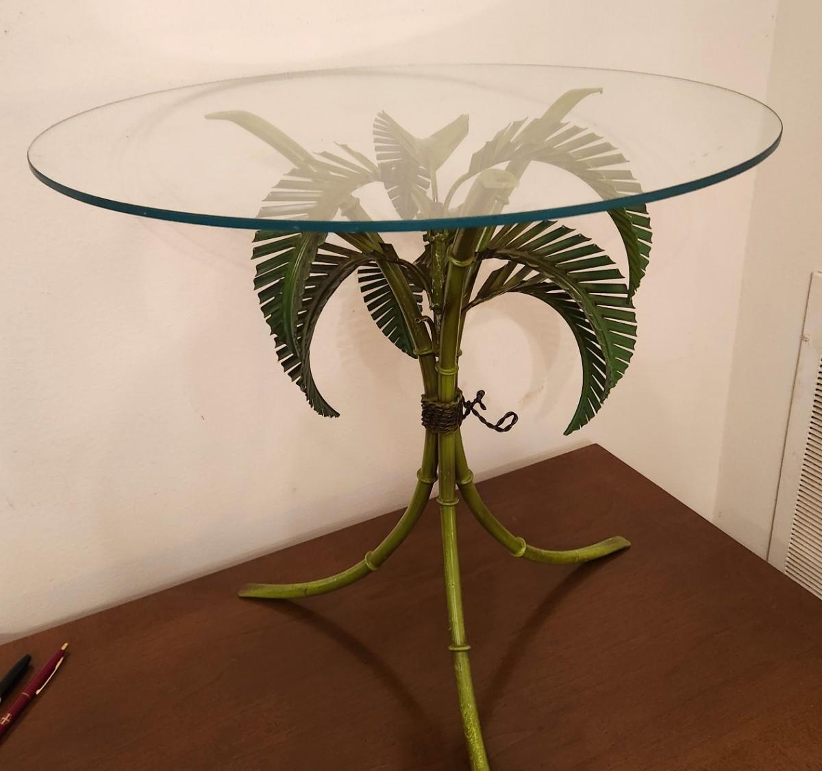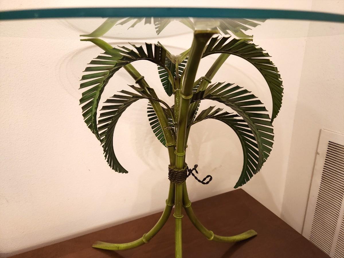 Cute little glass topped occasional table with Palm Motif at the base. 18.5" tall, 20" across. Good condition.