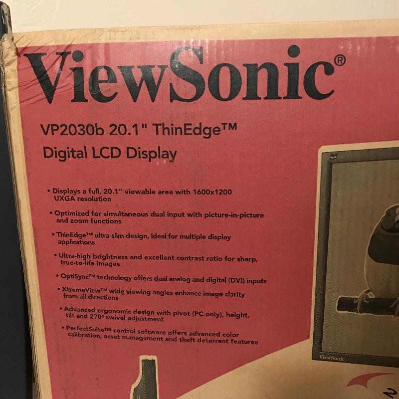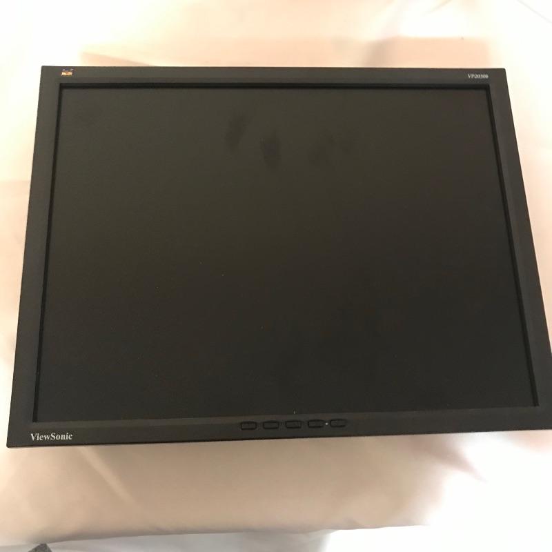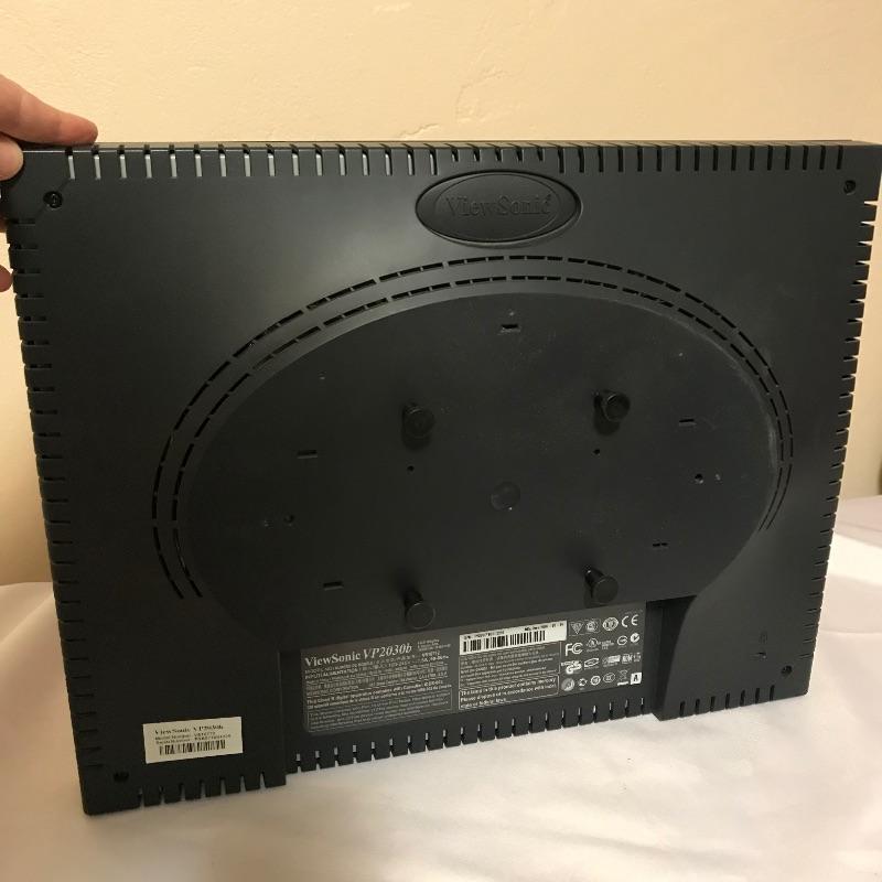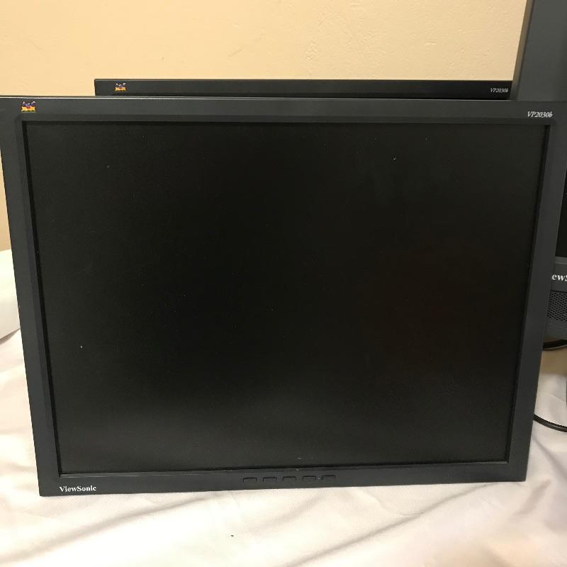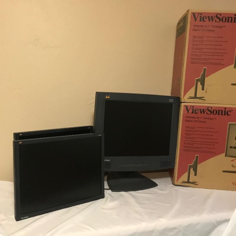Two ViewSonic VP2030b 20” LCD monitors with unused desk mounts. Boxes boast “Advanced ergonomic design with pivot (PC only), height, tilt and 270° swivel adjustment”. It is currently unknown if more hardware is needed to attach monitors to mounts. Lot also features a ViewSonic ViewPanel VP201mb 20” monitor. Monitor is attached to a mount that swivels, is height adjustable by 2”. All three have power cords and turn on when plugged in. See photos. Local pick up only.