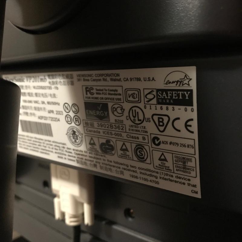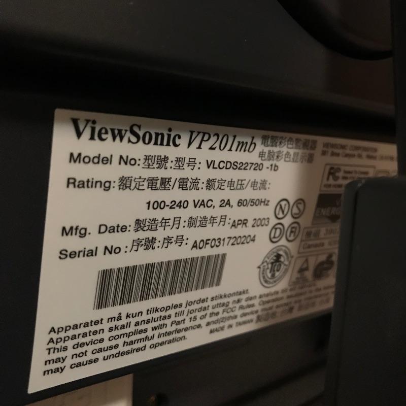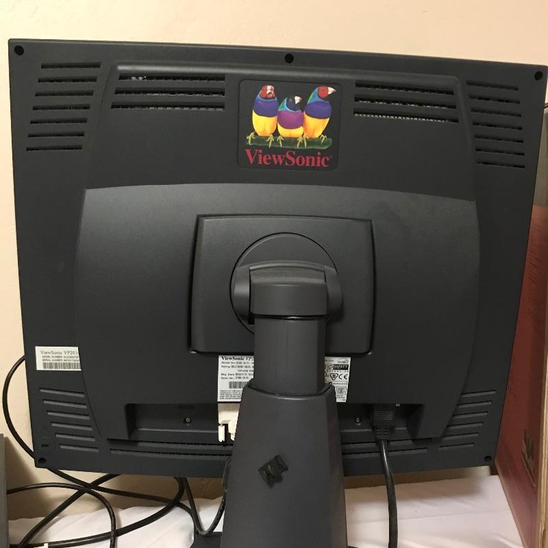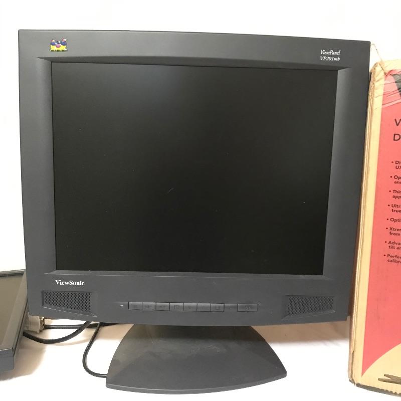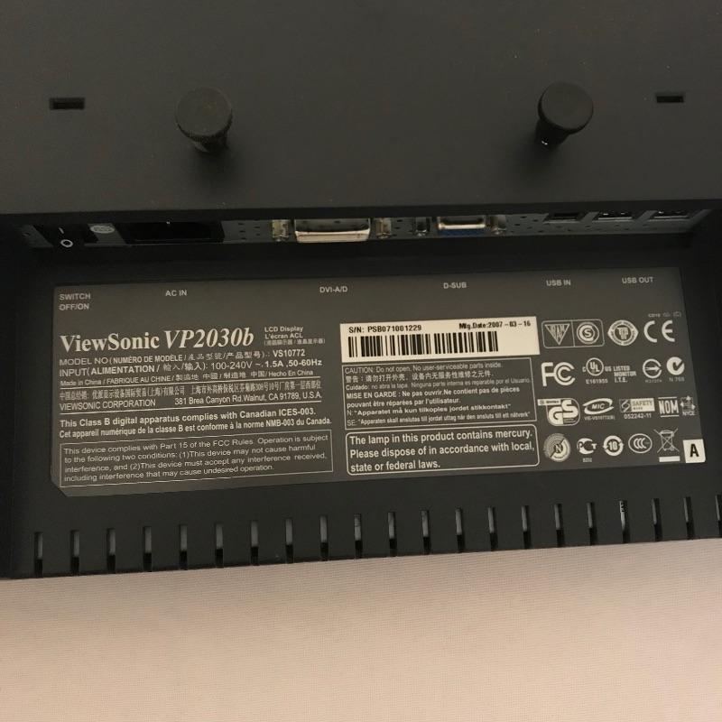 Two ViewSonic VP2030b 20” LCD monitors with unused desk mounts. Boxes boast “Advanced ergonomic design with pivot (PC only), height, tilt and 270° swivel adjustment”. It is currently unknown if more hardware is needed to attach monitors to mounts. Lot also features a ViewSonic ViewPanel VP201mb 20” monitor. Monitor is attached to a mount that swivels, is height adjustable by 2”. All three have power cords and turn on when plugged in. See photos. Local pick up only.