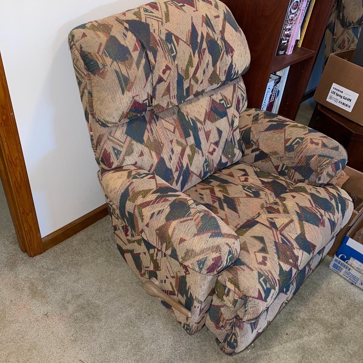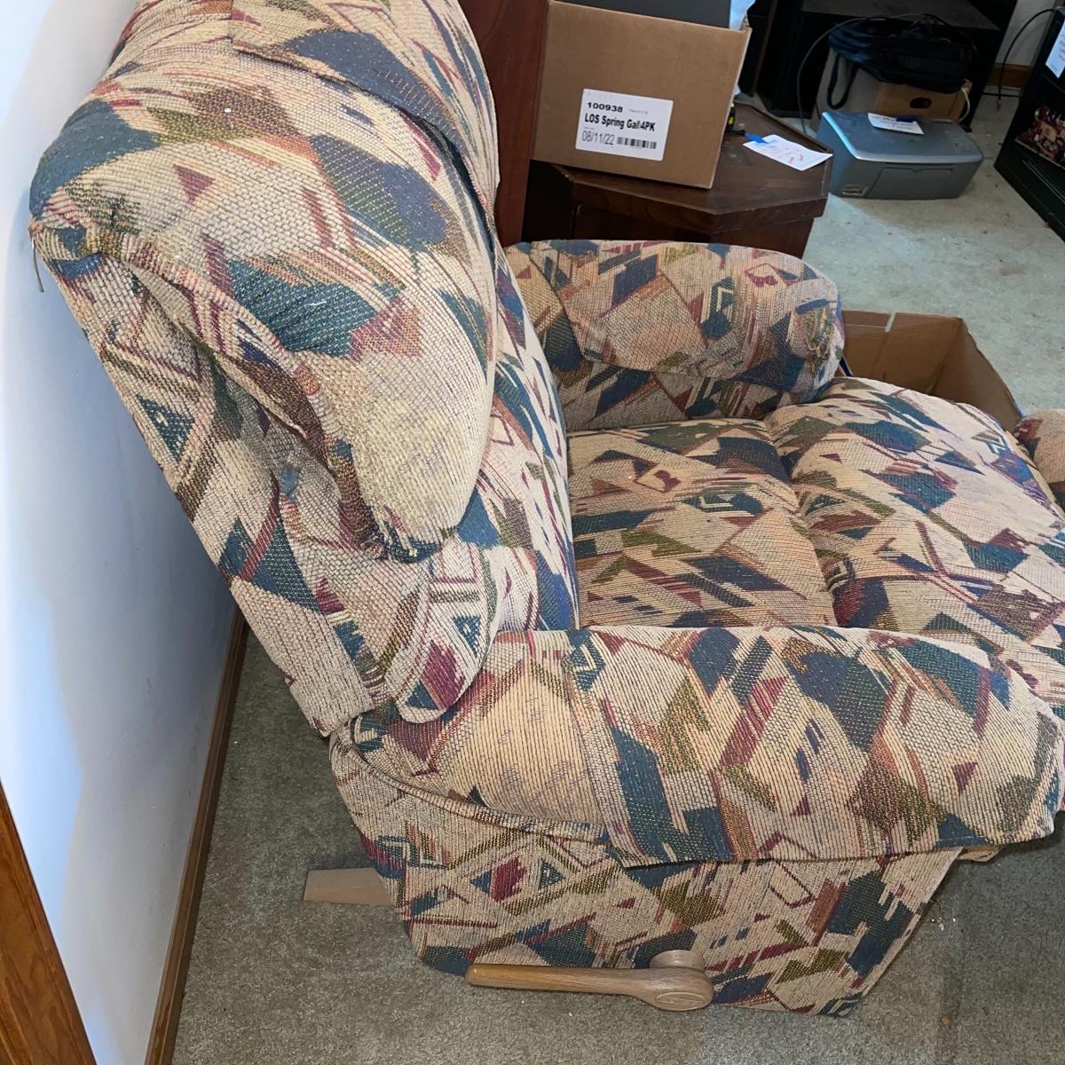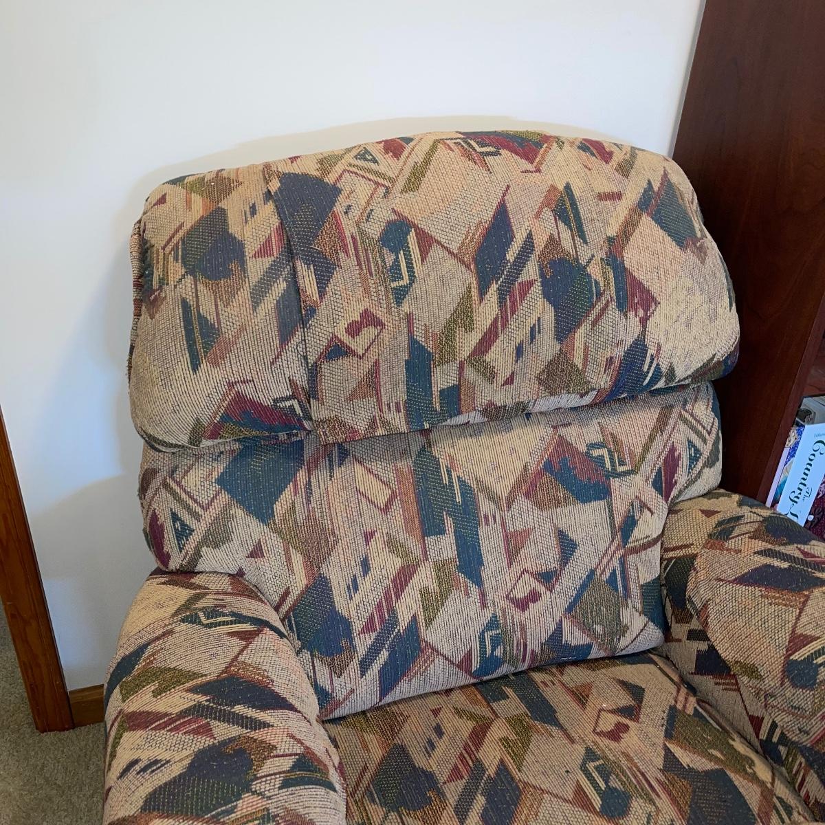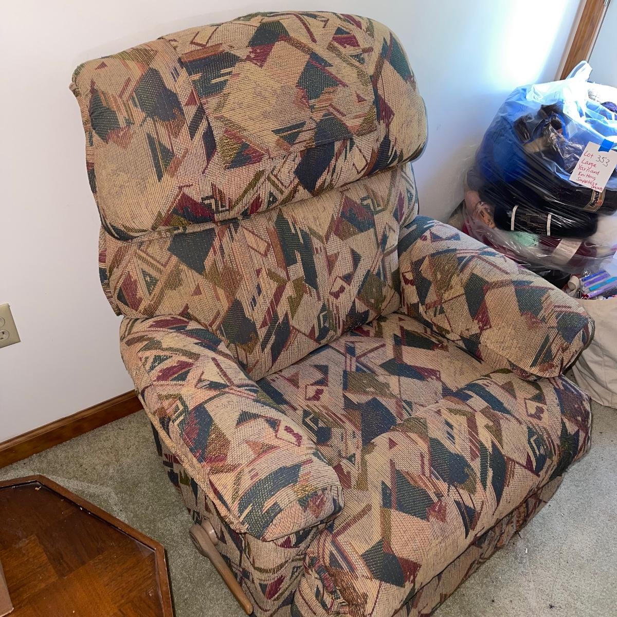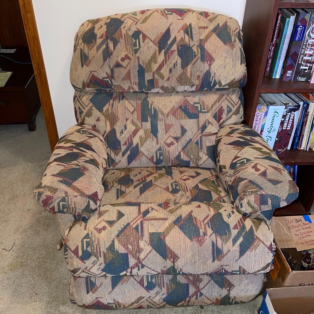 Kick back and relax with your favorite person in these matching La-Z-boy rocking recliners. Some of the fabric has some wear and tear from use but overall both have very minimal blemishes. They measure about 39” wide x 37” deep x 42” tall and when the foot rests are raised, they add an additional 17” to the depth. The upholstery has an abstract geometric pattern and has some texture to it. They are located up a set of stairs and will remain there for pick up, please keep that in mind. Both chairs rock and recline for the ideal comfort and relaxation experience.
