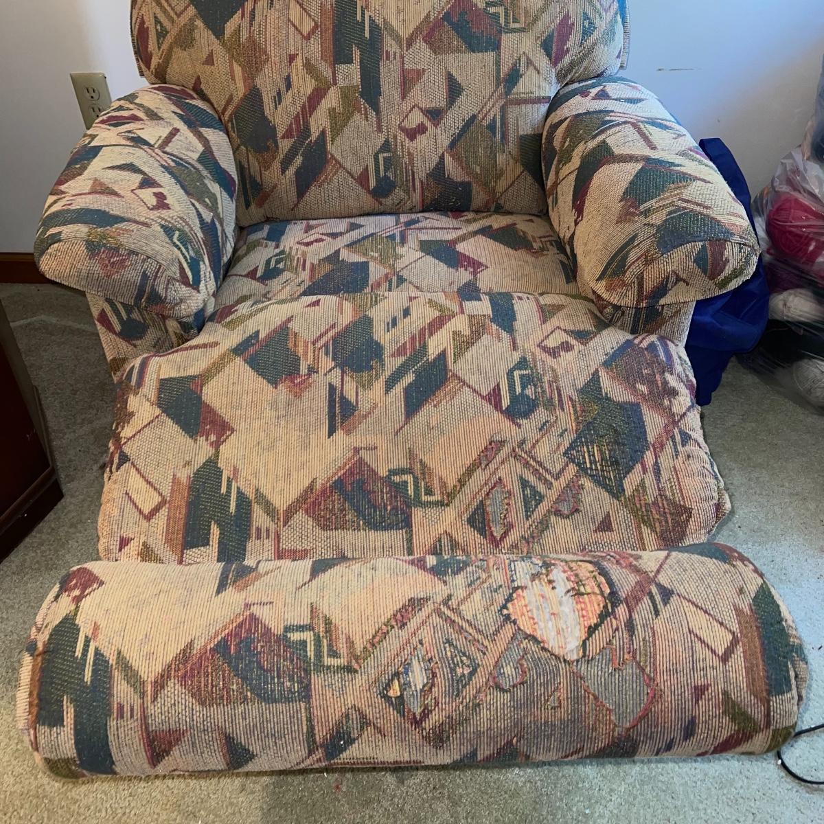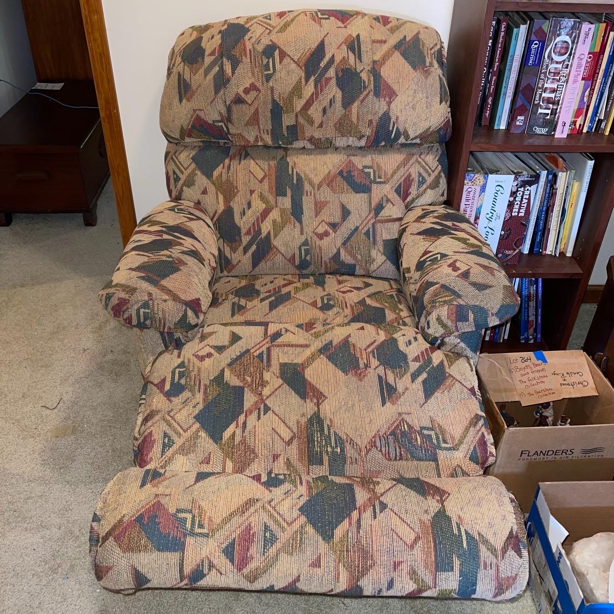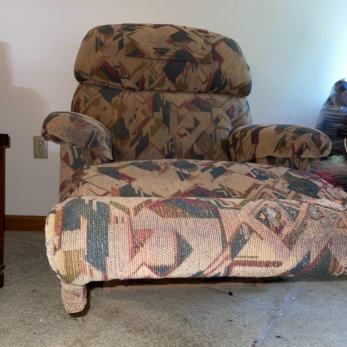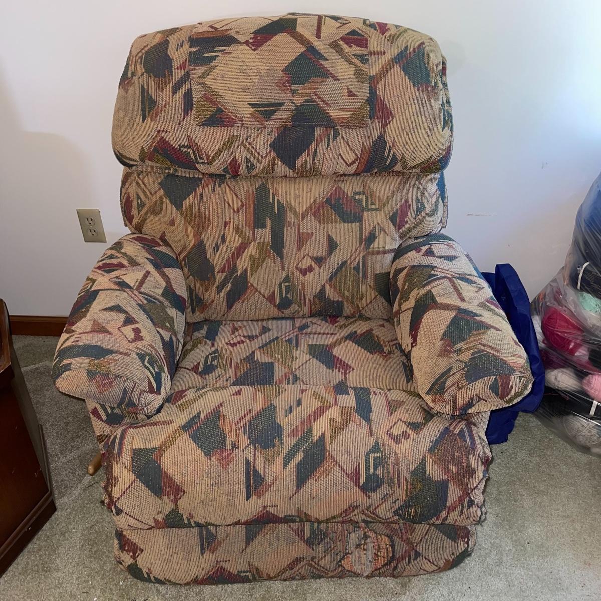 Kick back and relax with your favorite person in these matching La-Z-boy rocking recliners. Some of the fabric has some wear and tear from use but overall both have very minimal blemishes. They measure about 39” wide x 37” deep x 42” tall and when the foot rests are raised, they add an additional 17” to the depth. The upholstery has an abstract geometric pattern and has some texture to it. They are located up a set of stairs and will remain there for pick up, please keep that in mind. Both chairs rock and recline for the ideal comfort and relaxation experience.