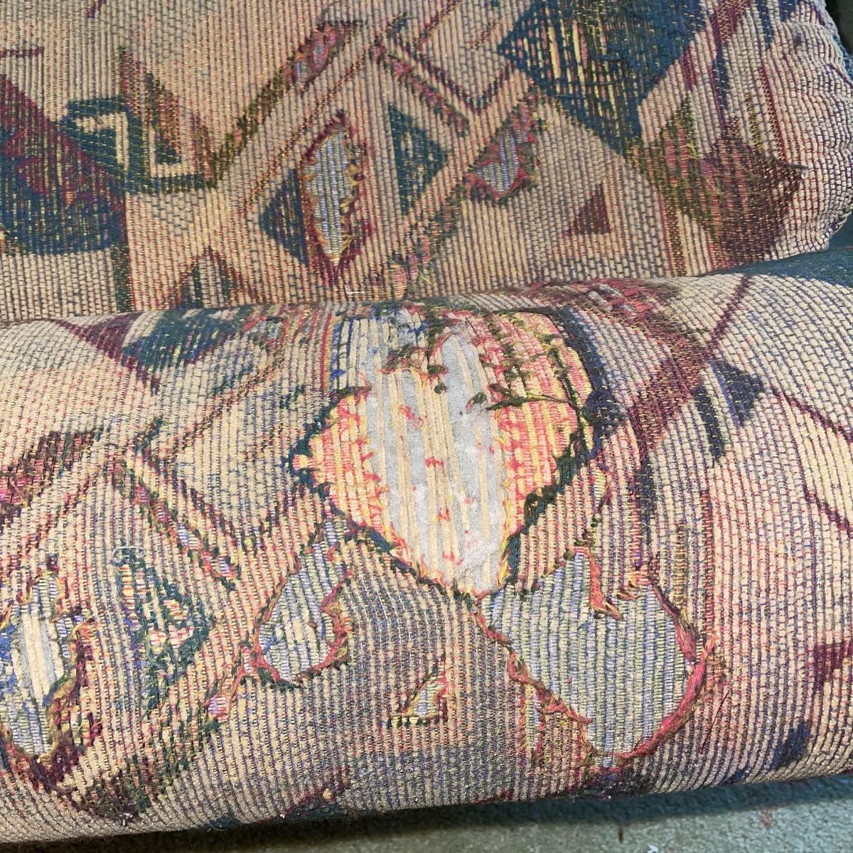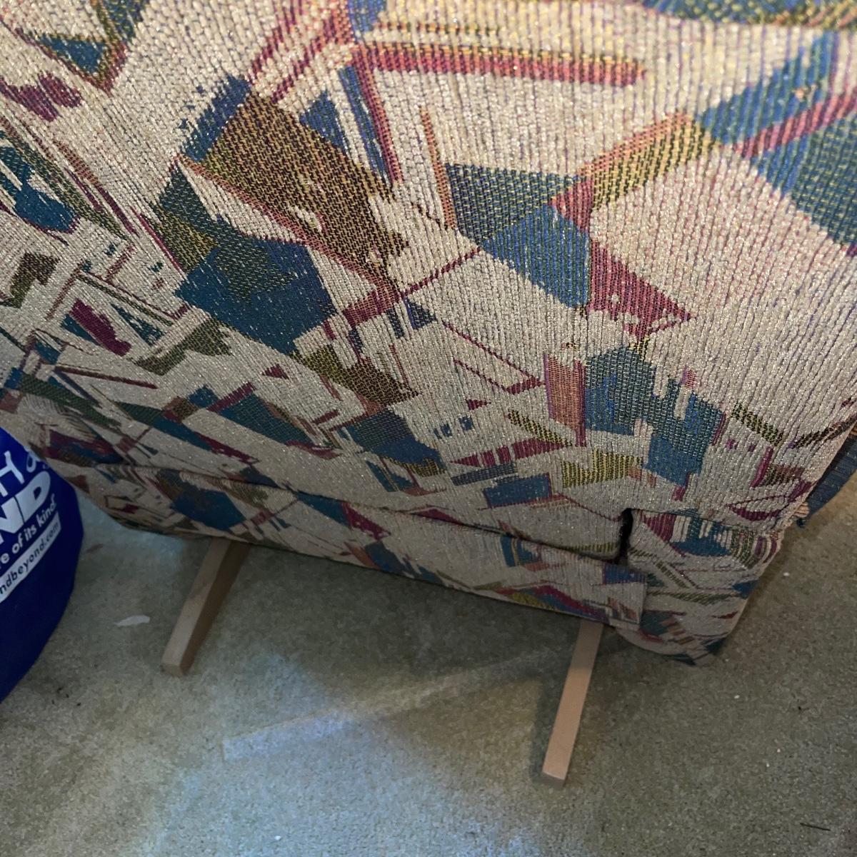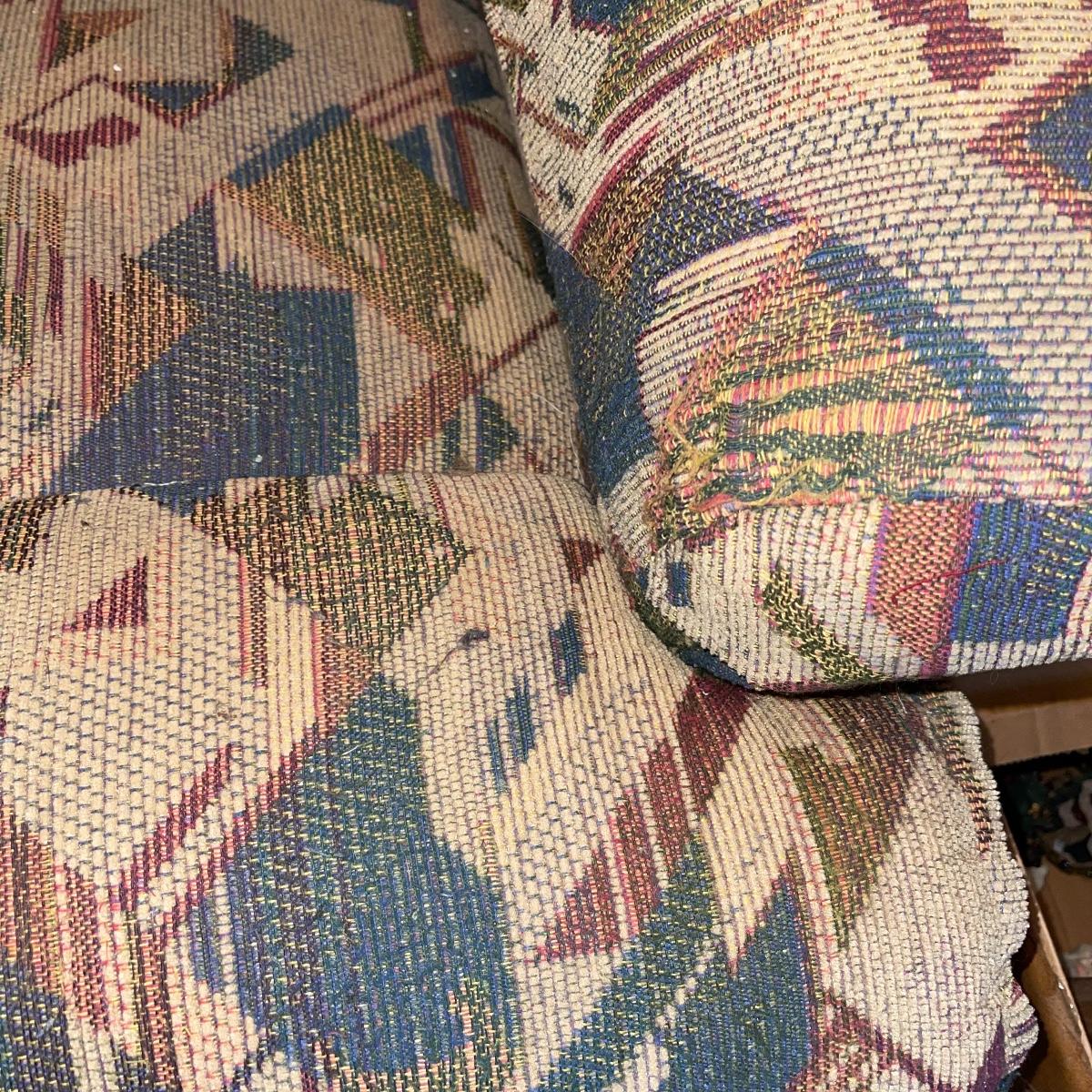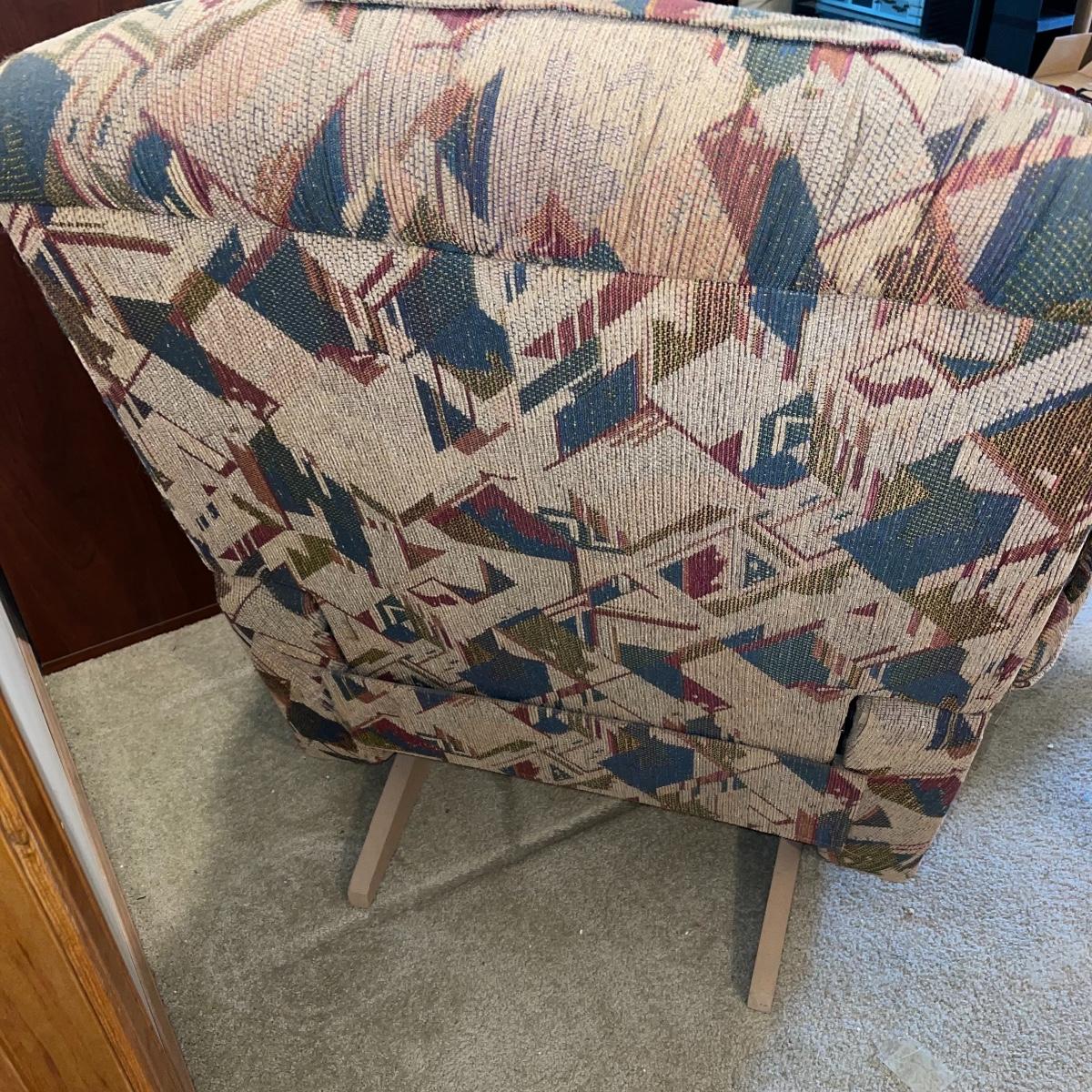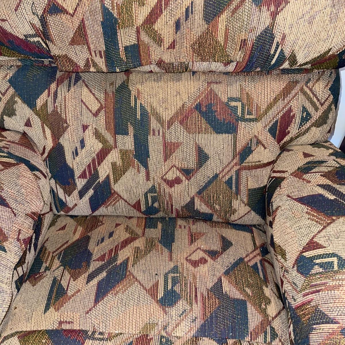 Kick back and relax with your favorite person in these matching La-Z-boy rocking recliners. Some of the fabric has some wear and tear from use but overall both have very minimal blemishes. They measure about 39” wide x 37” deep x 42” tall and when the foot rests are raised, they add an additional 17” to the depth. The upholstery has an abstract geometric pattern and has some texture to it. They are located up a set of stairs and will remain there for pick up, please keep that in mind. Both chairs rock and recline for the ideal comfort and relaxation experience.