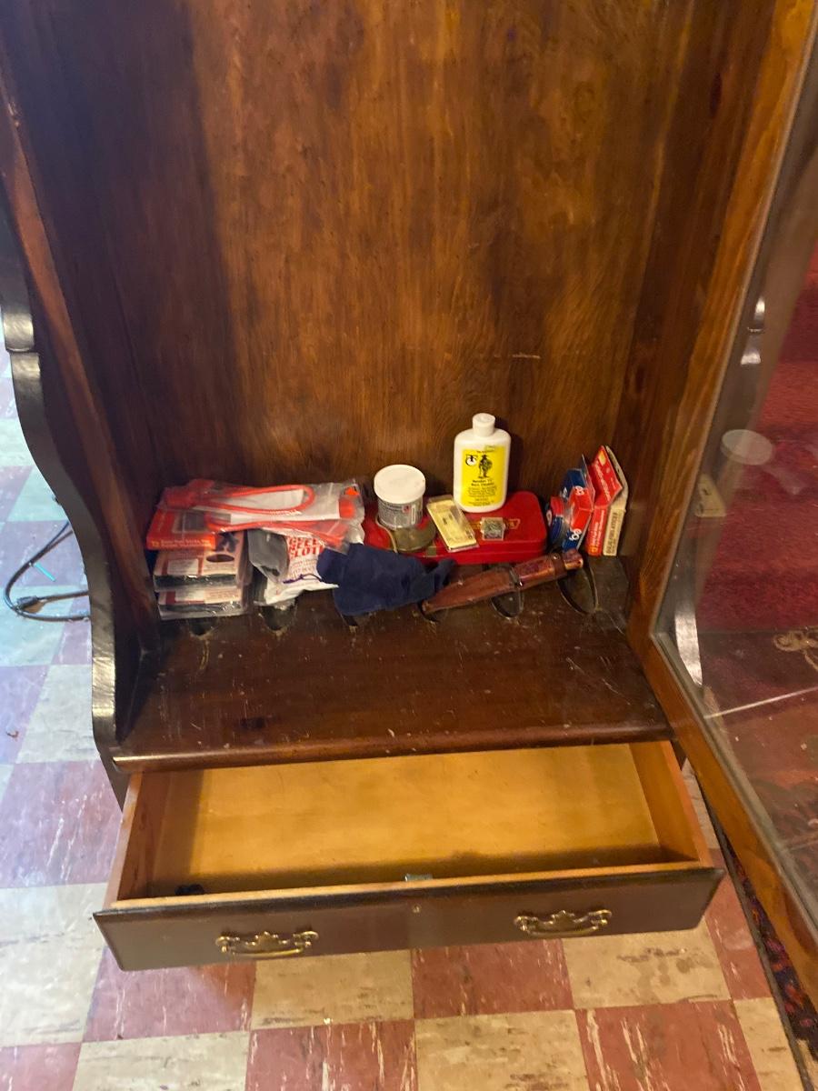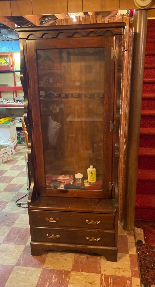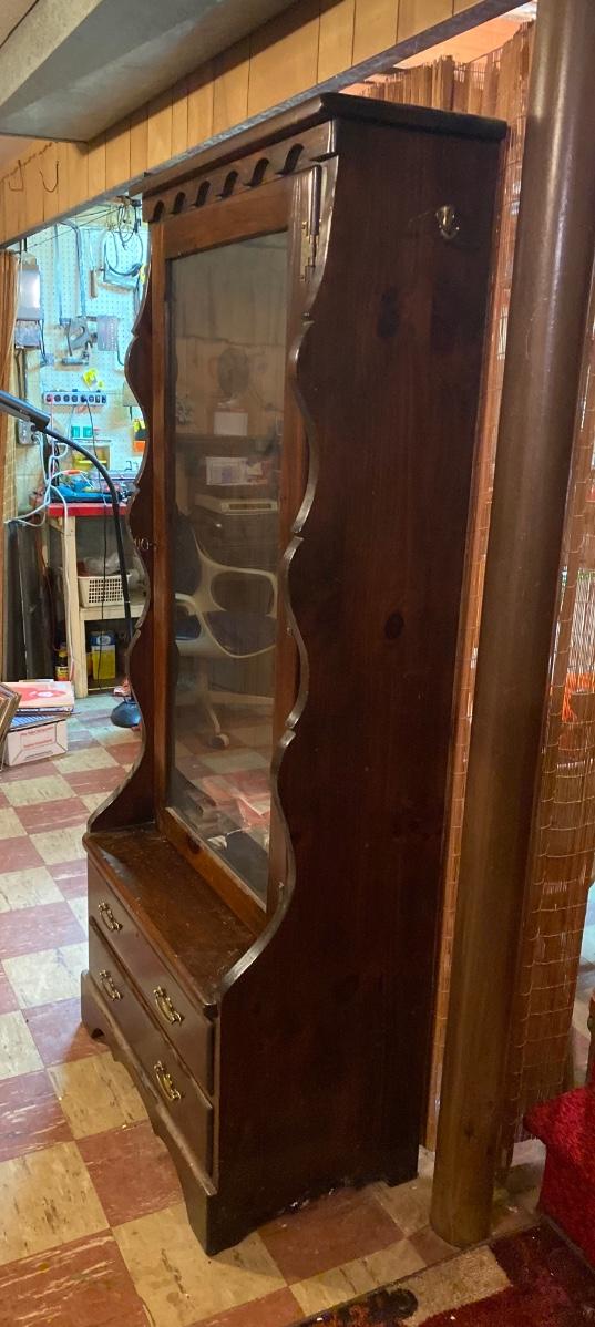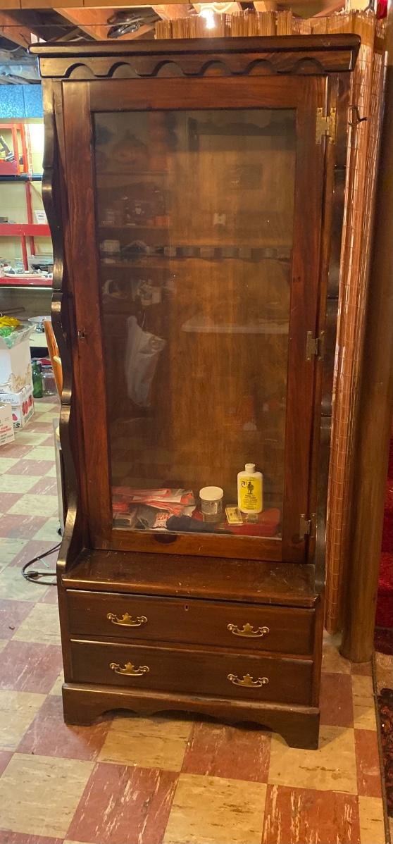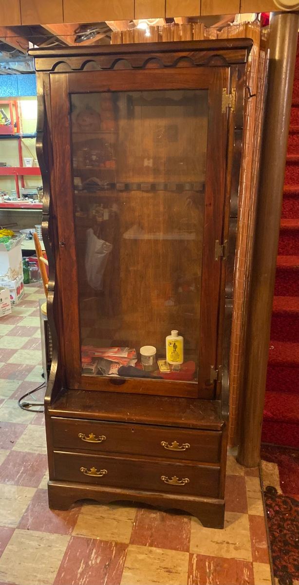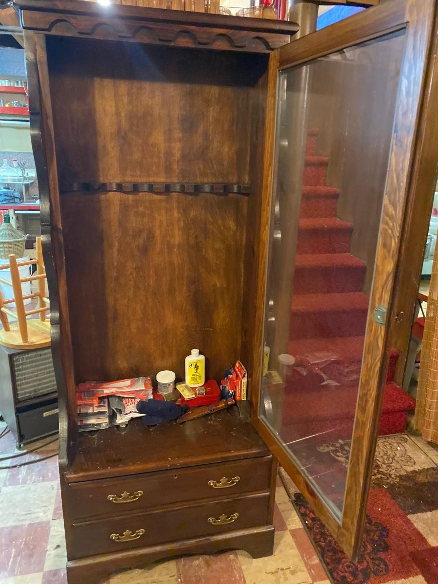Large wood gun case with glass front door. Lot includes contents inside case. Please see all pictures as they are the best representation of the items. The pictures show condition, measurements if taken, and what is included in the lot. Due to the large amount that we photograph and the time frame, we are not always able to take measurements. All items unless noted, are pre-owned and have been used. If you purchased furniture, you must bring help. We do not allow one person to carry large furniture out on their own. Bring help, tools and a truck for the safety of our client’s homes, and your personal safety. Any damages that result to the property including walls, and floors due to moving of the furniture will be charged to the buyer. Company policy. Thank you