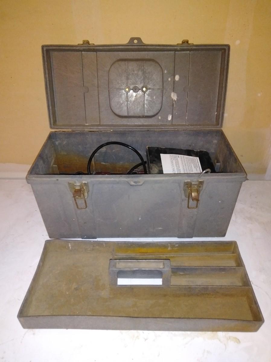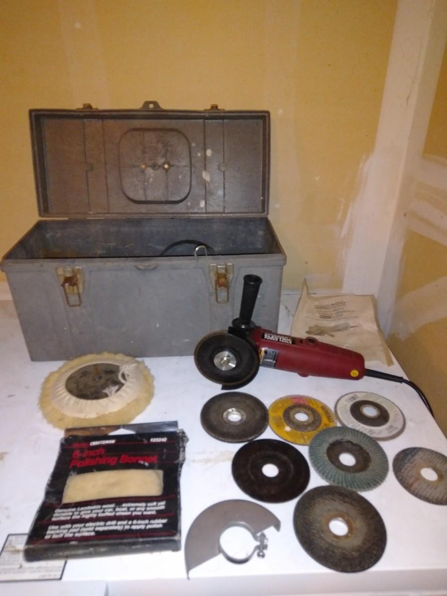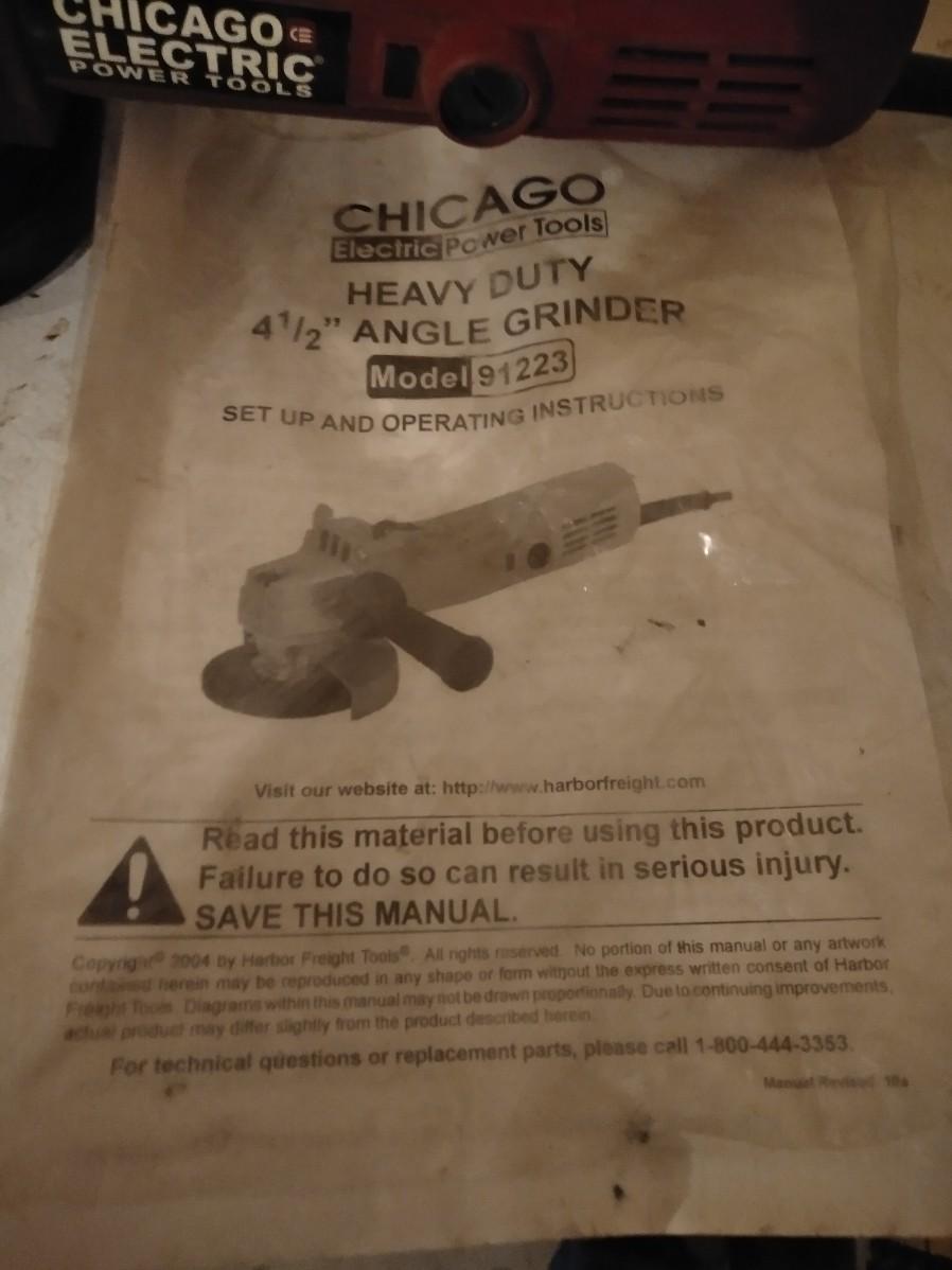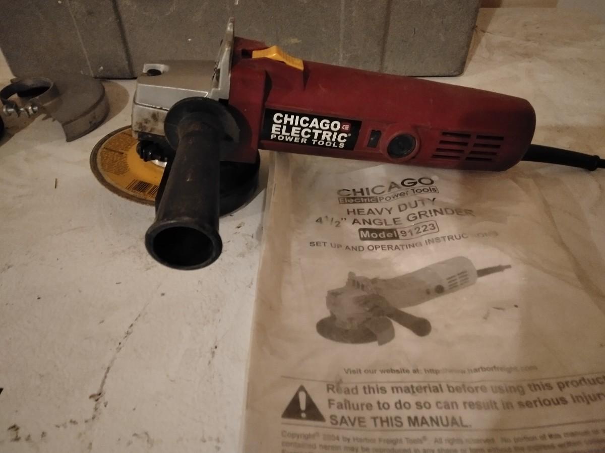 CHICAGO ELECTRIC HEAVY DUTY 4.5" ANGLE GRINDER MODEL NUMBER 91223 IN TOOLBOX WITH SOME EXTRAS.