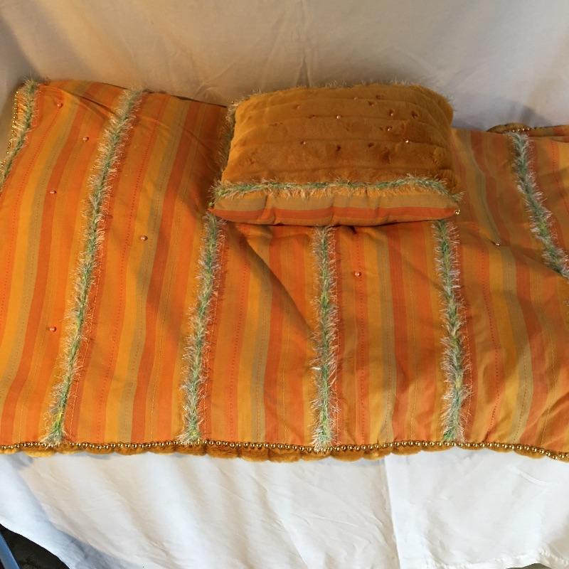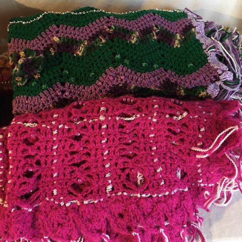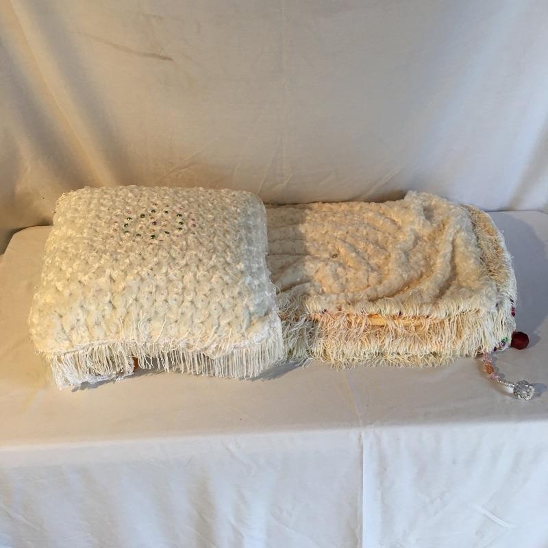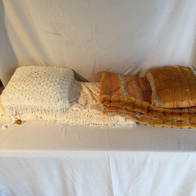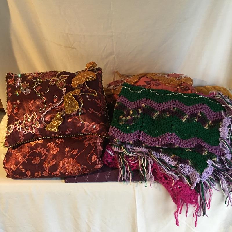 A lovely assortment of beaded pillows and beaded blankets with some crochet blankets. Bling up your home with these colorful blankets and pillows. Yellow and white blanket measures 54” x 70”.