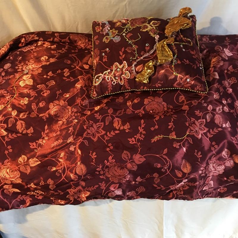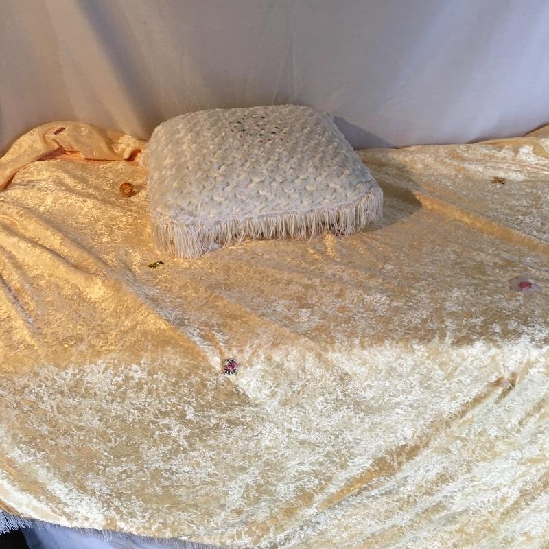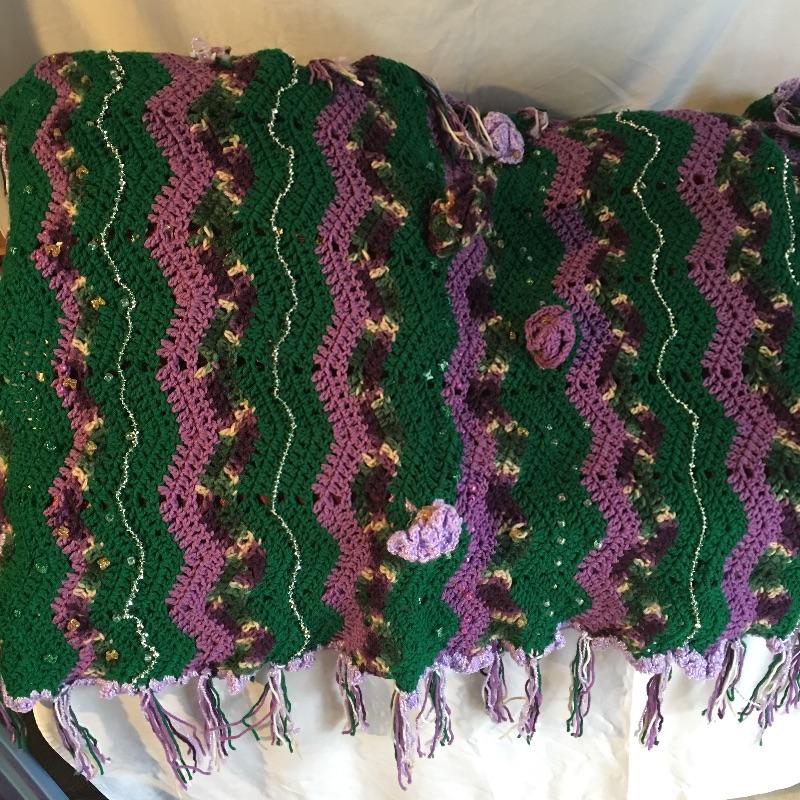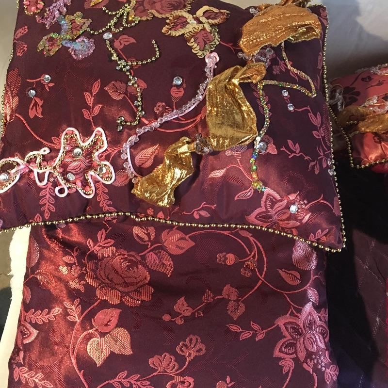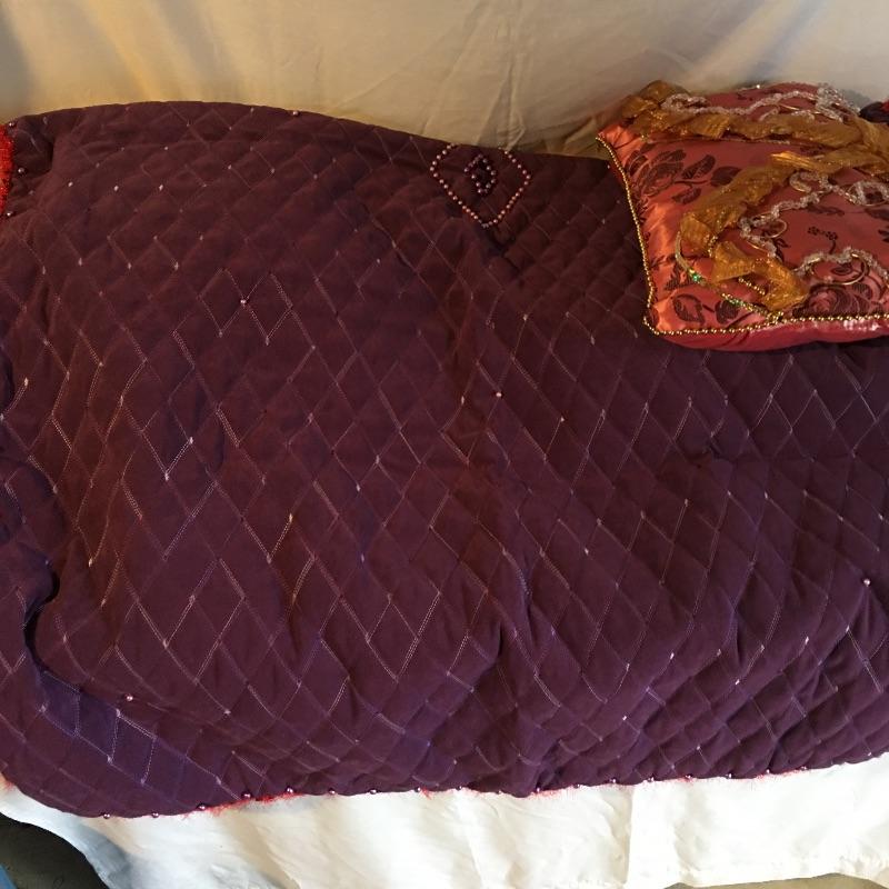 A lovely assortment of beaded pillows and beaded blankets with some crochet blankets. Bling up your home with these colorful blankets and pillows. Yellow and white blanket measures 54” x 70”.