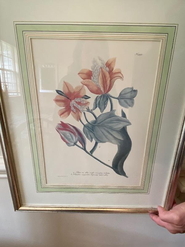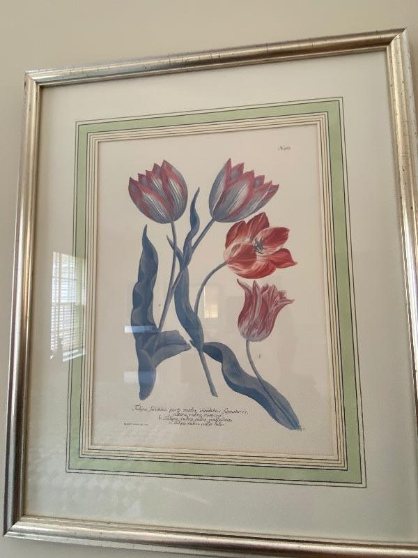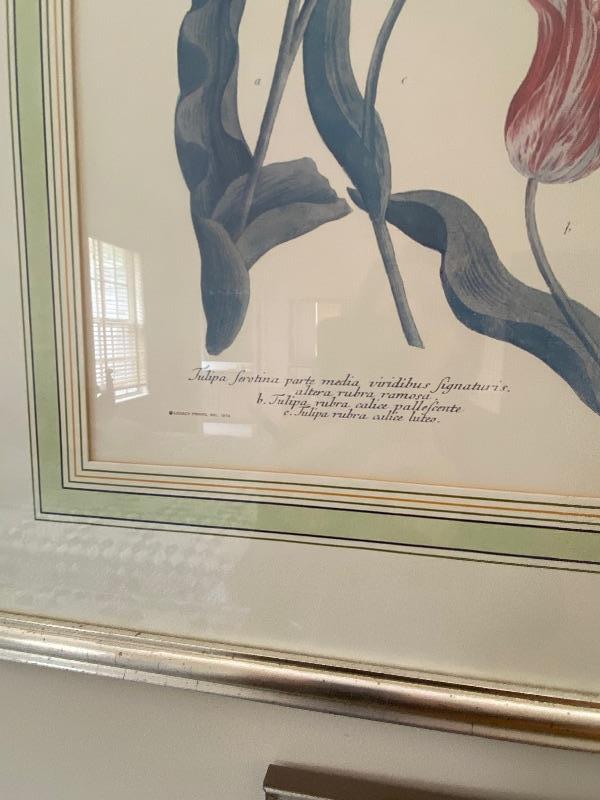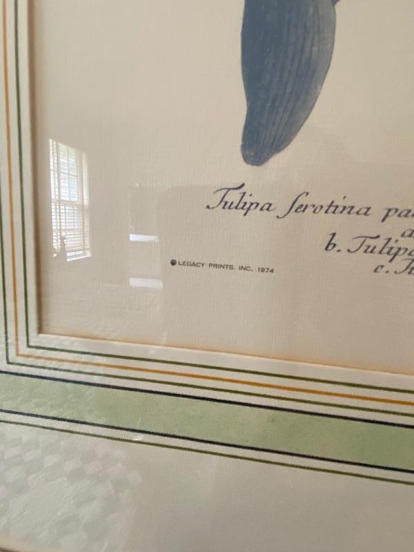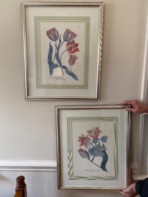 Pair of Chelsea house 1974 legacy prince of tulips measuring 19 and three-quarter inches wide by 23 and three-quarter inches tall