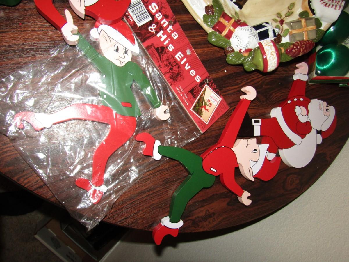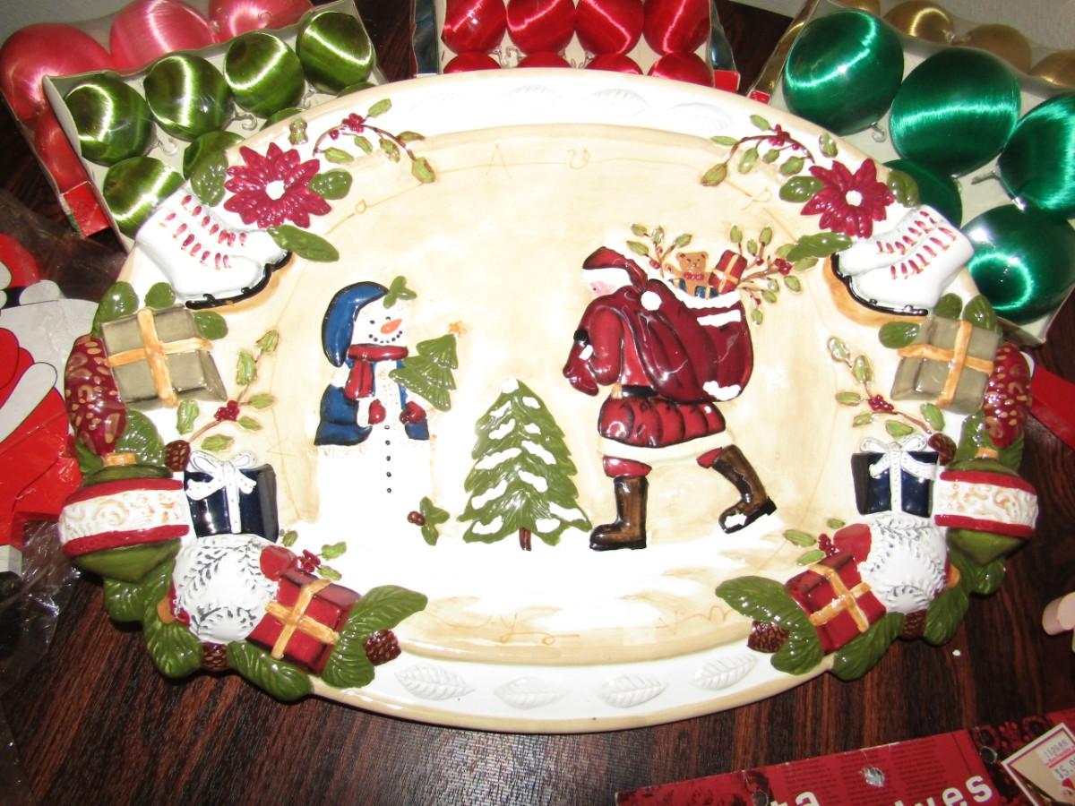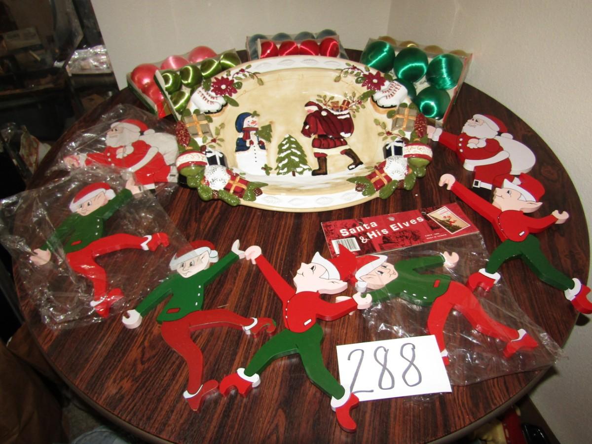 NEW PACKAGES OF SANTA & HIS ELVES, CHRISTMAS BULBS IN GREEN, RED, PINK, BLUE AND YELLOW. SERVING PLATTER