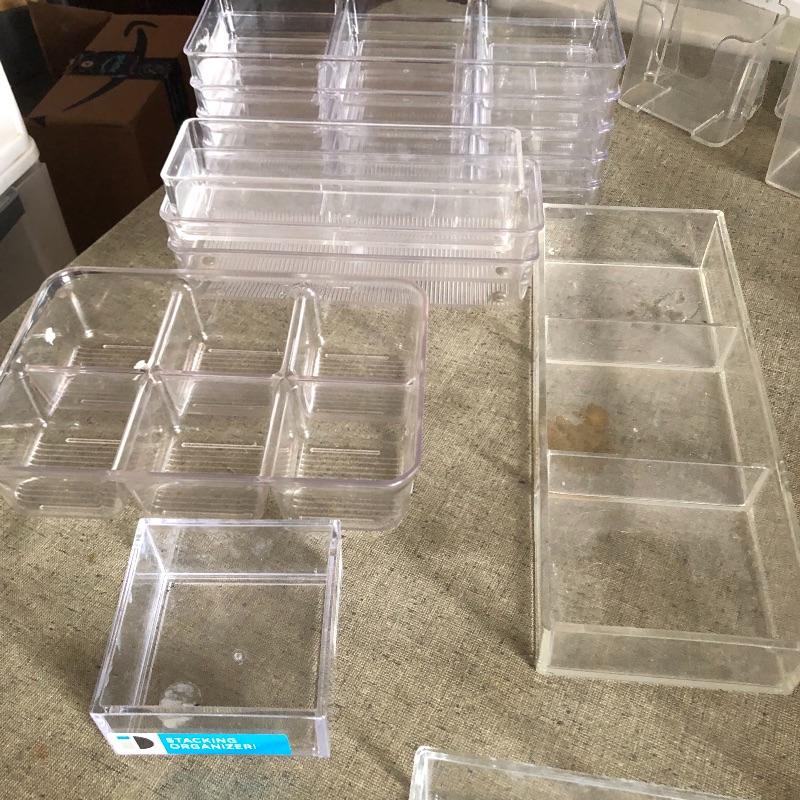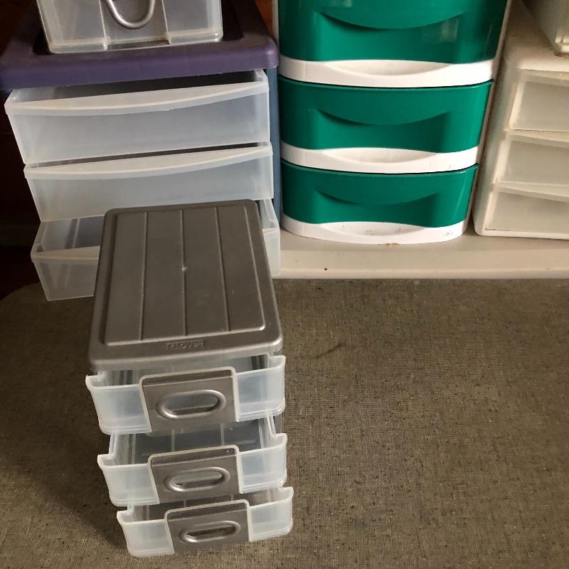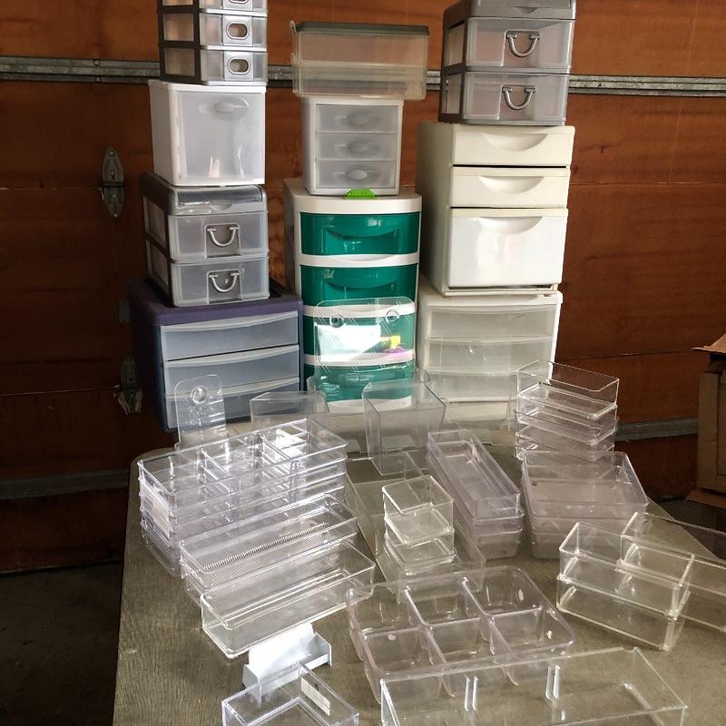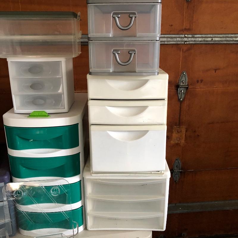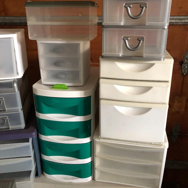 Get your drawers organized with this lot! This lot includes numerous plastic drawer containers, five brochure racks and nine containers with pull out drawers. The four drawer green container measures 10” x 14” x 17”. Local pick up only.