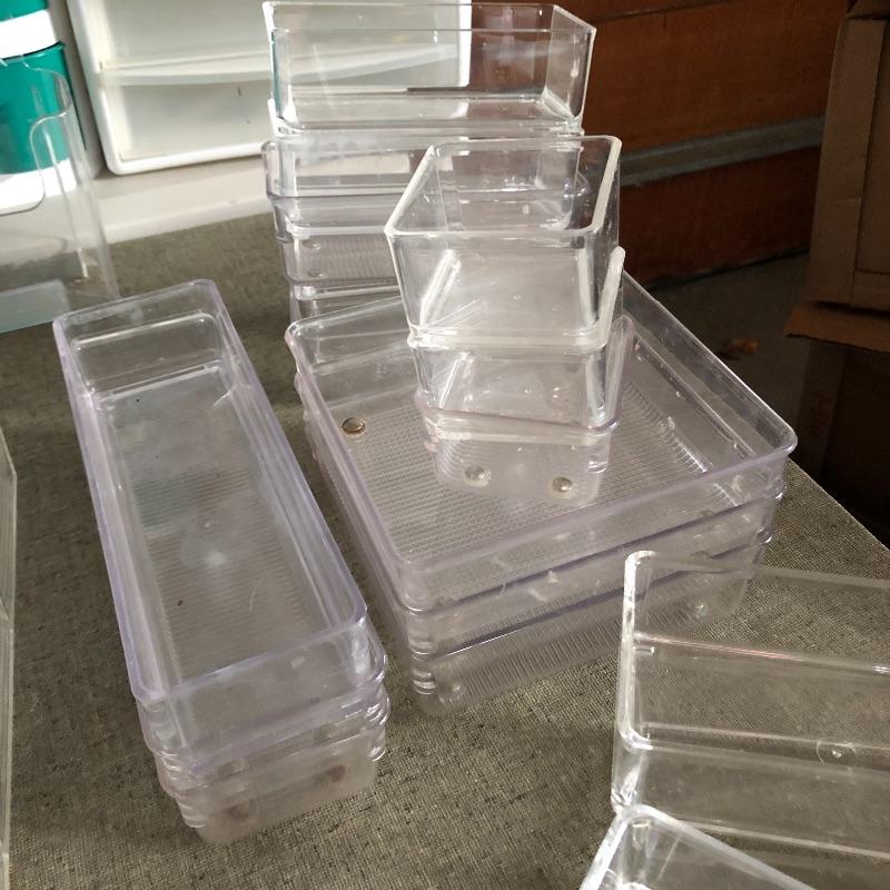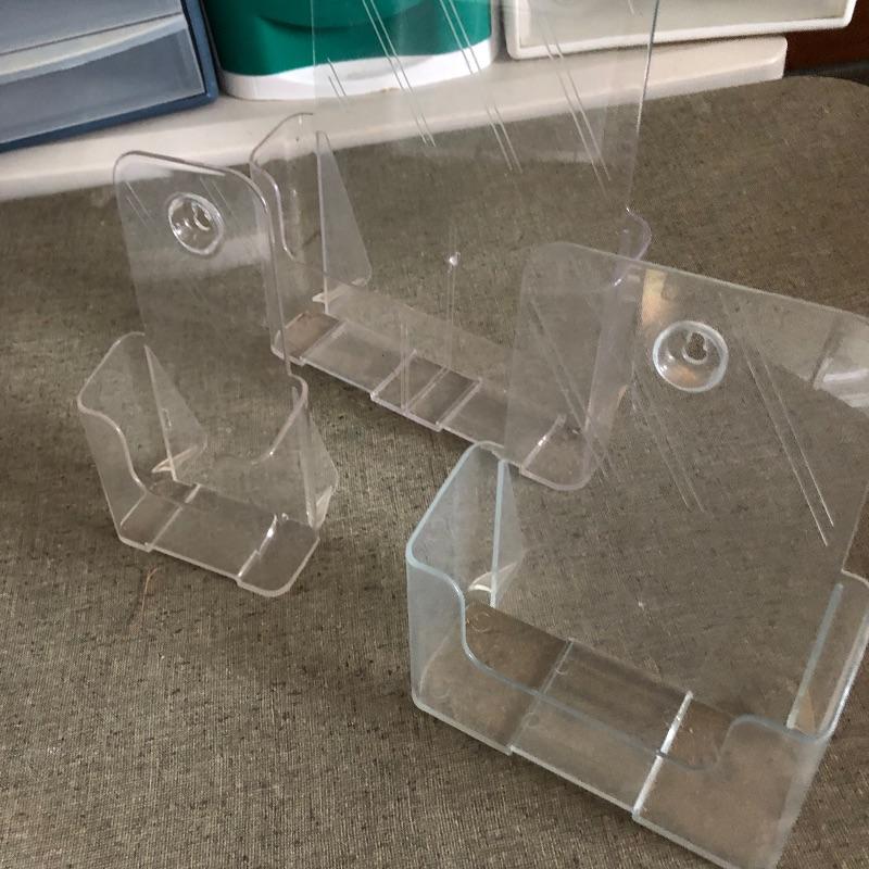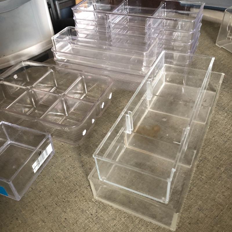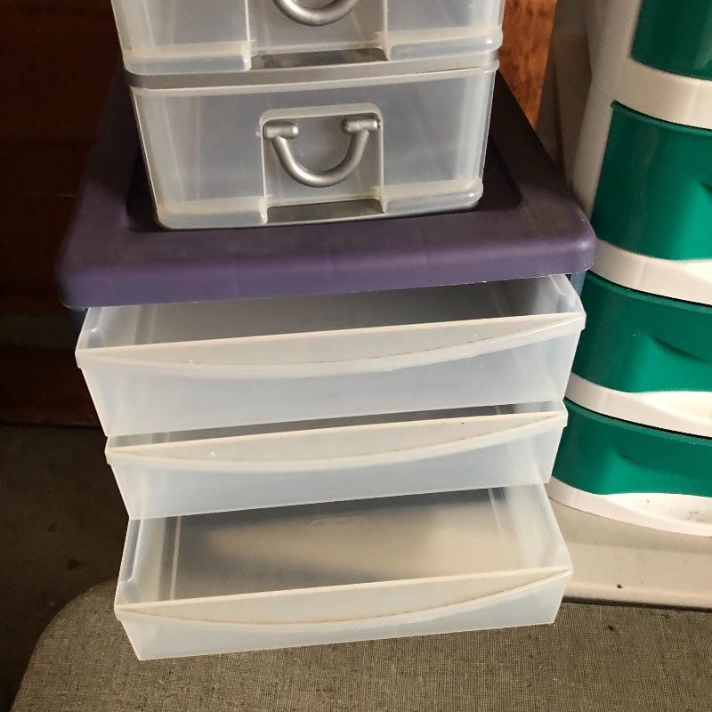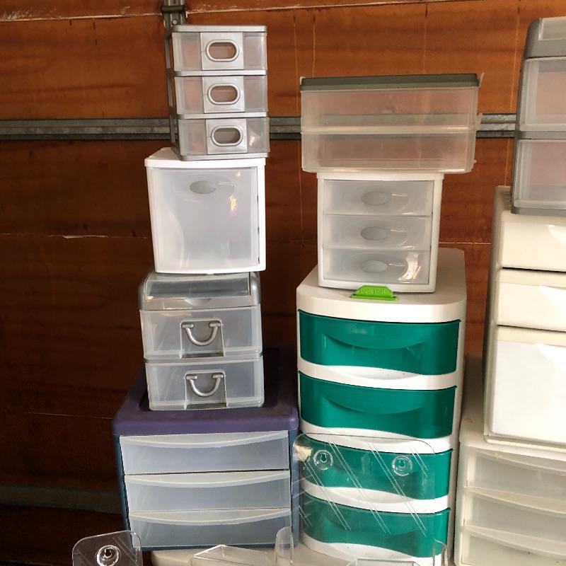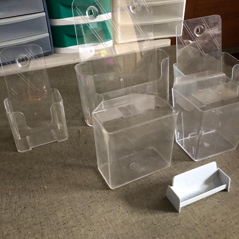 Get your drawers organized with this lot! This lot includes numerous plastic drawer containers, five brochure racks and nine containers with pull out drawers. The four drawer green container measures 10” x 14” x 17”. Local pick up only.
