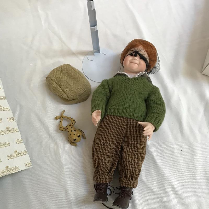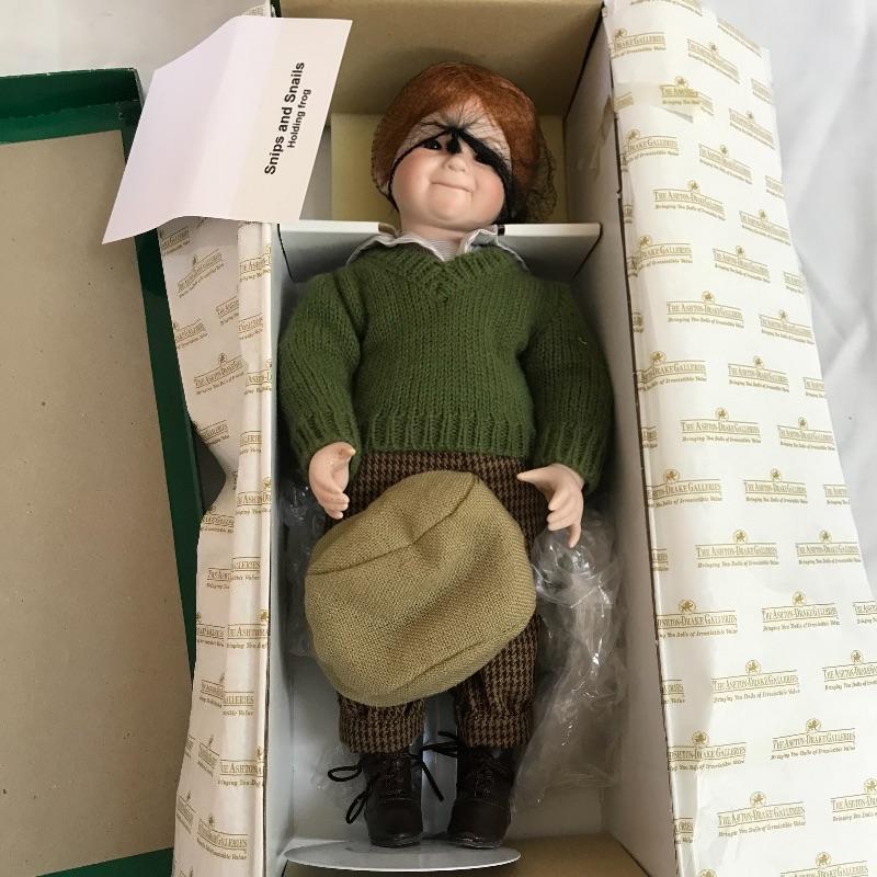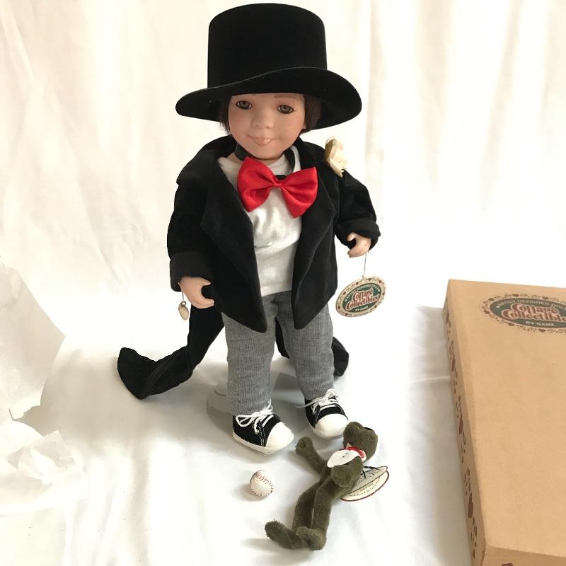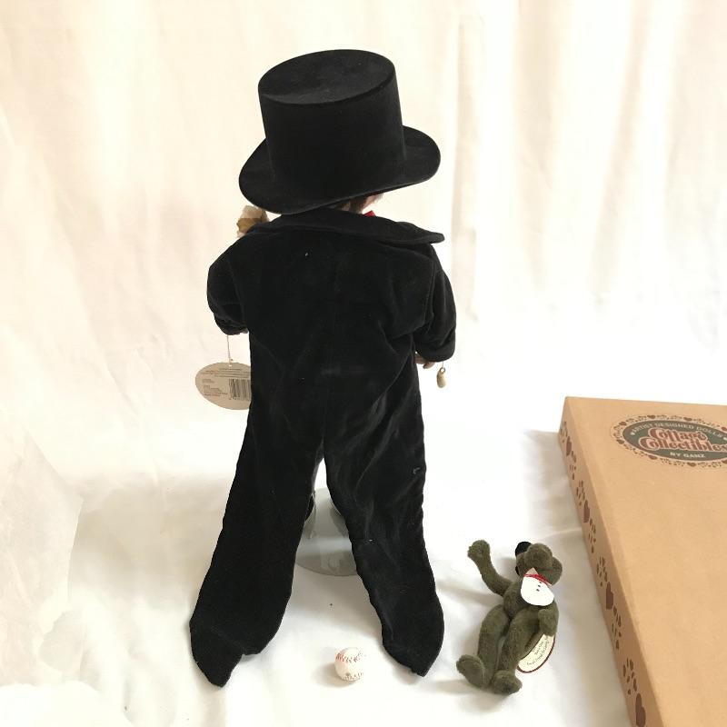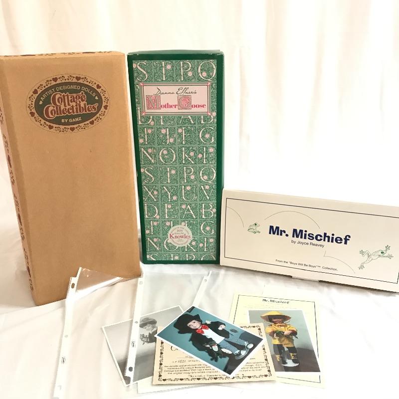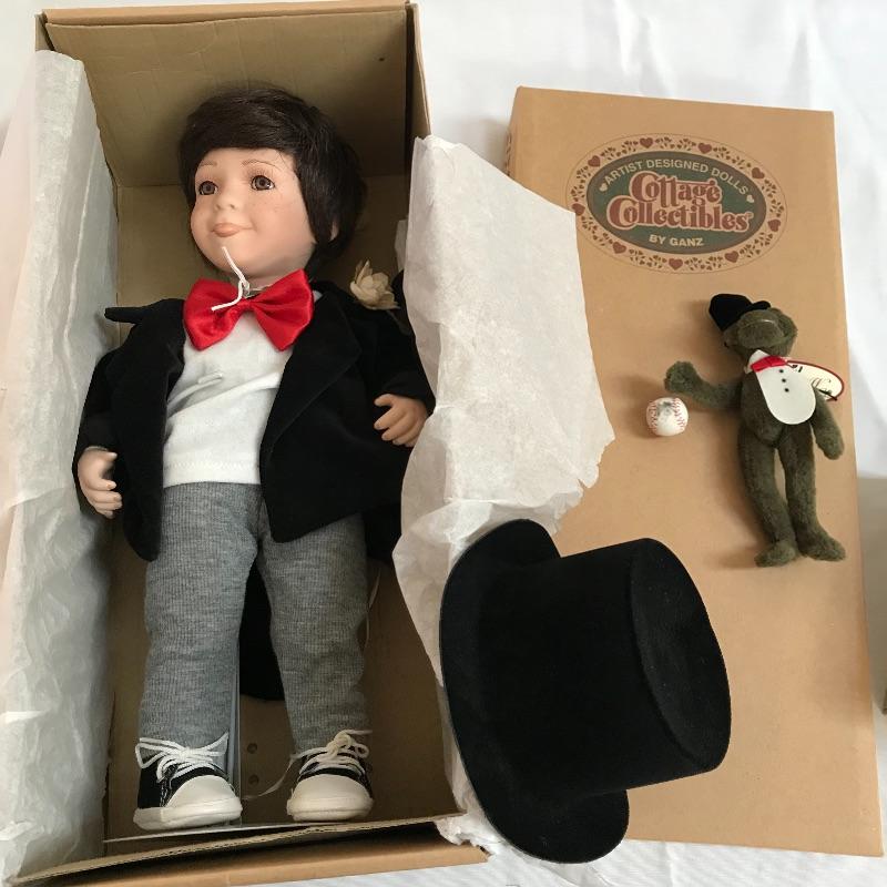 Little “Scooter” with a man’s tuxedo coat, bow tie and top hat. He has a scuffed baseball and dapper frog. “Scooter” doesn’t appear to have any markings on his neck or head, but he comes with a certificate and stand. The next mischievous grin comes from “Snips and Snails” from Dianna Effner’s Mother Goose collection. He’s complete with dirt painted on his hands, frog, stand, hat and certificate. Lastly, Mr. Mischievous himself! From the Georgetown collection “Boys will be Boys” by Joyce Reavey. He appears to have not been displayed. See photos. Shipping available.