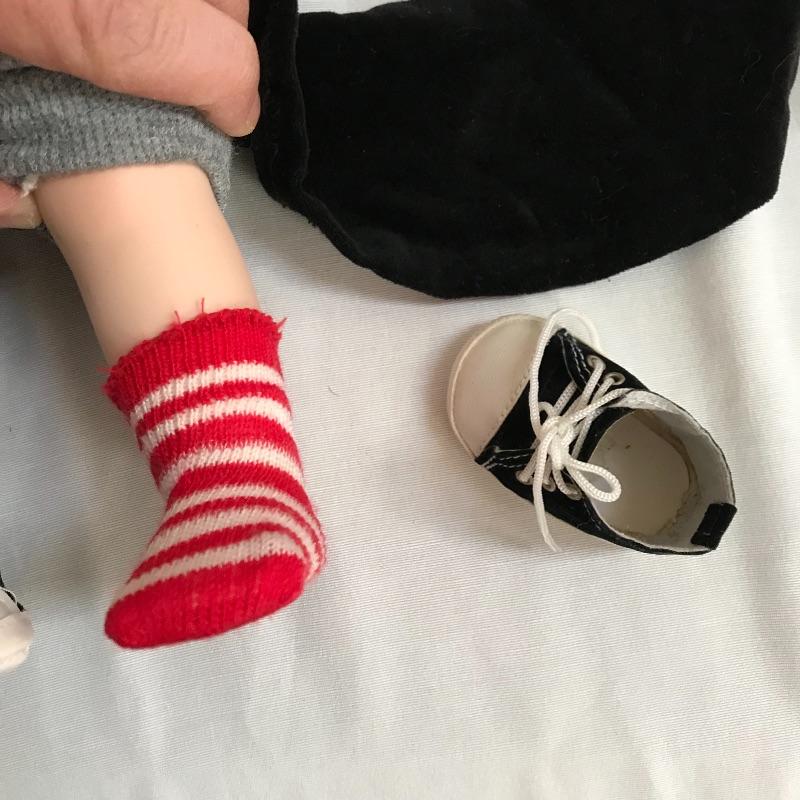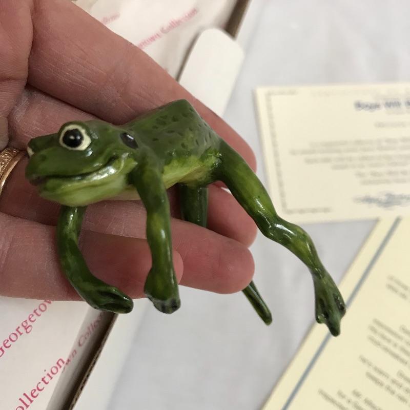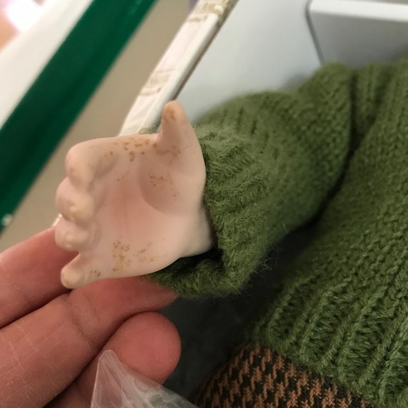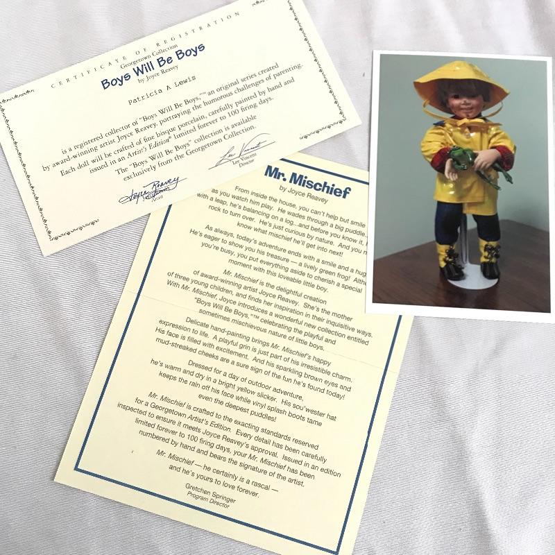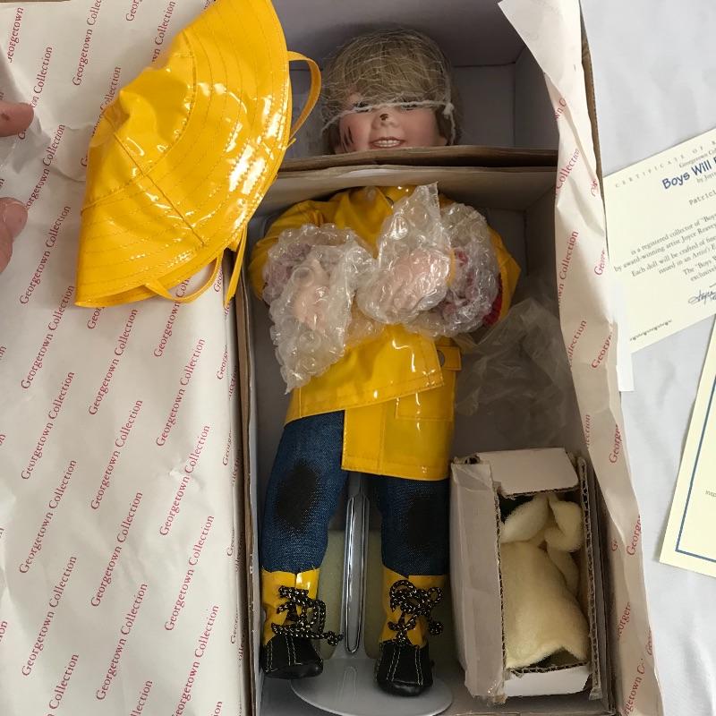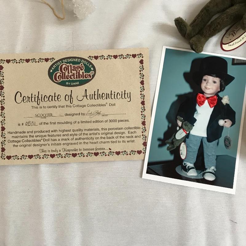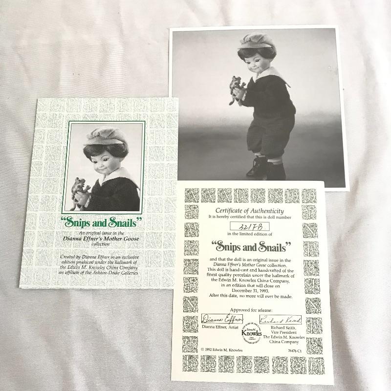 Little “Scooter” with a man’s tuxedo coat, bow tie and top hat. He has a scuffed baseball and dapper frog. “Scooter” doesn’t appear to have any markings on his neck or head, but he comes with a certificate and stand. The next mischievous grin comes from “Snips and Snails” from Dianna Effner’s Mother Goose collection. He’s complete with dirt painted on his hands, frog, stand, hat and certificate. Lastly, Mr. Mischievous himself! From the Georgetown collection “Boys will be Boys” by Joyce Reavey. He appears to have not been displayed. See photos. Shipping available.