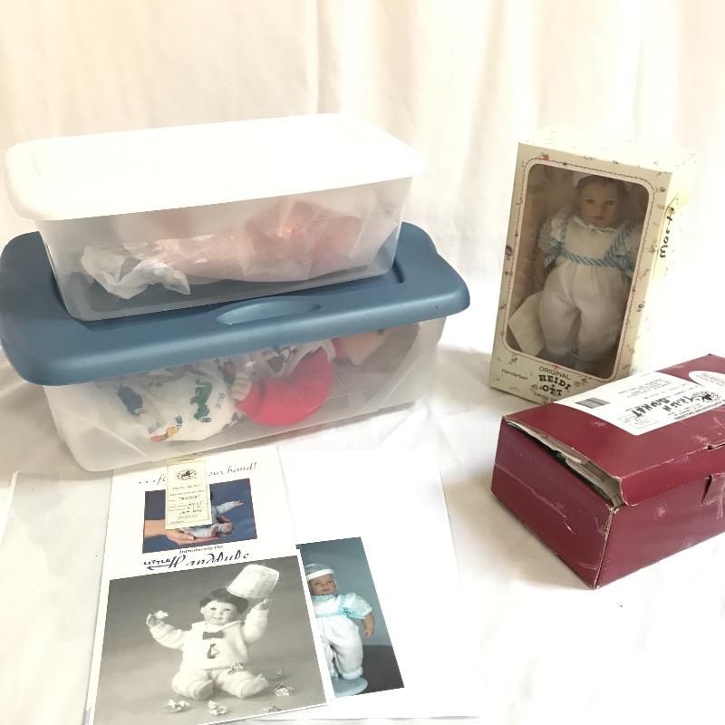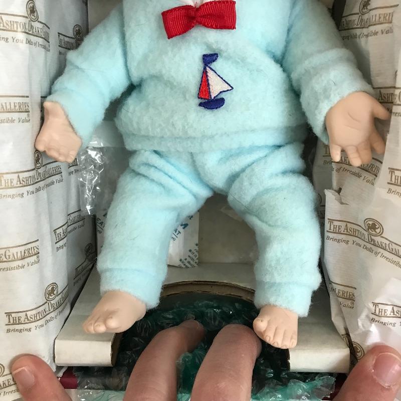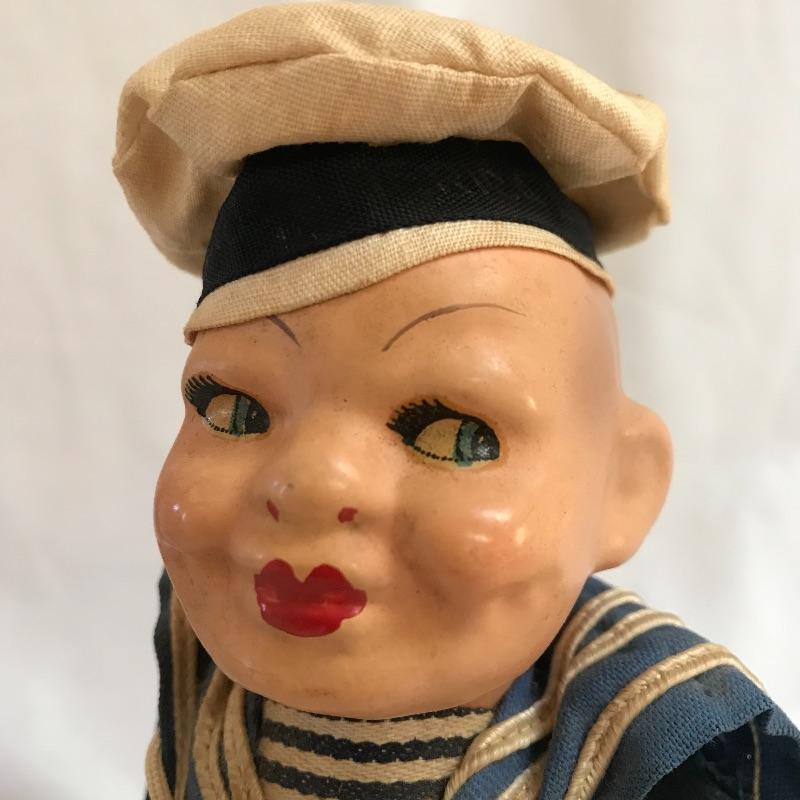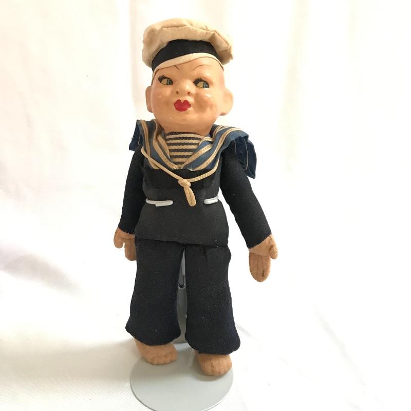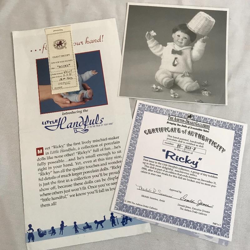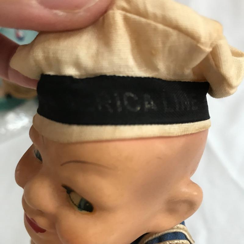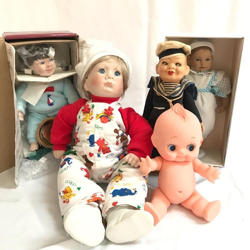 Fun and eclectic mix here! First photographed is a doll the previous owner called “Pouting Boy” marked “Hard Lessons, Lillian 1996” with a removable hat, glass eyes, porcelain head and hands and cloth elsewhere. Next doll in photos is apparently a Heidi Ott original that the previous owner named “Martin”. He appears to have plastic head, arms, legs, hands and feet. Body seems to be cloth without any ball-joints. Hair and eyes are painted perfectly! Doll is tied in box and comes complete with stand. The next doll in line appears to be a Norah Wellings 1930’s Holland America Line sailor. “Holland America Line” can be faintly seen on his hat. Sailor is 9.25” with a hard, possibly hollow head and cloth body tall and comes with stand in photos. Following Norah Wellings is an eight inch plastic Rose O’Neill Kewpie doll. No manufacturers marking was located. Kewpie’s arms and legs rotate. We finish our collection off with a certified “Ricky” with perfect trash papers. “Ricky” apparently has hard head, hands and feet with a soft body still tied into his box. See photos. Shipping available.
