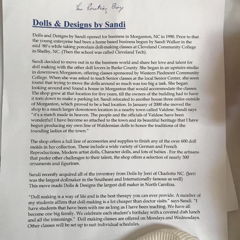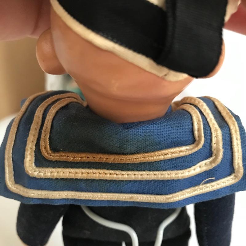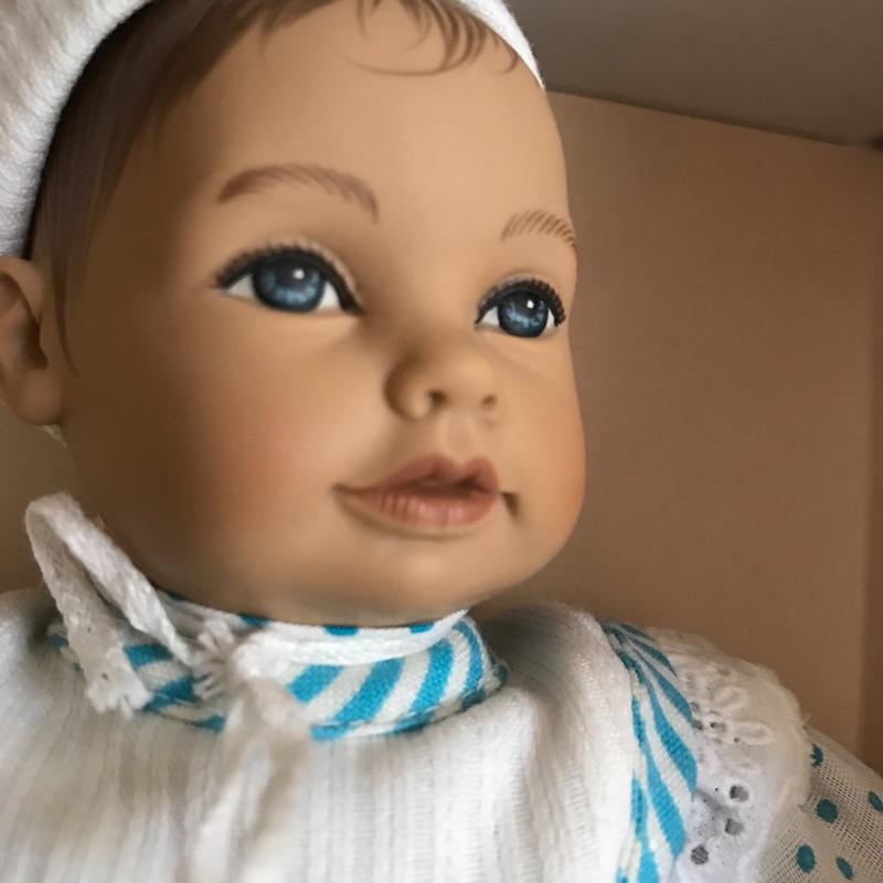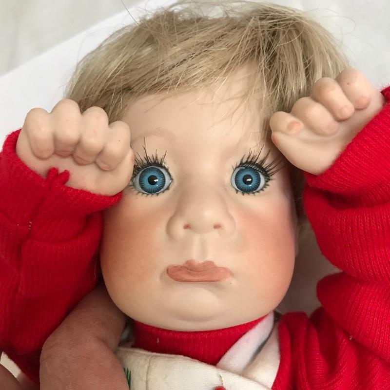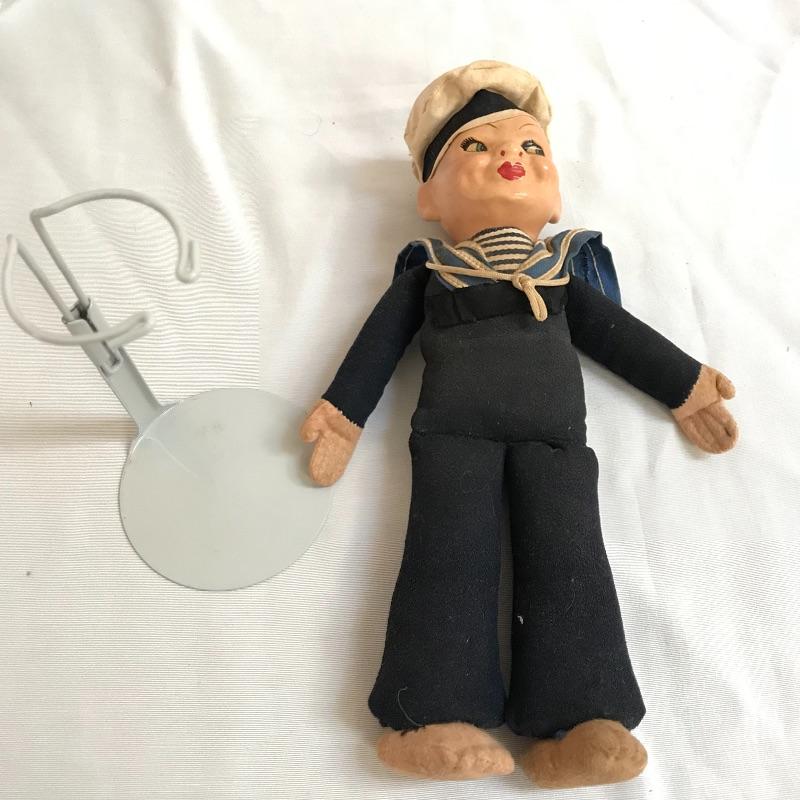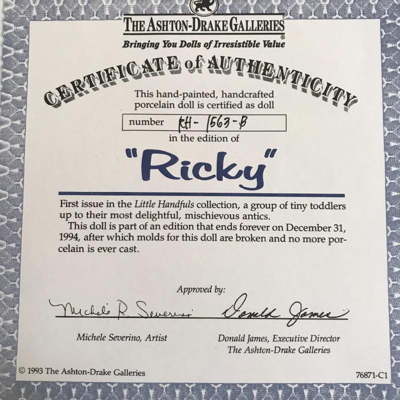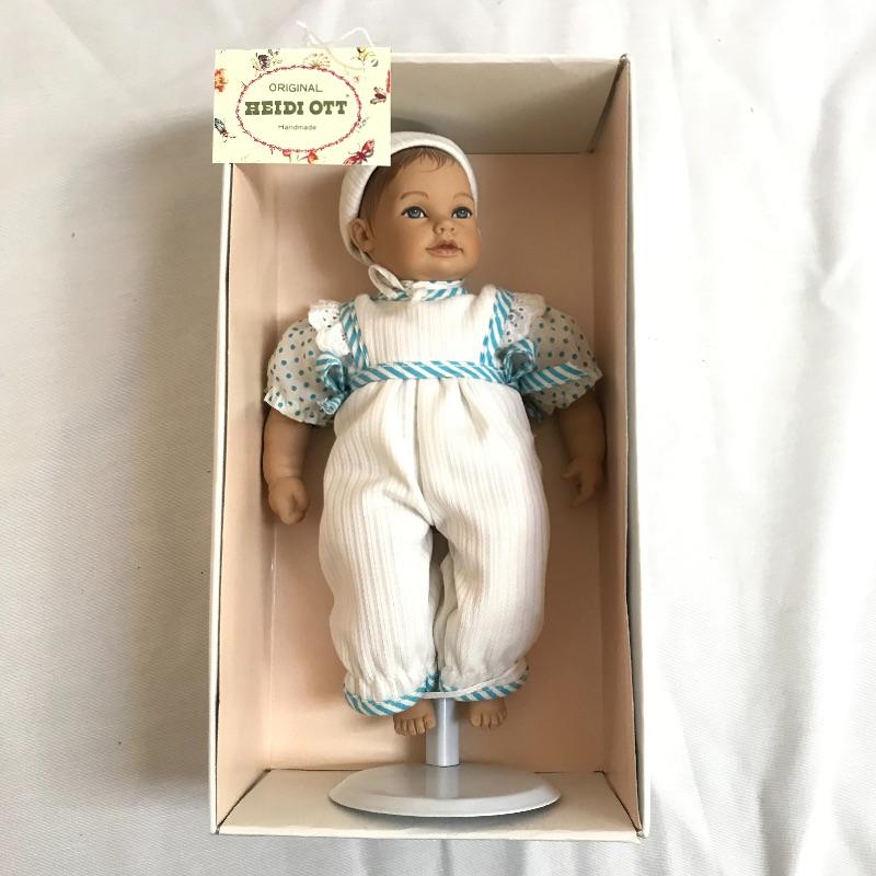 Fun and eclectic mix here! First photographed is a doll the previous owner called “Pouting Boy” marked “Hard Lessons, Lillian 1996” with a removable hat, glass eyes, porcelain head and hands and cloth elsewhere. Next doll in photos is apparently a Heidi Ott original that the previous owner named “Martin”. He appears to have plastic head, arms, legs, hands and feet. Body seems to be cloth without any ball-joints. Hair and eyes are painted perfectly! Doll is tied in box and comes complete with stand. The next doll in line appears to be a Norah Wellings 1930’s Holland America Line sailor. “Holland America Line” can be faintly seen on his hat. Sailor is 9.25” with a hard, possibly hollow head and cloth body tall and comes with stand in photos. Following Norah Wellings is an eight inch plastic Rose O’Neill Kewpie doll. No manufacturers marking was located. Kewpie’s arms and legs rotate. We finish our collection off with a certified “Ricky” with perfect trash papers. “Ricky” apparently has hard head, hands and feet with a soft body still tied into his box. See photos. Shipping available.