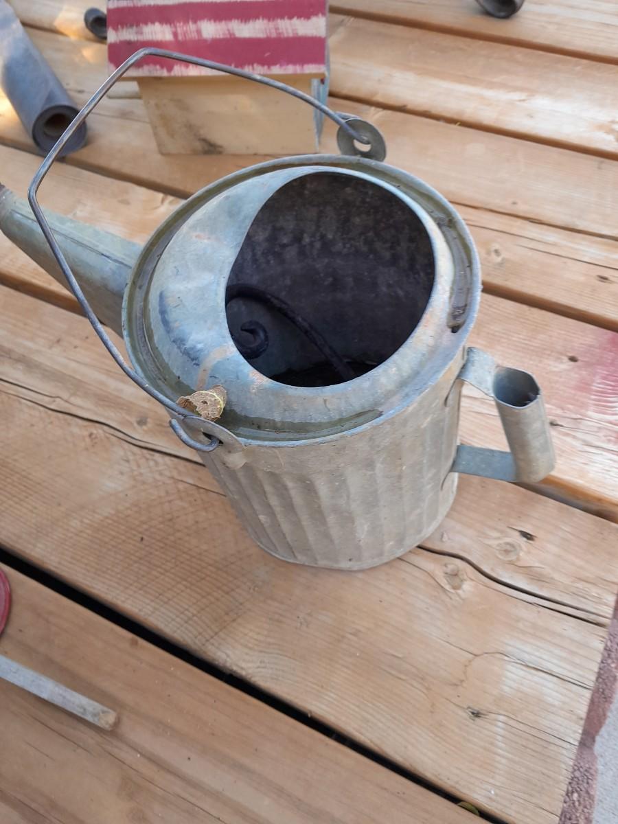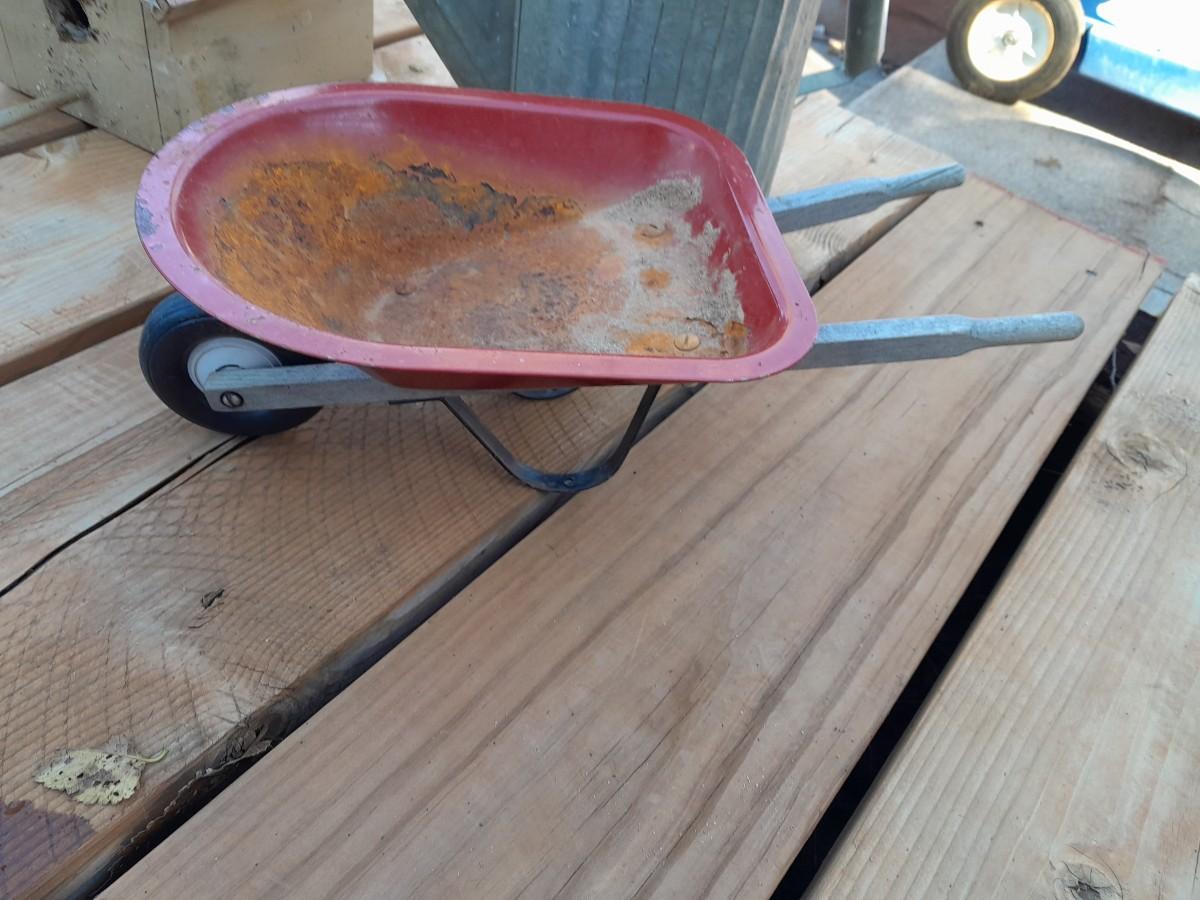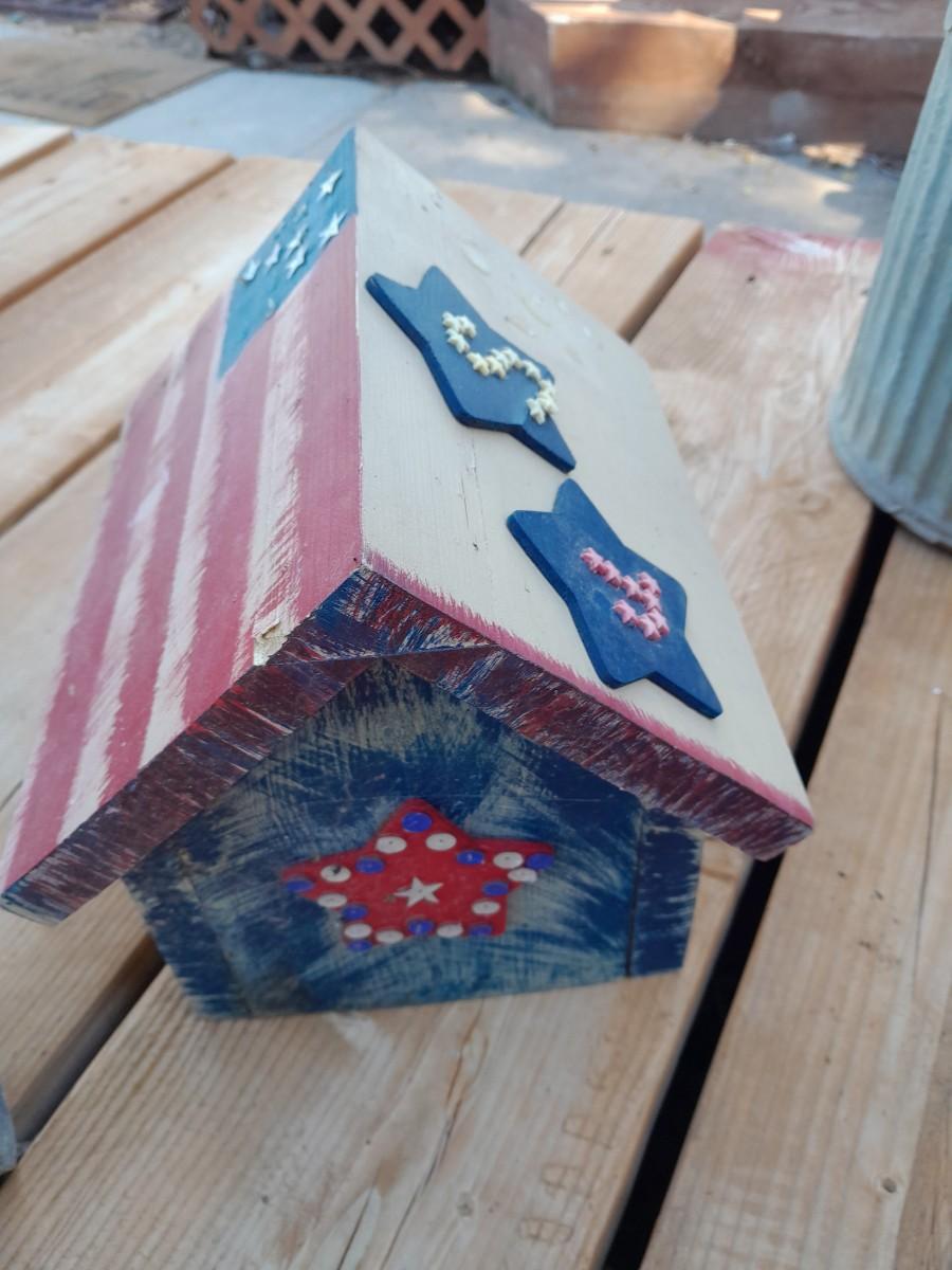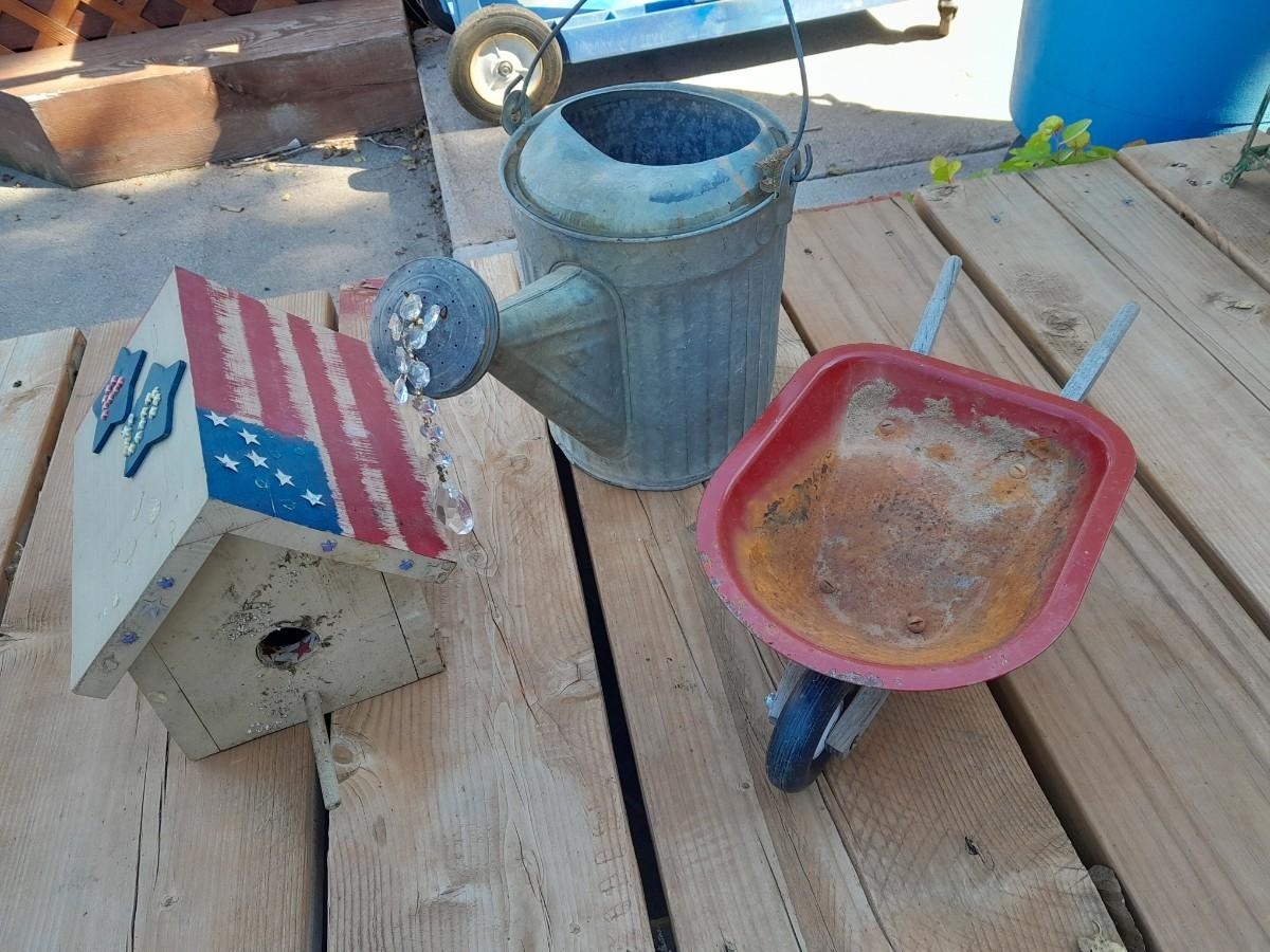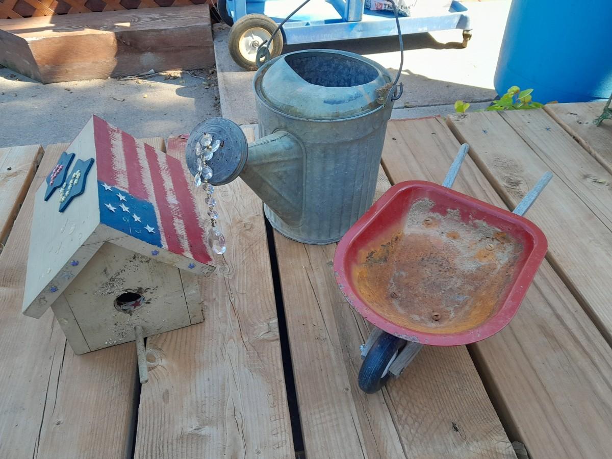 PATRIOTIC BIRD HOUSE, MINIATURE WHEELBARROW AND GALVENIZED WATERING CAN
