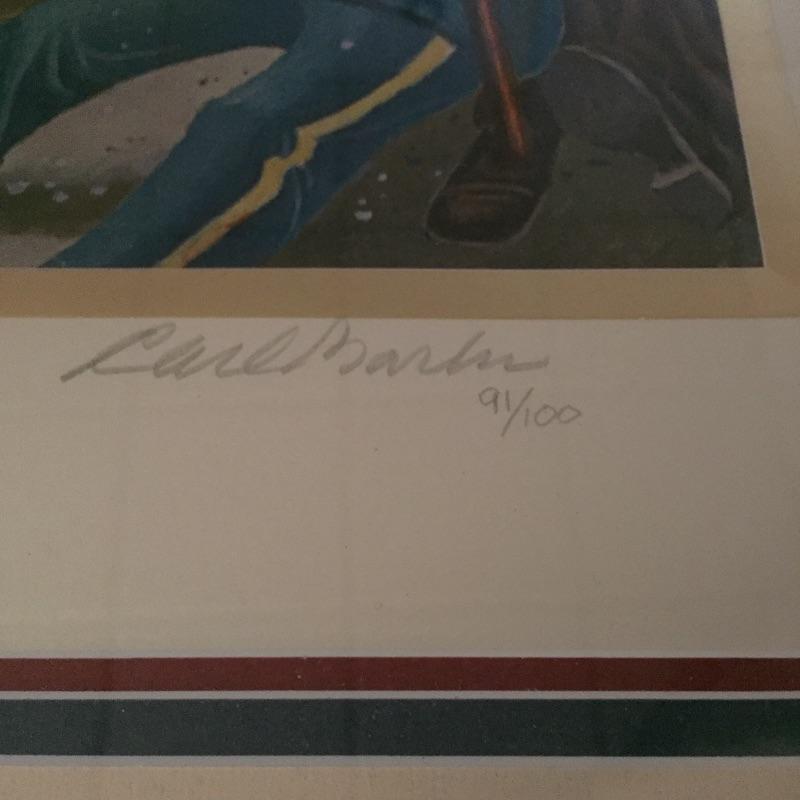This one is in a series of limited edition Bark’s Lithographs depicts a pantheon of his favorite characters. Signed and with the number 91 of 100. This colorful piece of art comes in a metal, matted frame and has a COA.