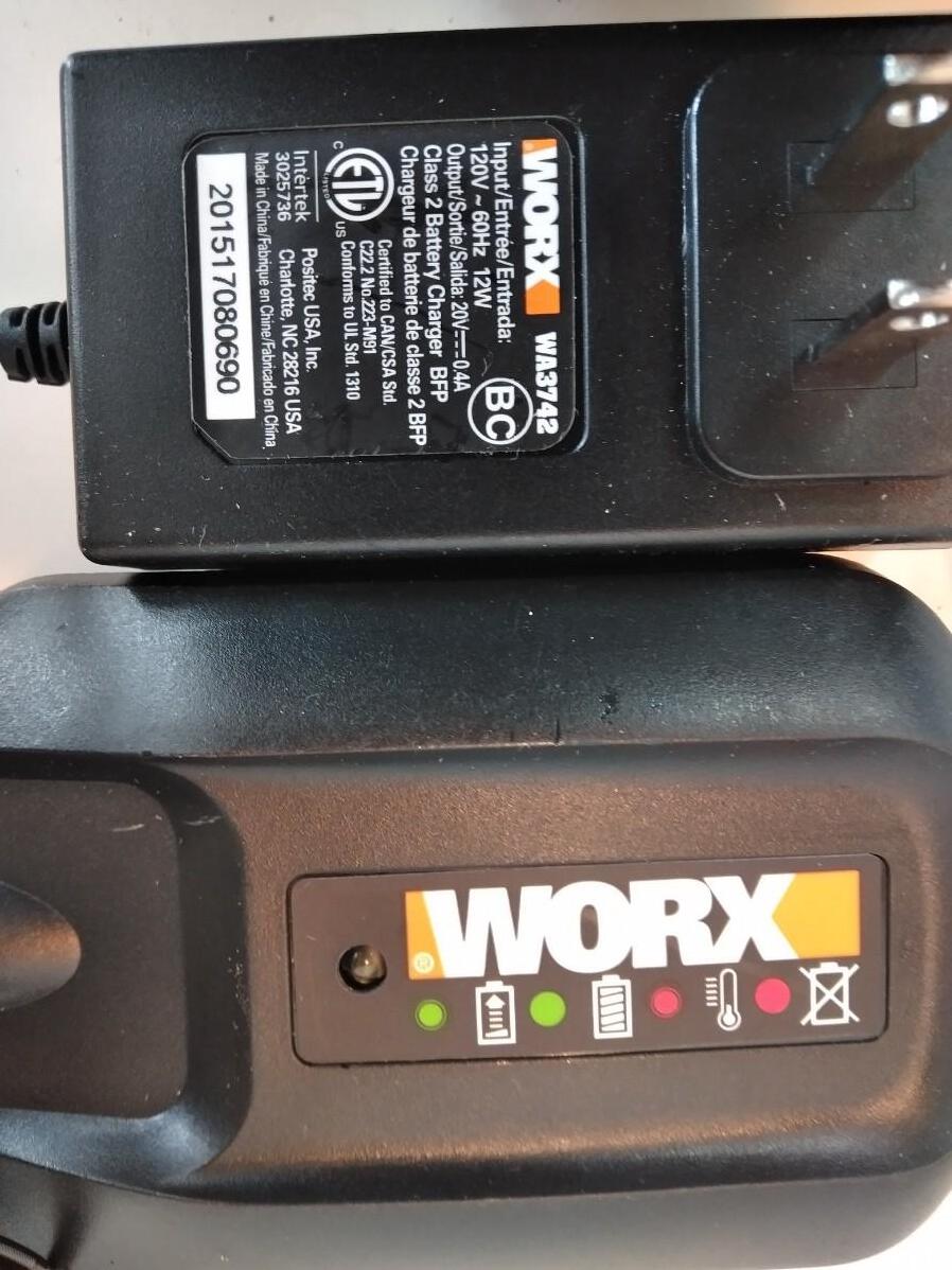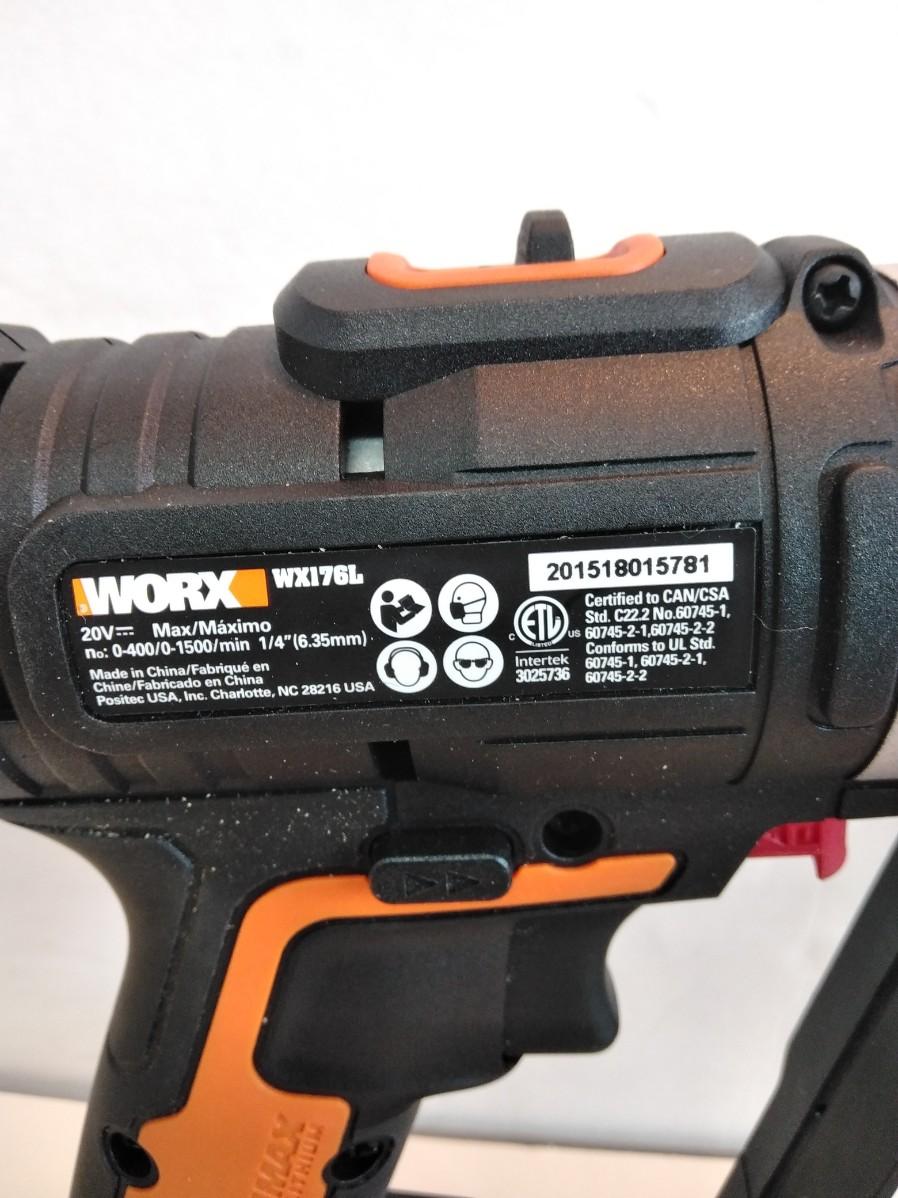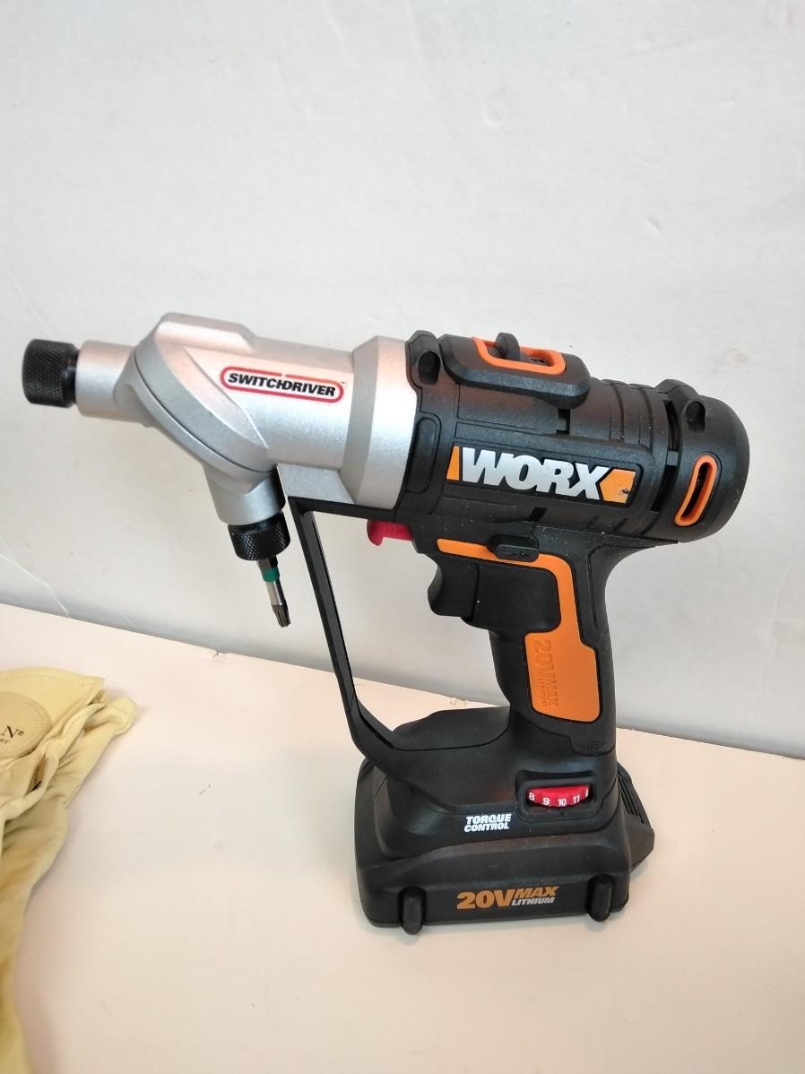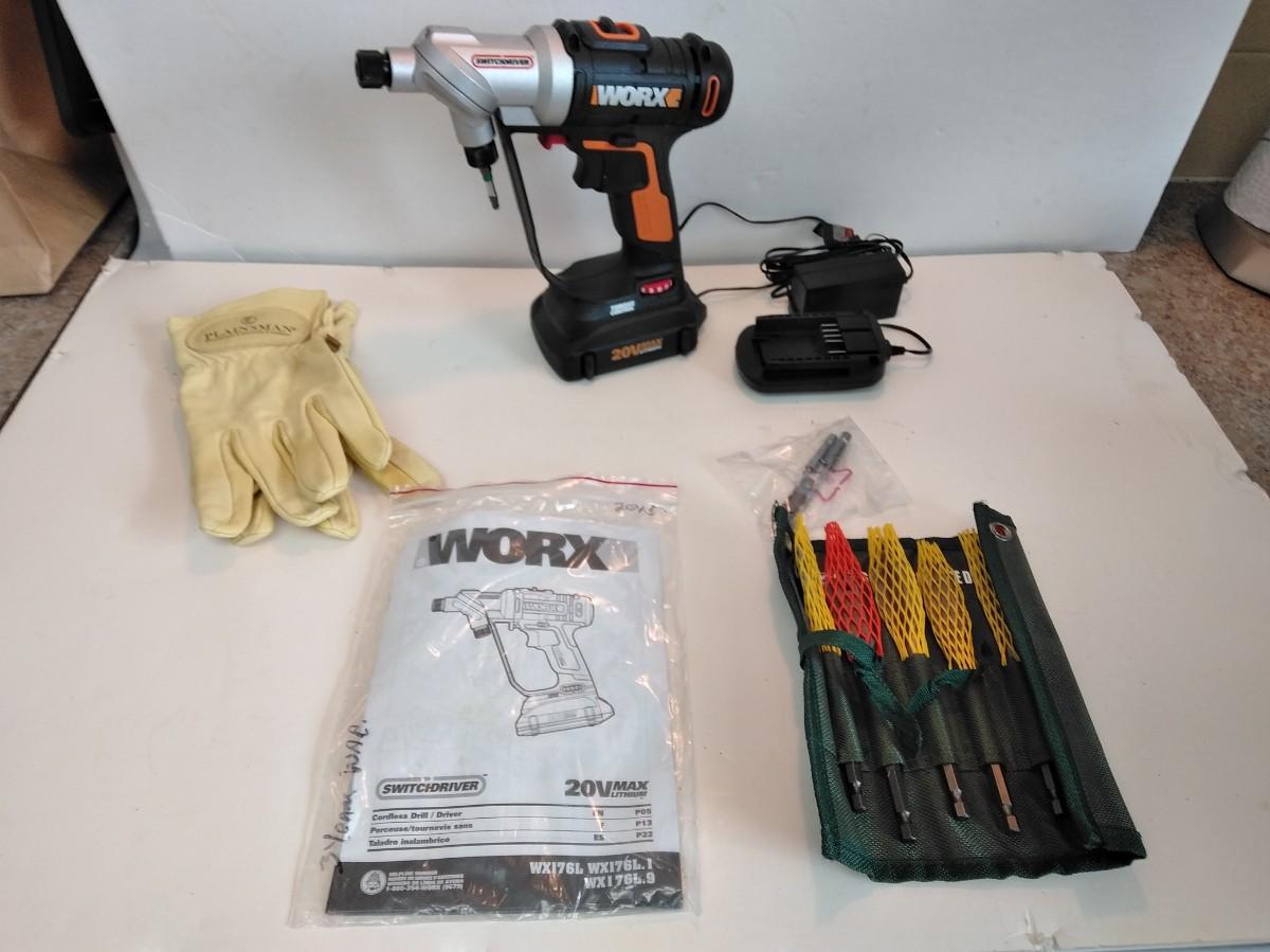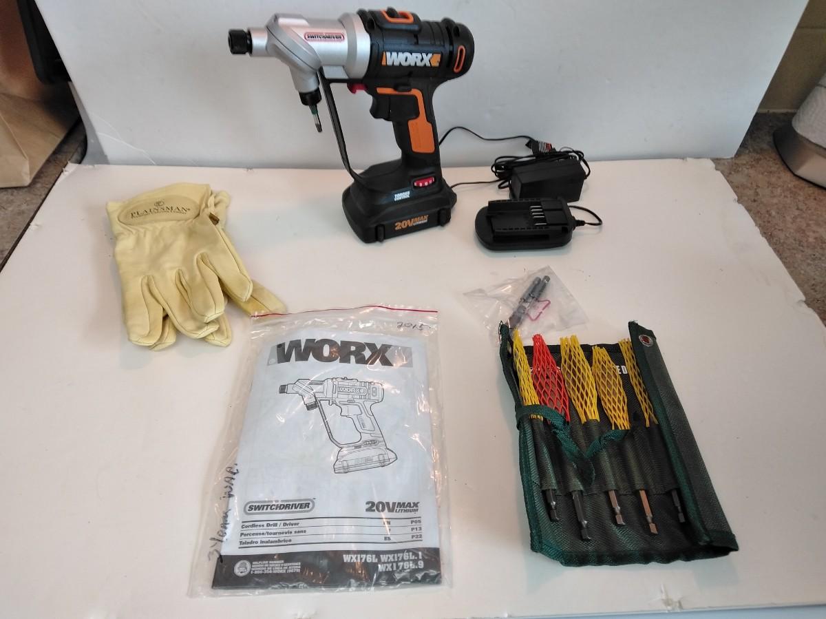 WORKS 20 VOLT WX176L 1/4" SWITCHDRIVER DRILL WITH BATTERY, CHARGER, EXTRA BITS, AND A PAIR OF LEATHER WORK GLOVES