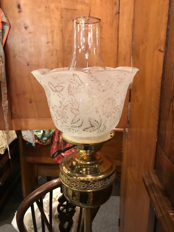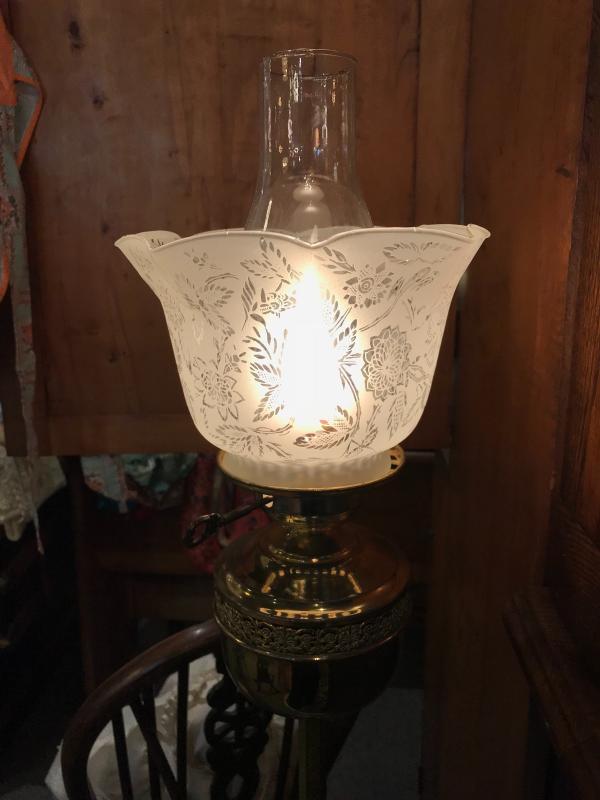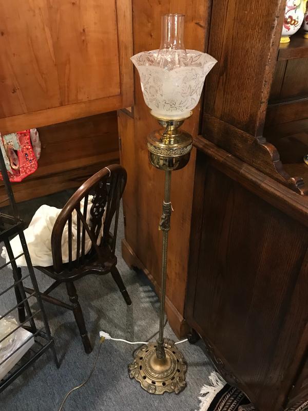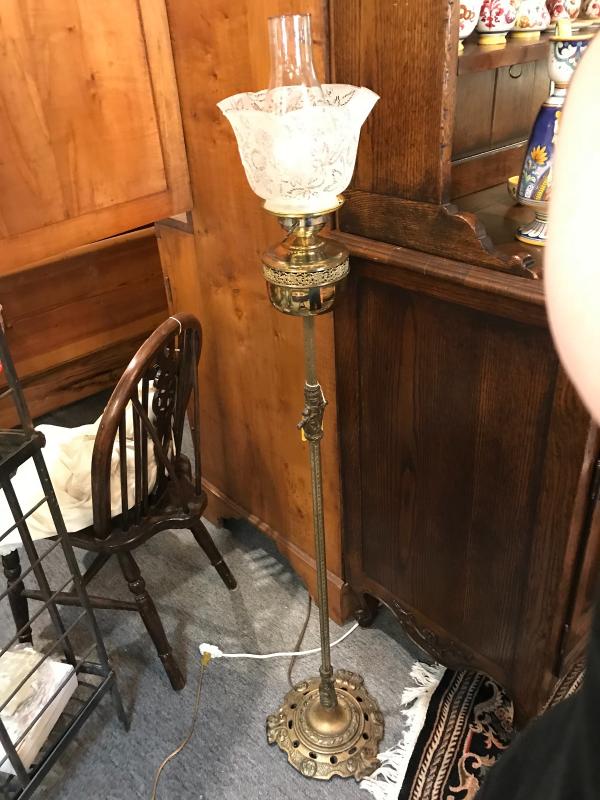 Very nice custom made floor lamp made to look like a Victorian standard oil lamp. Base consists of a circa 1920's era brass floor lamp base which is pierced, scrolled, and foliated, which supports an embossed hex pole with cast scroll accent toward the top. Surmounting this vintage pole and base is a brass circular font with pierced and scrolled band. An electric oil lamp style "burner" takes a standard lightbulb, and supports a clear chimney and etched antique 4" fitter Victorian ruffled frosted shade. 11 1/2" x 54 1/2" H
