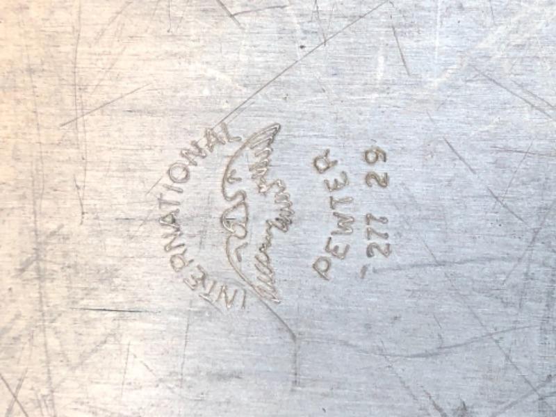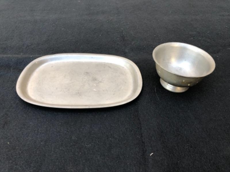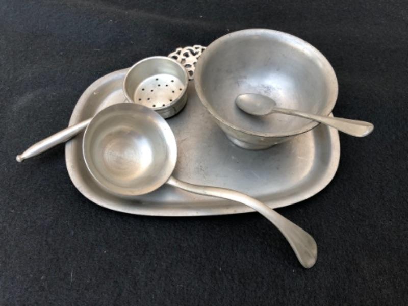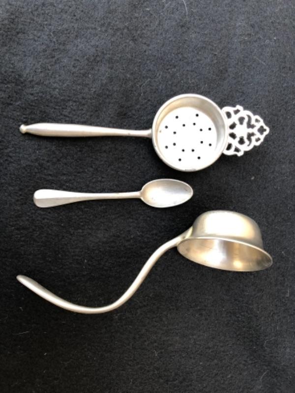 Lot 28P. 1 Pewter tea strainer, 1 Pewter spoon, 1 Pewter ladle, Nantucket, made in USA; 1 Pewter ladle, Nantucket, made in USA; 1 small bowl and tray, International Pewter “” $17.50