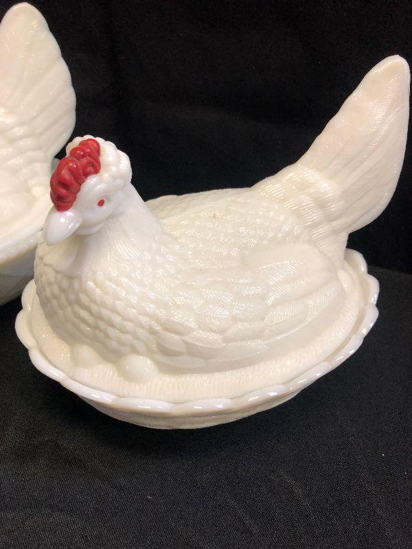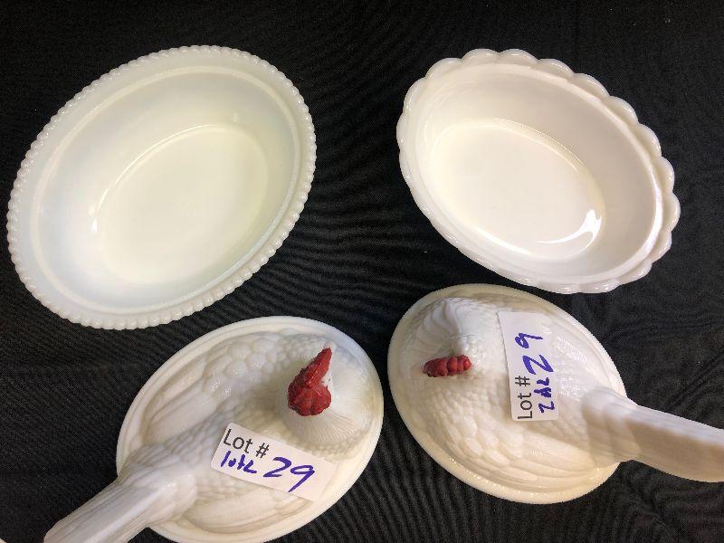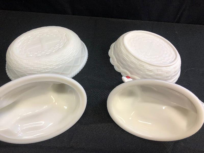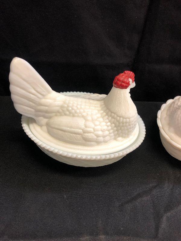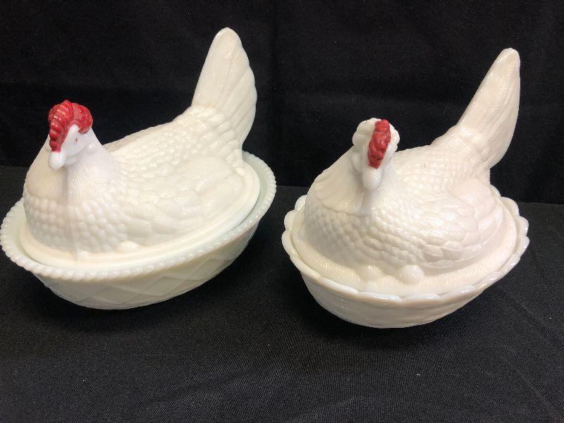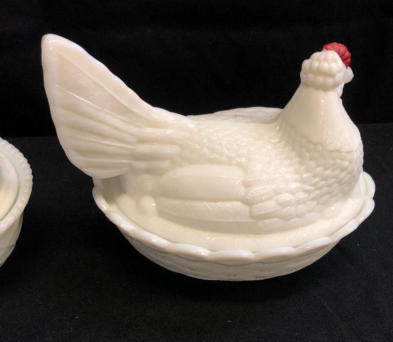 Lot 29 2- Westmorland Milk Glass Hen in Basket