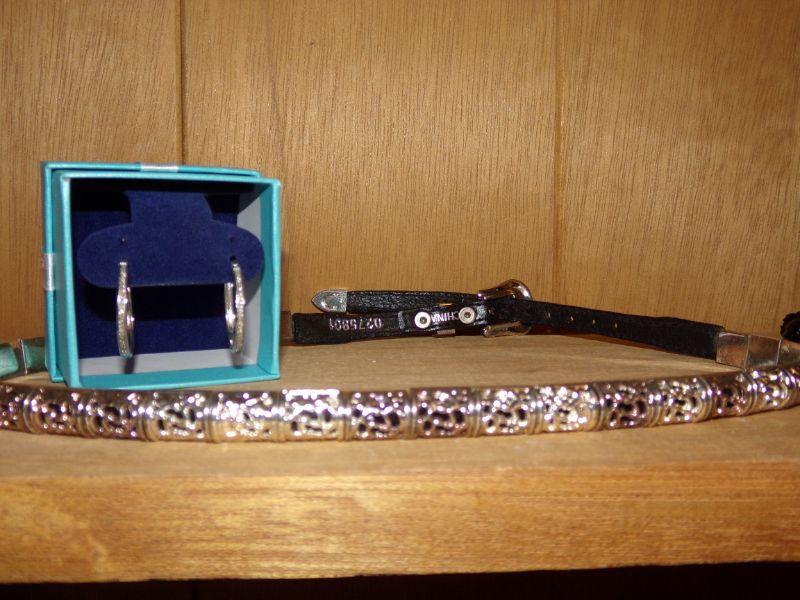 STERLING PIERCED EARRINGS, SMALL BEADED BELT, GLASS BEADED NECKLACE, HEADBAND W/FEATHER ACCENTS, SMALL SILVER COLORED RING AND MORE