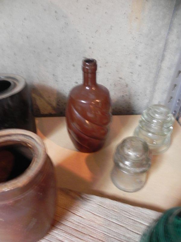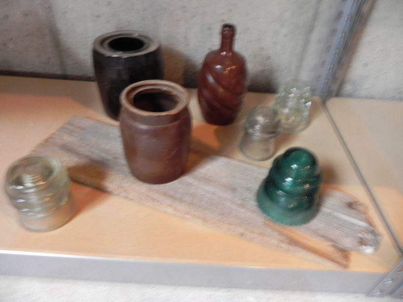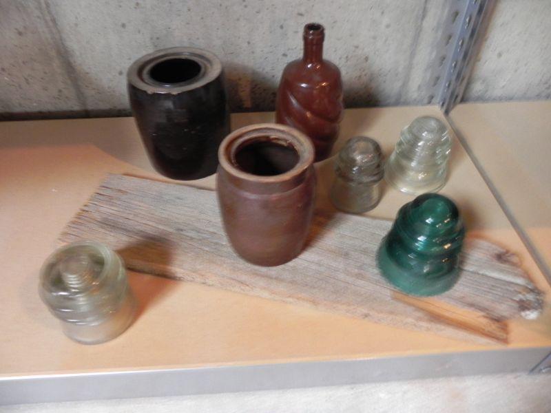BARN WOOD, 2 CLAY CANISTERS (NO LIDS), BOTTLE AND INSULATORS