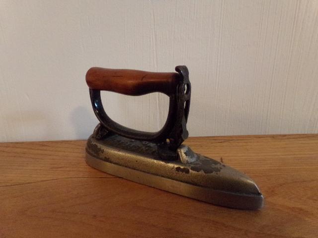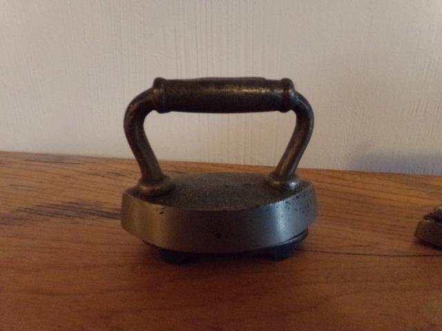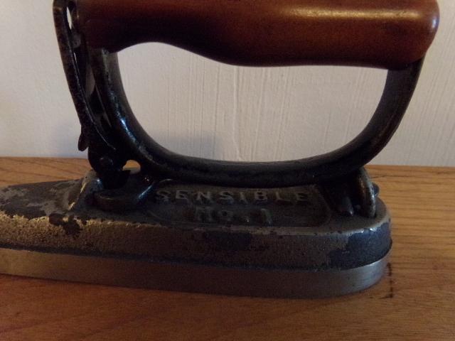 ANTIQUE SENSIBLE NO. 1 SAD IRON WITH WOODEN HANDLE. SMALL CAST SAD IRON. BOTH ARE IN GOOD CONDITION.