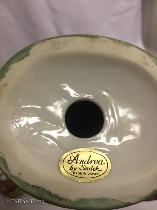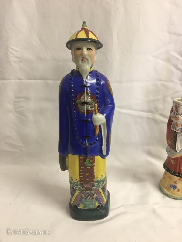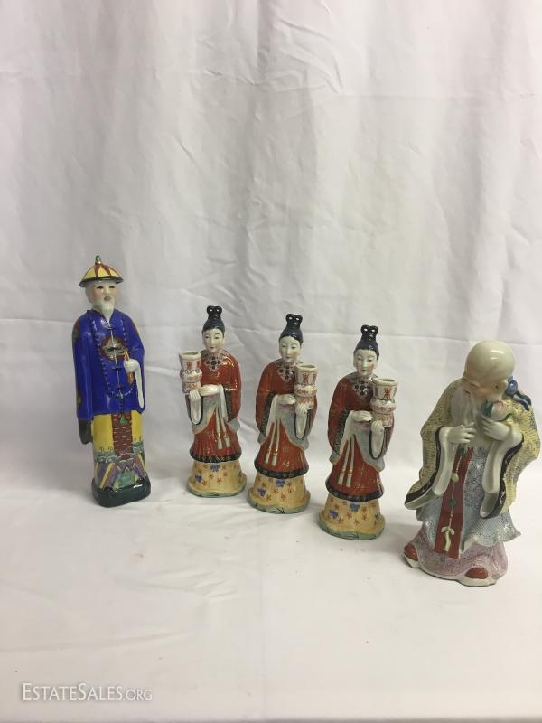 Tall blue coated man measures 14" tall. Three matching women are Andrea by Sadek. Bearded one has no markings. This lot is avaialable for shipping or local pick up in Waynesville, NC.