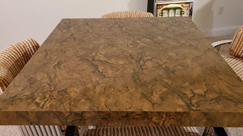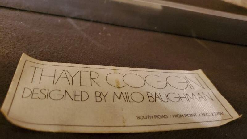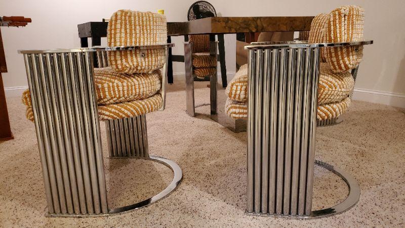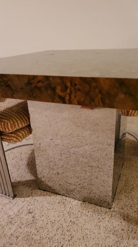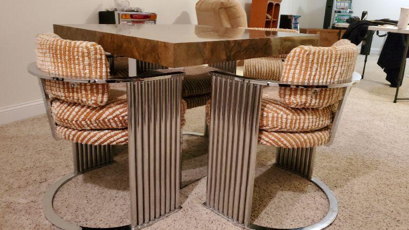 "Thayer Coggin" Designed by Milo Baughman, 1970s, chrome chairs with plush seats.. notice the small knick in the Formica laminate pictured and the table stop separated from the base, also pictured. This is a solid, heavy set, bring help to move. WILL NOT SHIP. Pickup only. If you wanted your own freight carrier to pick it up, that is possible. Message us.