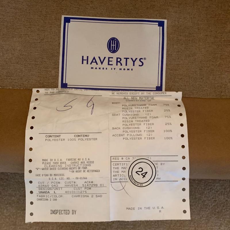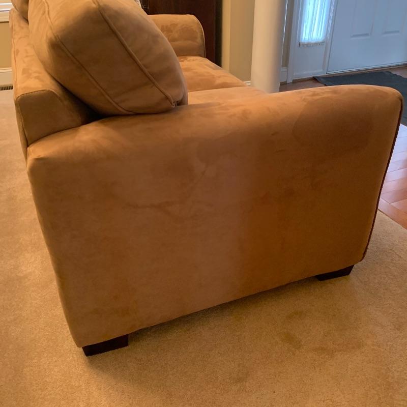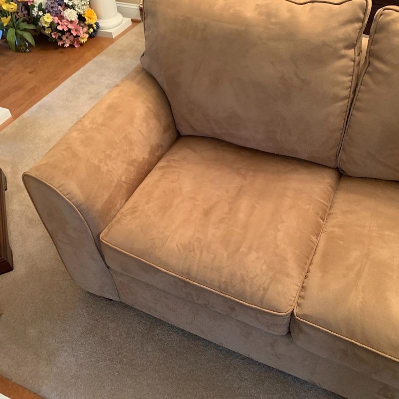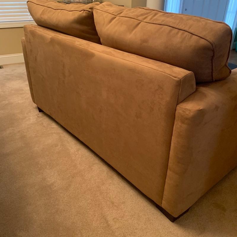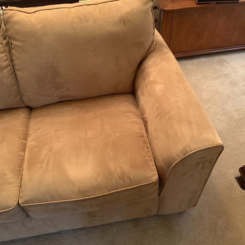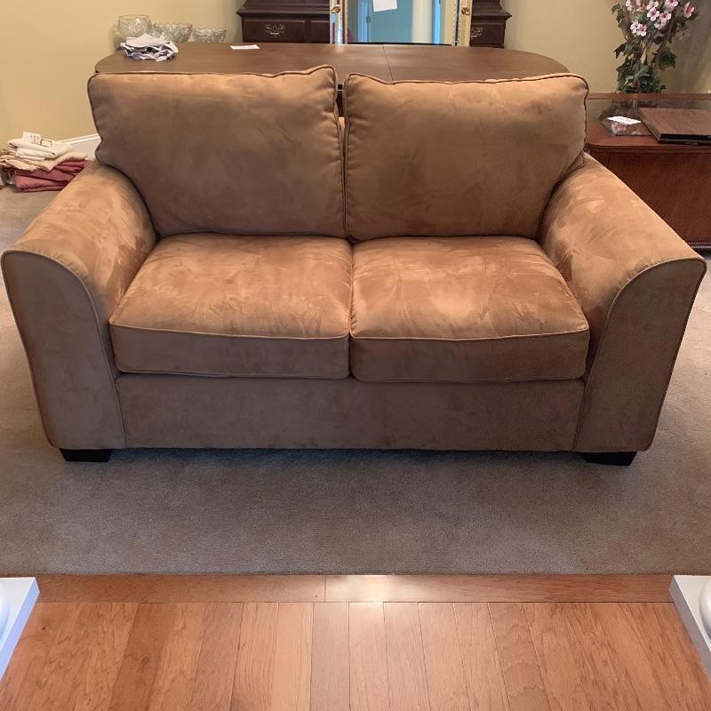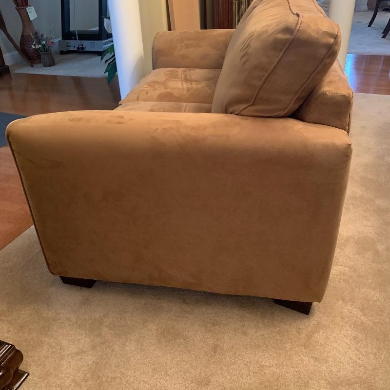 This camel colored four cushion loveseat is in good condition and very comfortable. All polyester materials but the fabric is that microfiber (easy clean). Piece measures 64” x36” x 34” with seat height being 17”. Please bring help to load. Local pick up only.