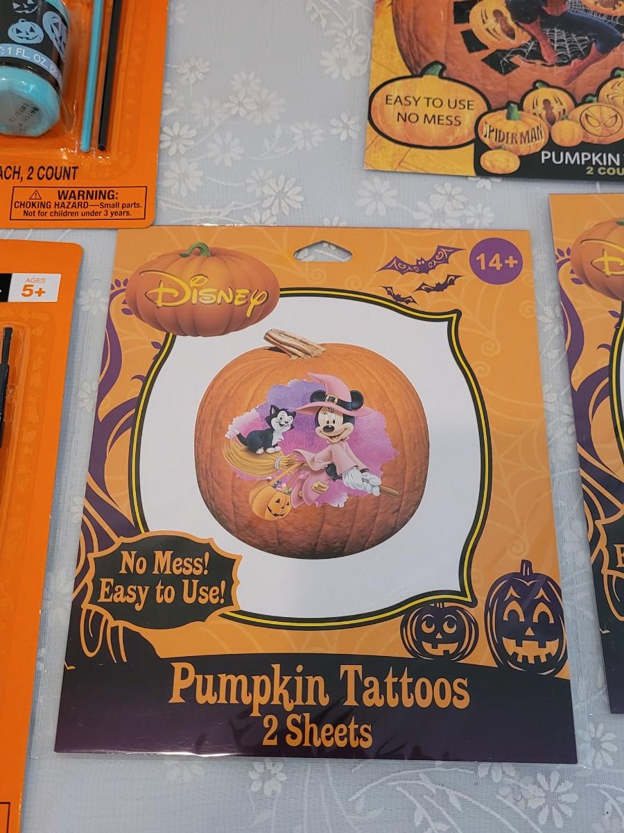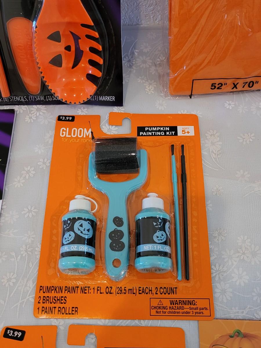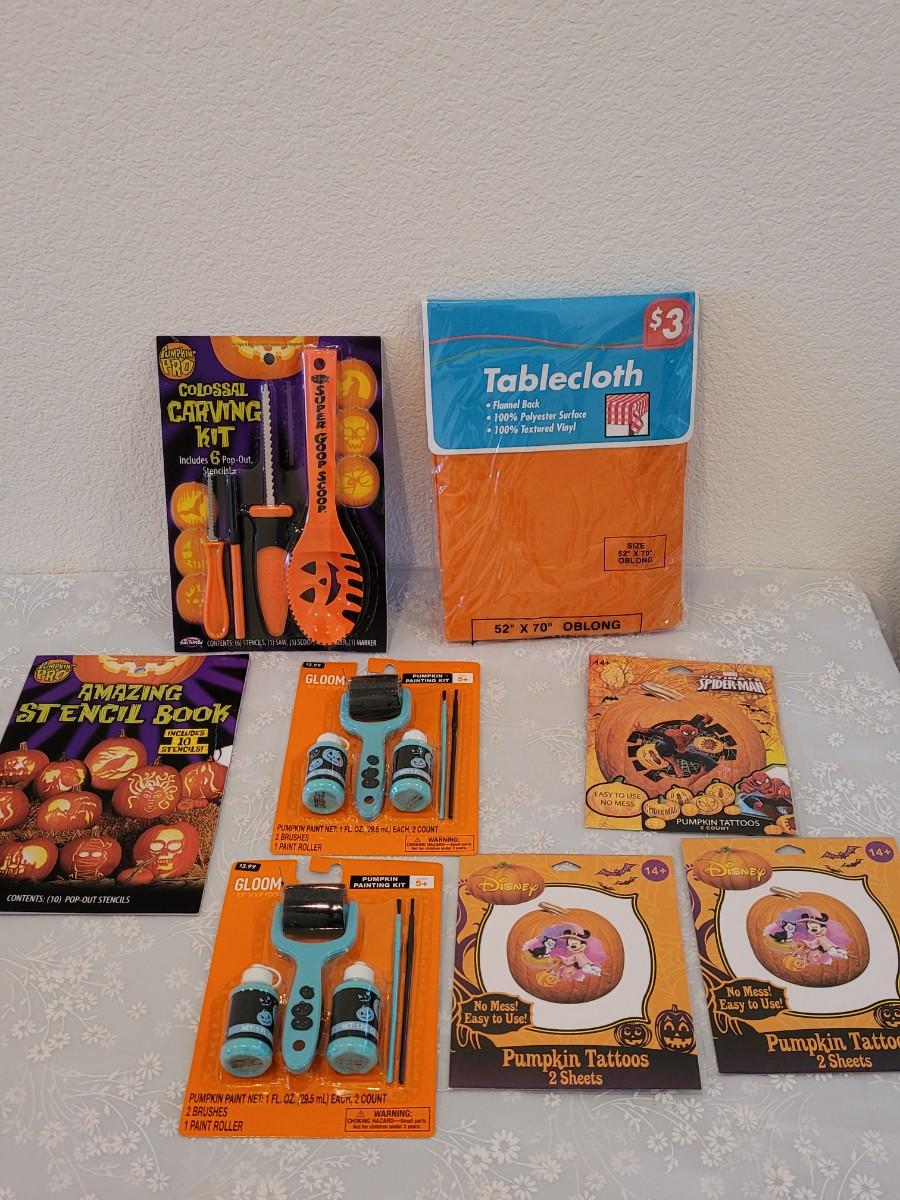 Lot 29: Pumpkin Carving Set. Pumpkin Paints, Pumpkin Tattoos, Stencils and Flannel Backed Disposable Tablecloth