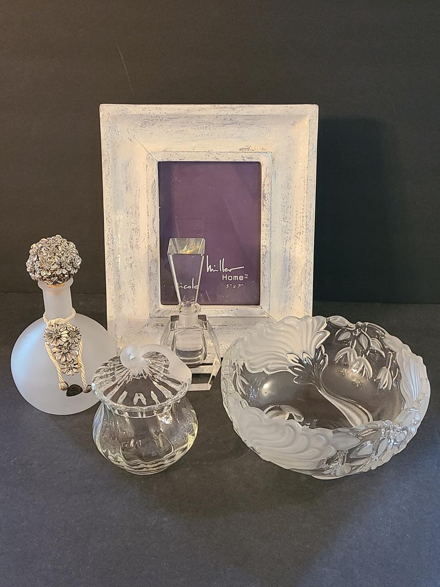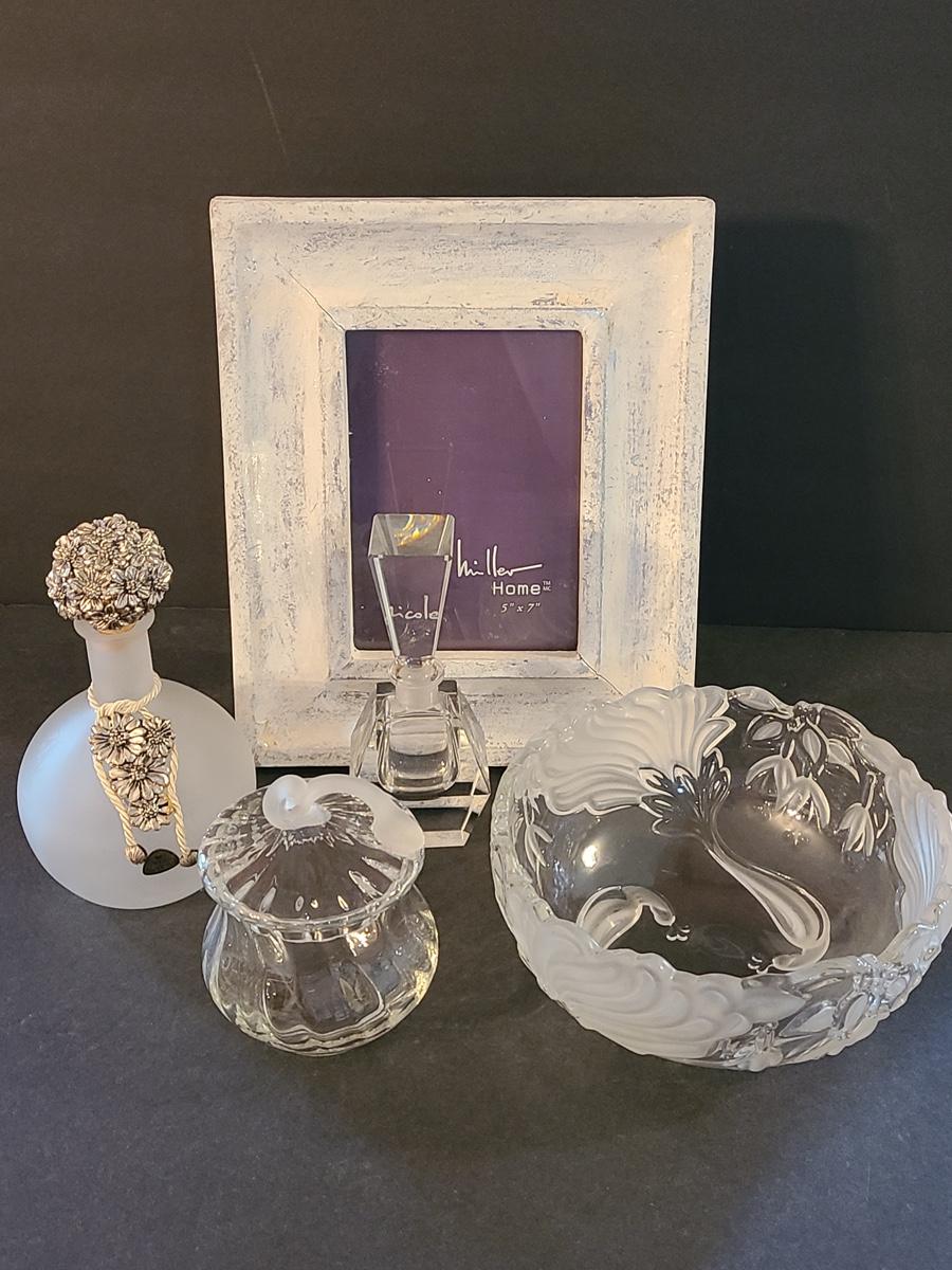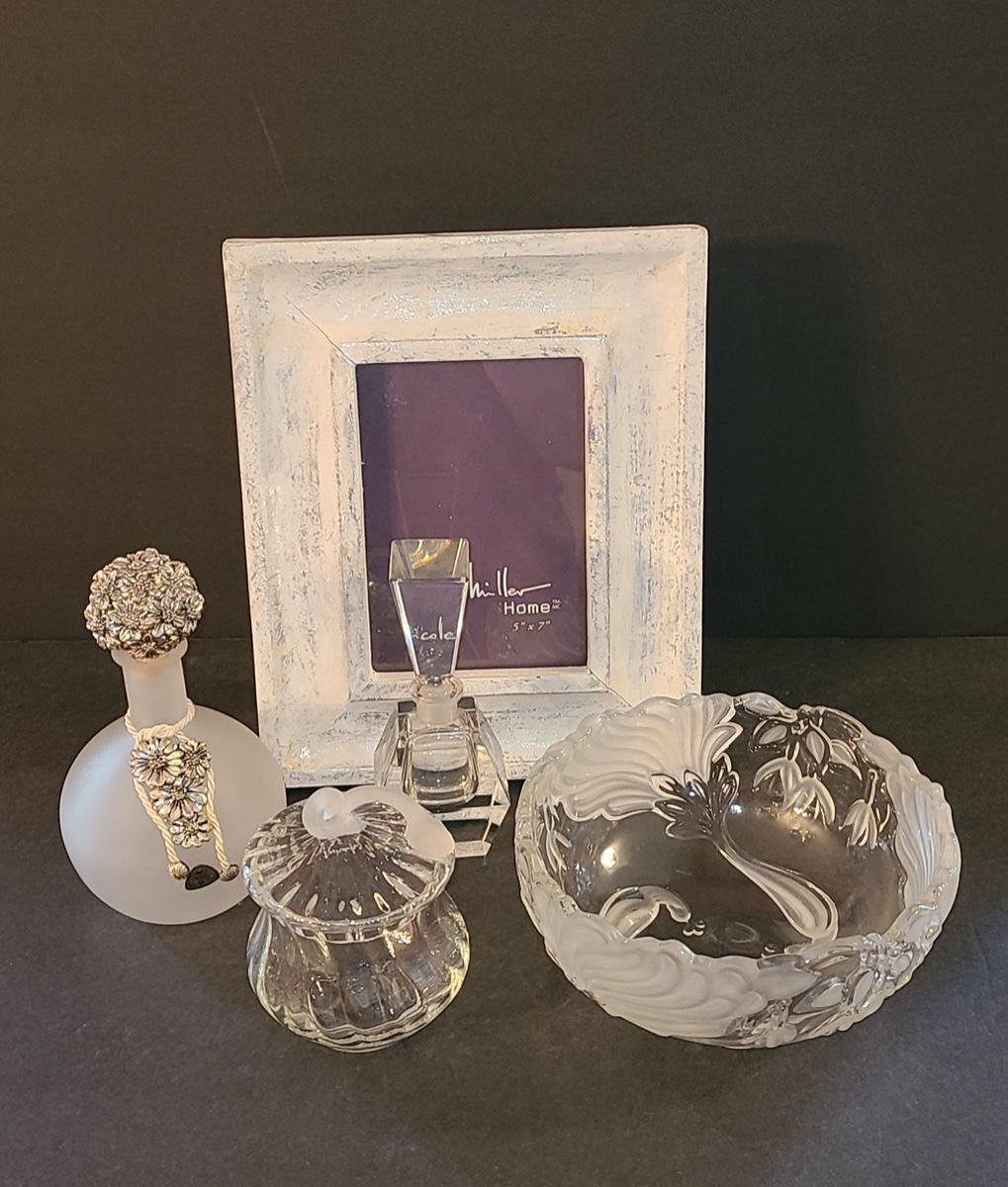 Nicole Miller frame, Via Veneto perfume bottle, glass perfume bottle (small chip in lip), elegant bowl with birds, and handled lidded jar perfect for cotton balls! Please see all pictures as they are the best representation of the items in the lot, the condition of the lot, and will show measurements if taken. If purchasing furniture you must be able to move yourself with your own help, and truck.