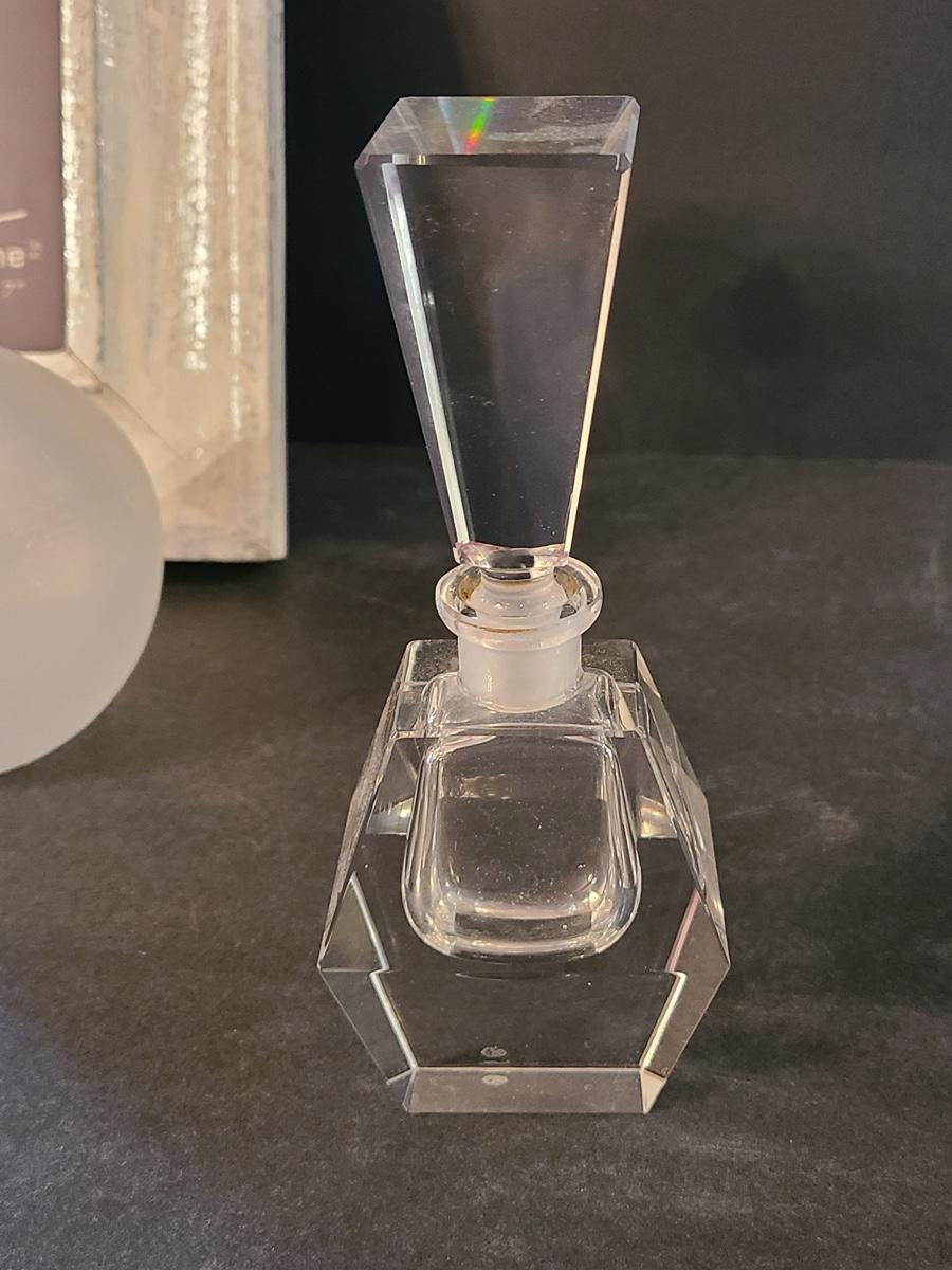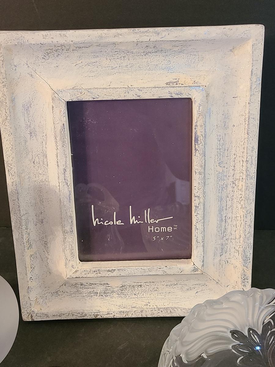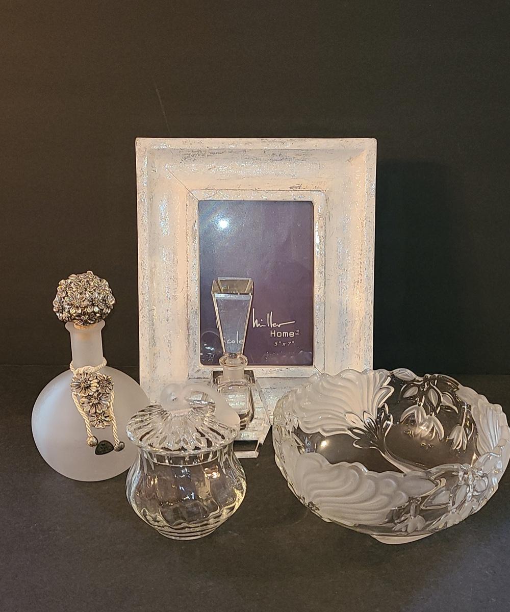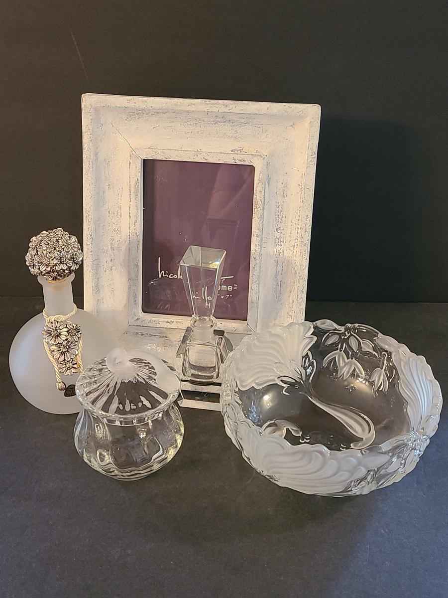 Nicole Miller frame, Via Veneto perfume bottle, glass perfume bottle (small chip in lip), elegant bowl with birds, and handled lidded jar perfect for cotton balls! Please see all pictures as they are the best representation of the items in the lot, the condition of the lot, and will show measurements if taken. If purchasing furniture you must be able to move yourself with your own help, and truck.