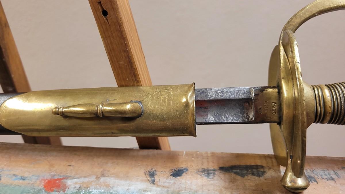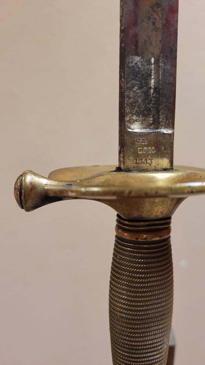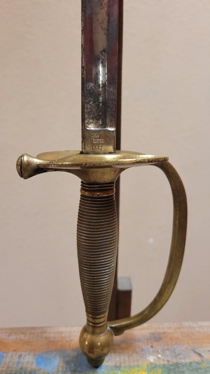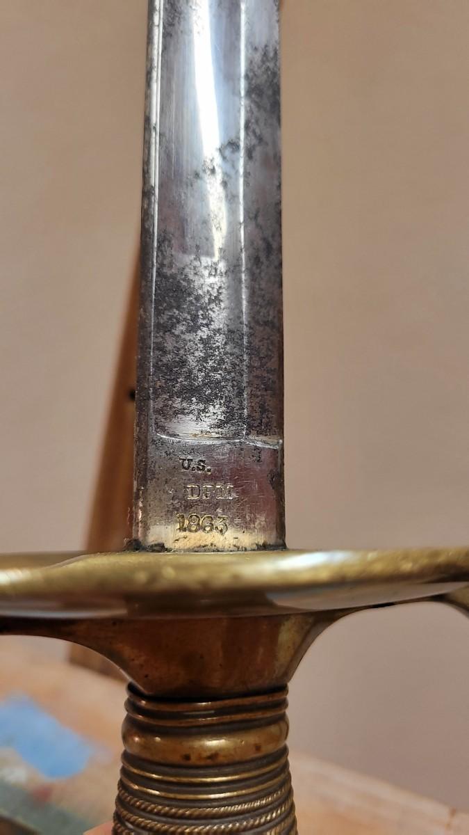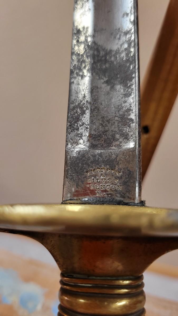 Hard to fond TRIPLE SIGNED example in impressive condition for age. This Has a Brass Basket Cross Guard and rare all Brass Handle. The Sword is signed by the maker "Emerson & Silver Trenton NJ" on One Side, and 1863 on the Other Side. The DFM marking is the Inspector's Mark from Dexter F. Mosman who Worked for Emerson & Silver from 1862 - 1864. The Markings on the Blade Have Wear From Age and are Partially Legible. A fine collector's piece.