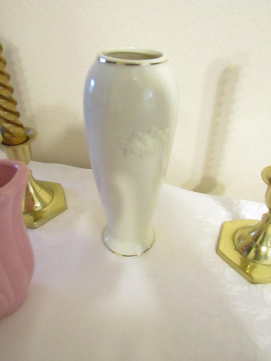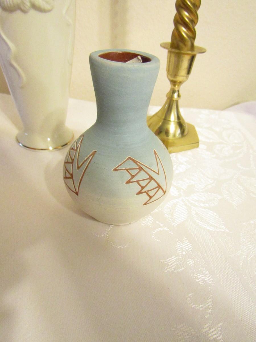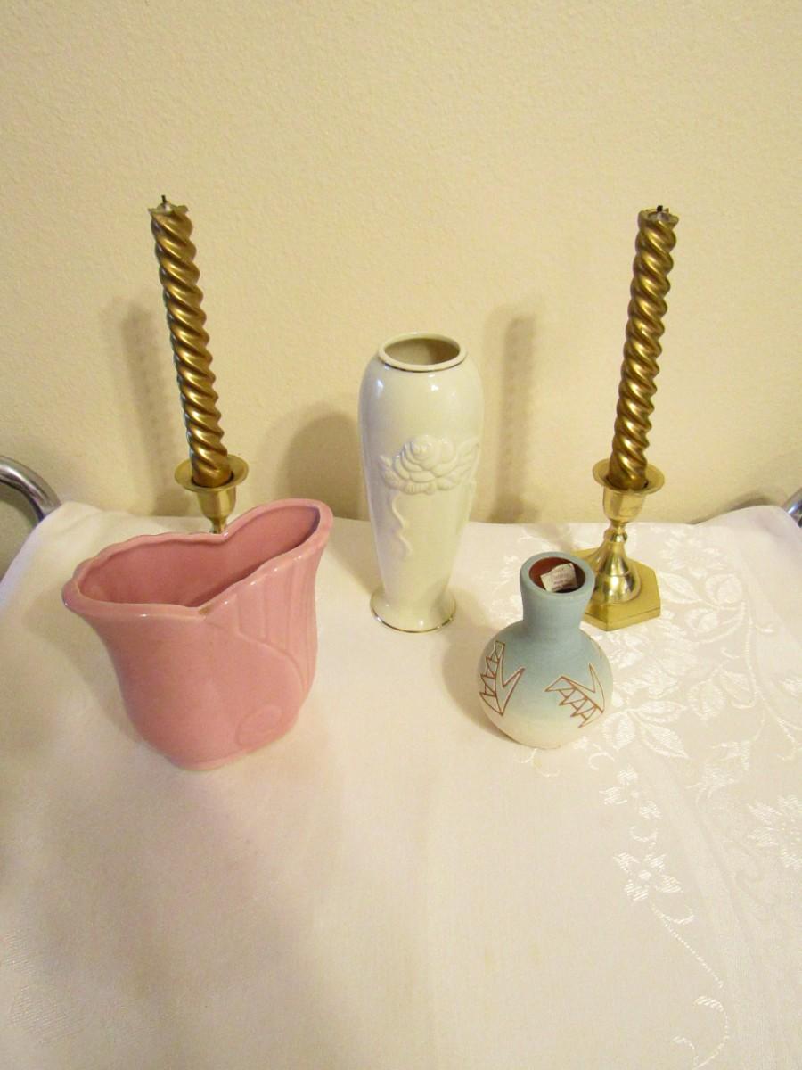 SIGNED SIOUX INDIAN CLAY VASE, LENOX PORCELAIN VASE, CERAMIC POT AND 2 MATCHING BRASS CANDLE HOLDERS