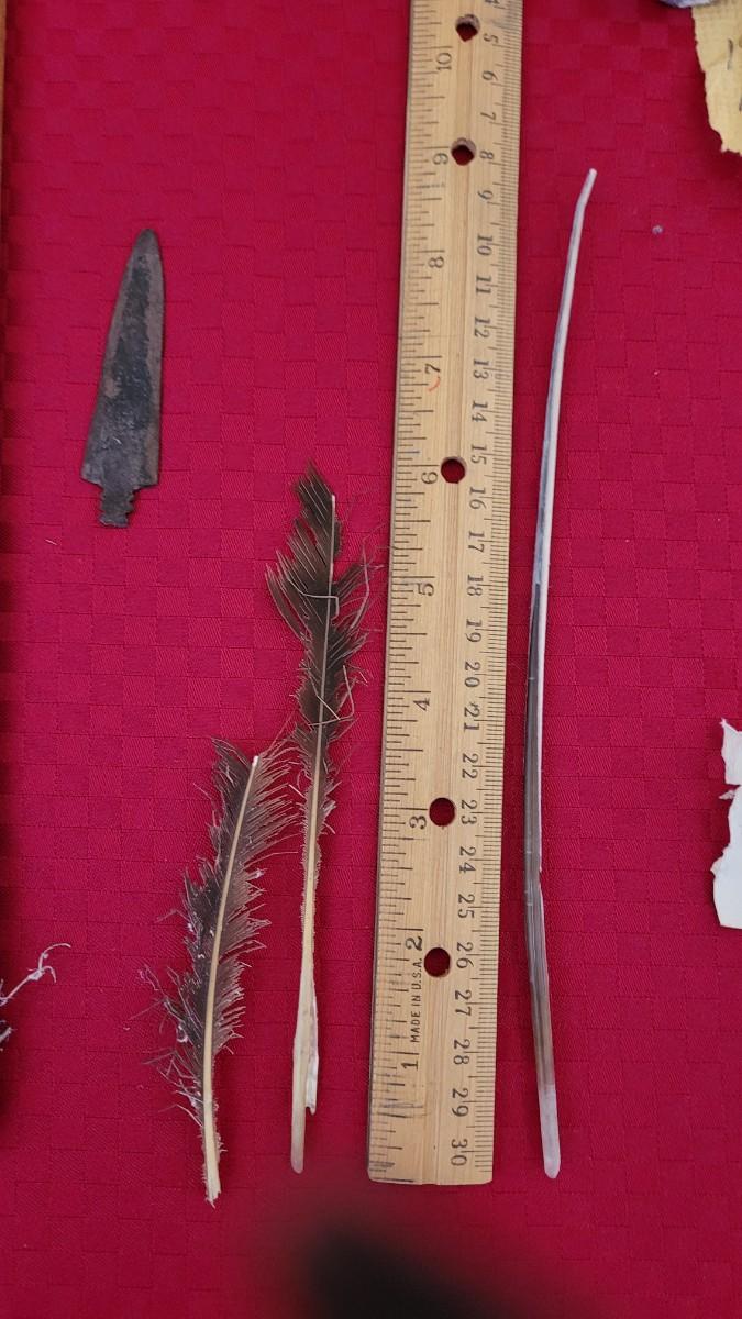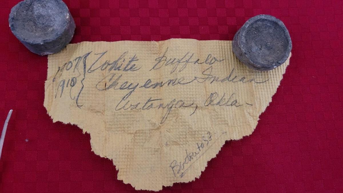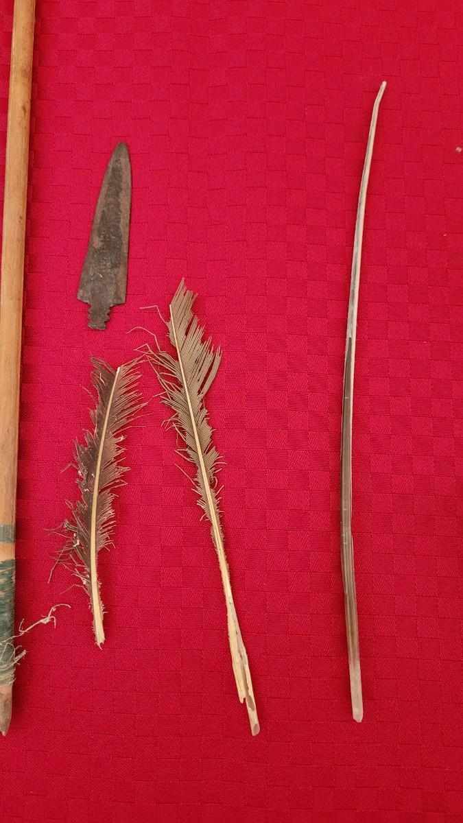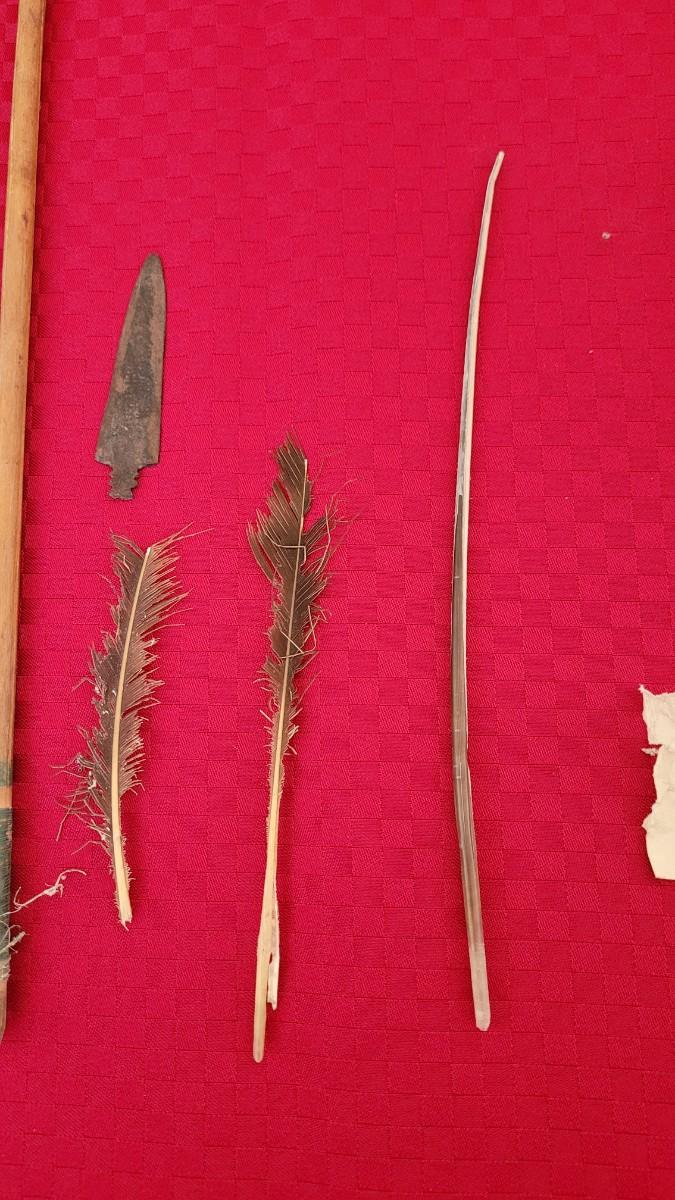 After hearing a rattle at the bottom of the quiver, I carefully pulled out, a piece of paper from the very bottom of the quiver stating this is WHITE BUFFALO'S bow, arrows and quiver. Also, inside were original feathers for the arrows and one metal Arrowhead. There is also the address of Liston's mother, Madalyn Leyendecker included.