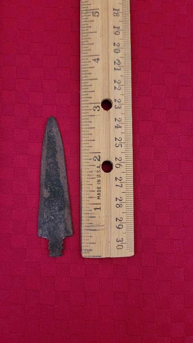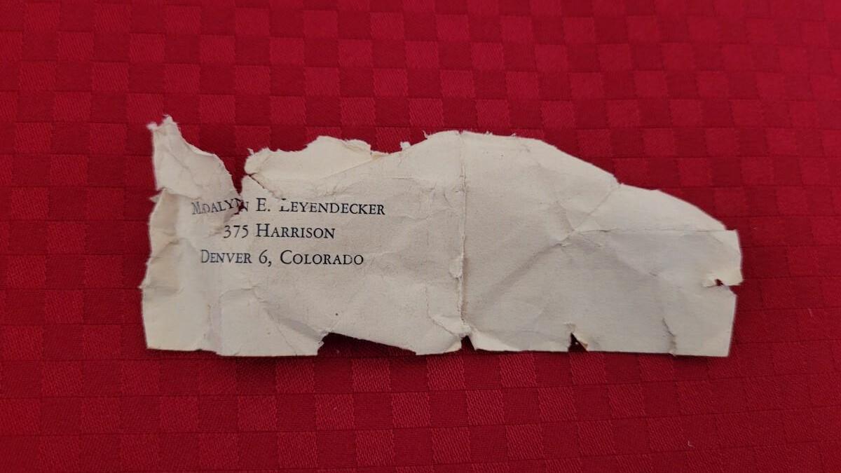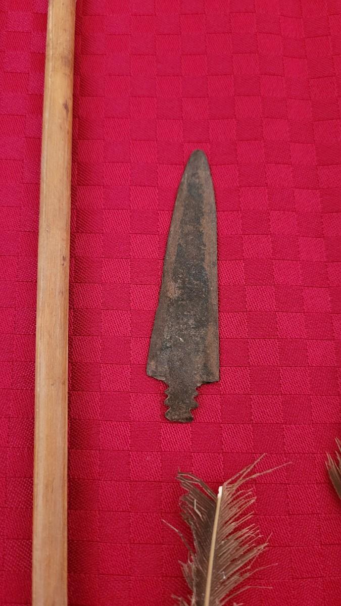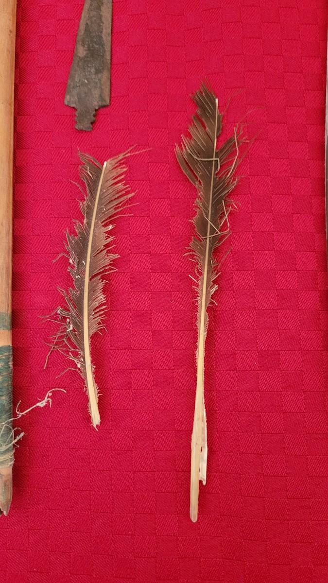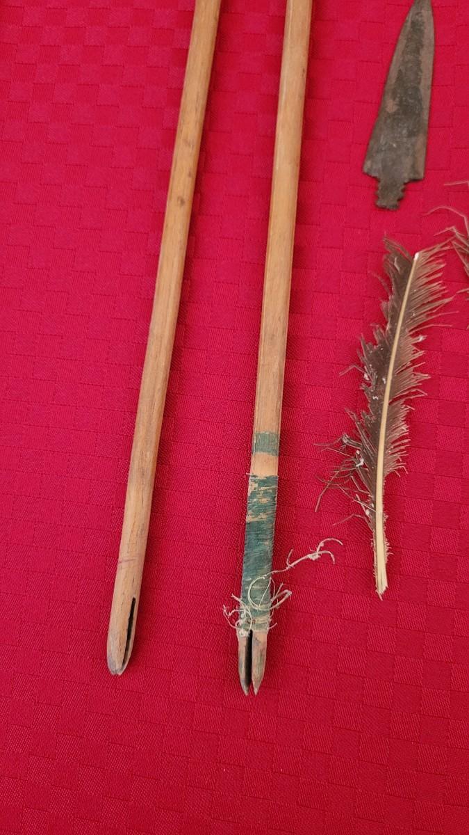 After hearing a rattle at the bottom of the quiver, I carefully pulled out, a piece of paper from the very bottom of the quiver stating this is WHITE BUFFALO'S bow, arrows and quiver. Also, inside were original feathers for the arrows and one metal Arrowhead. There is also the address of Liston's mother, Madalyn Leyendecker included.