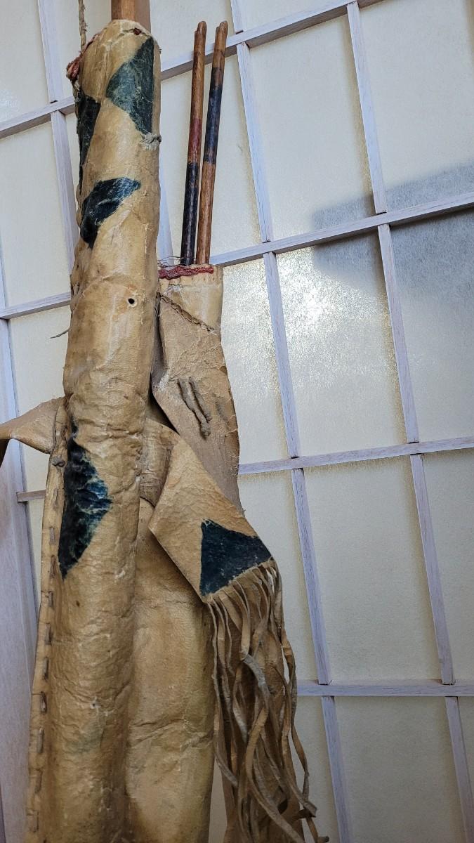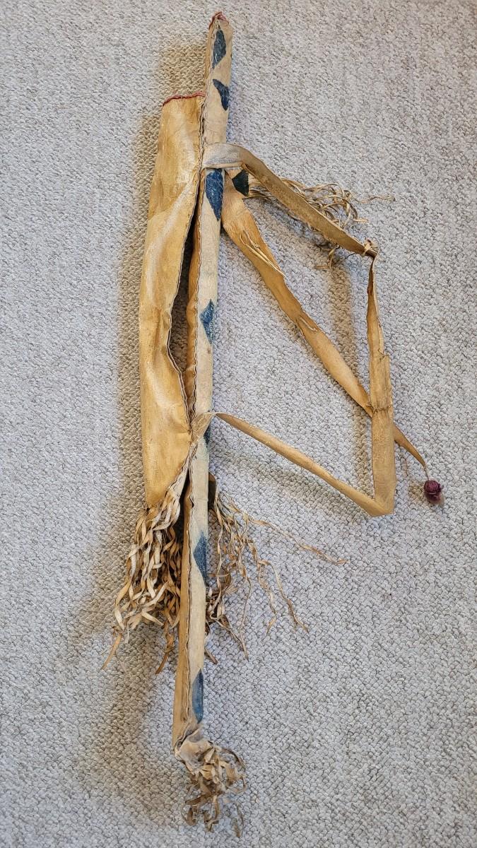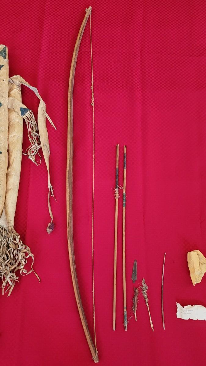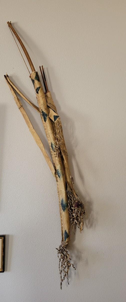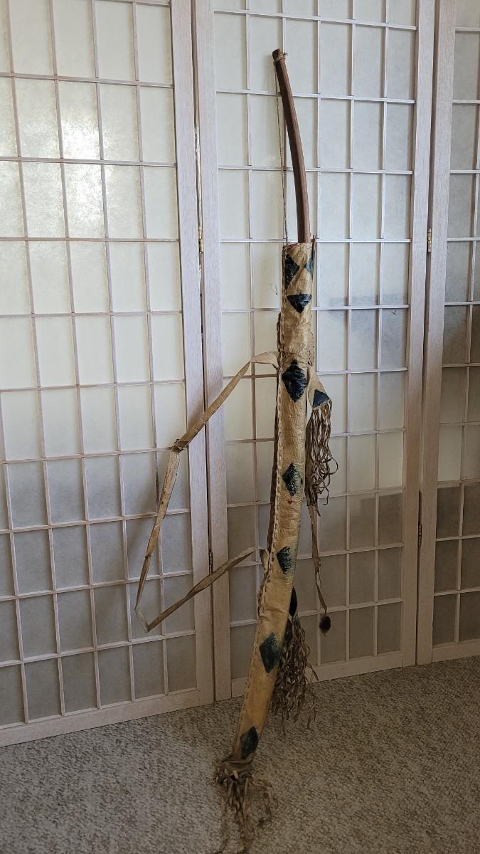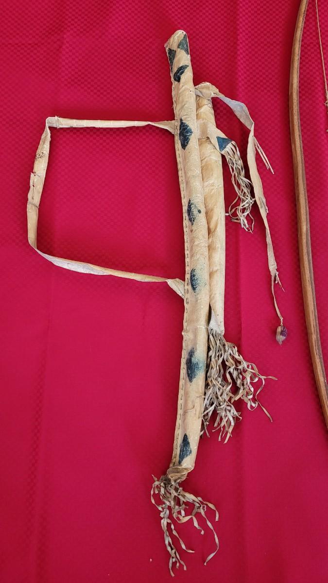 So much better in person! The Quiver and Arrows have faded blue paint decoration. The bow is absolutely stunning. It is sewn together with leather sinew. The red fabric trim is sewn on with Thread.
