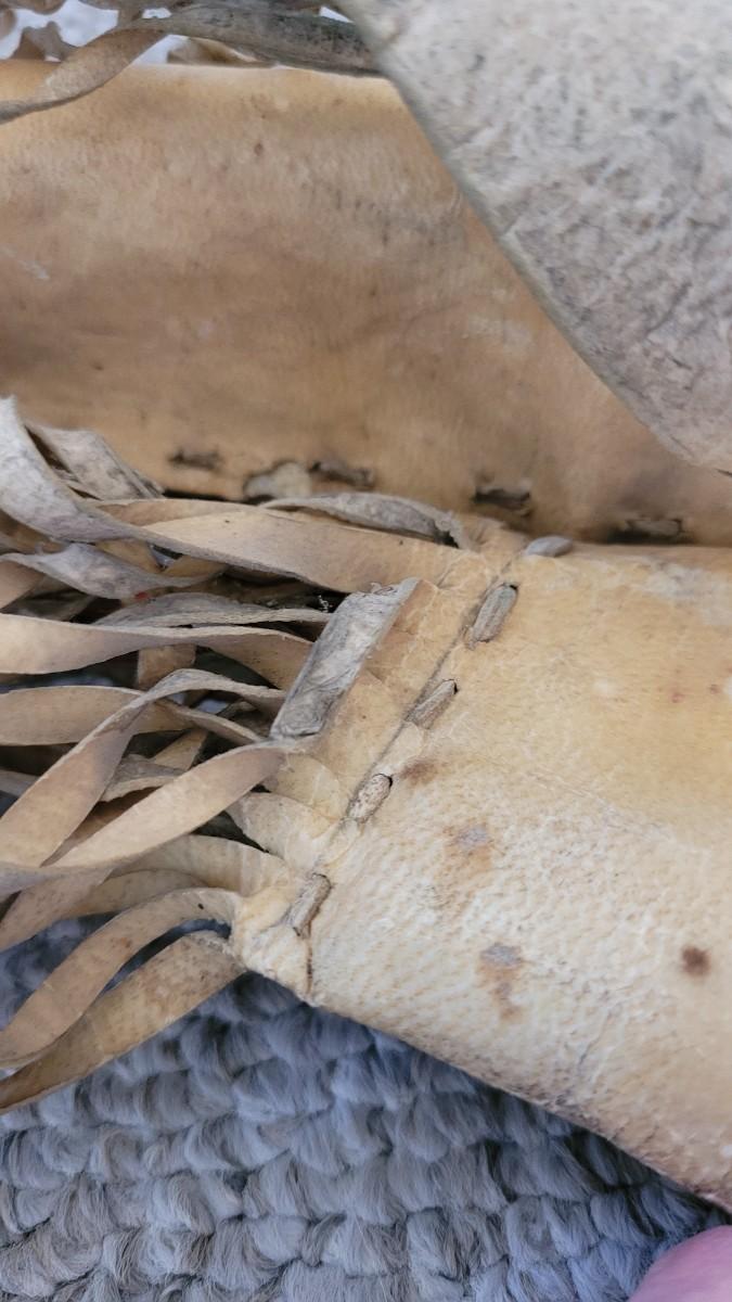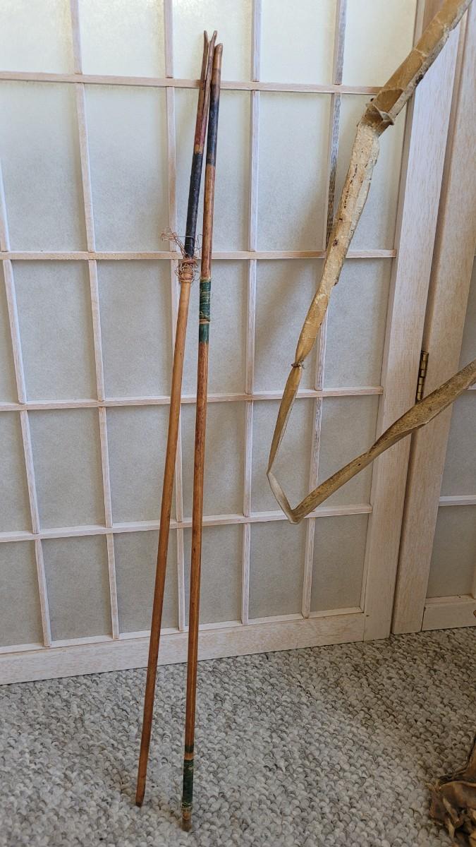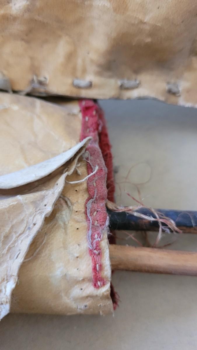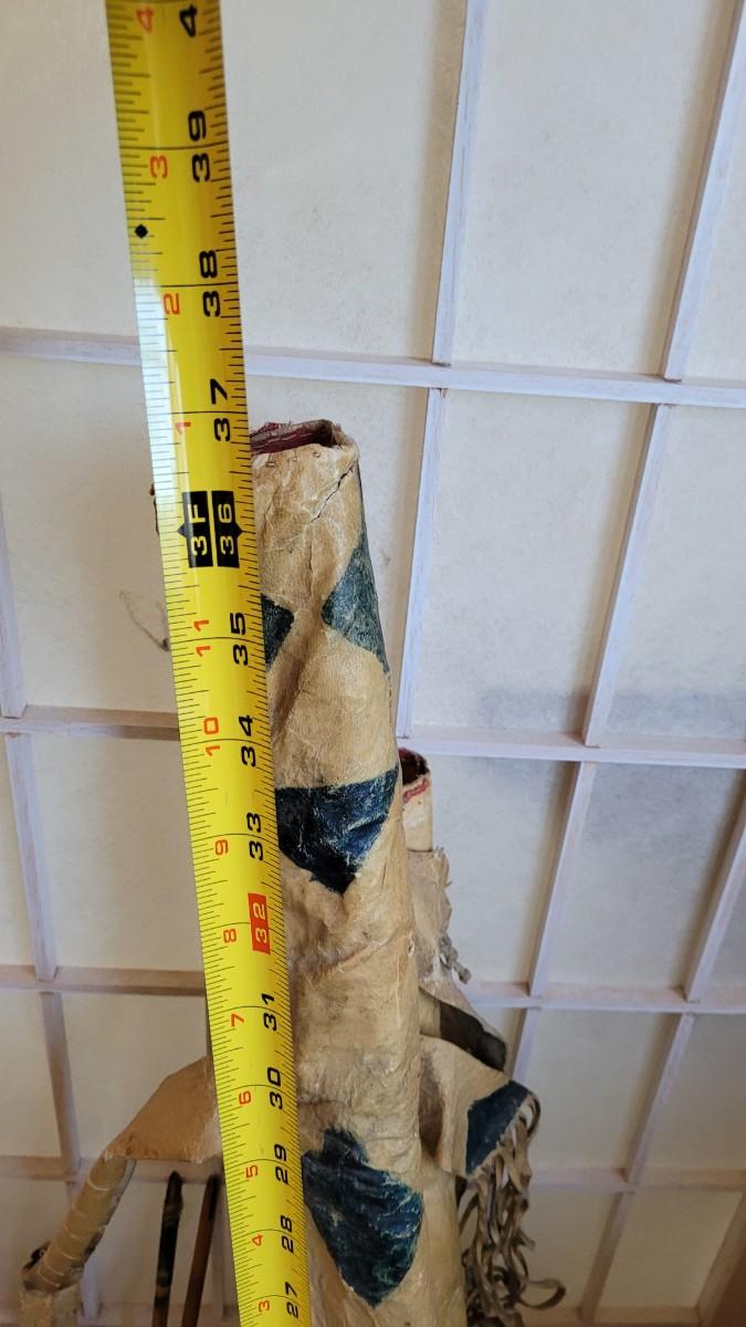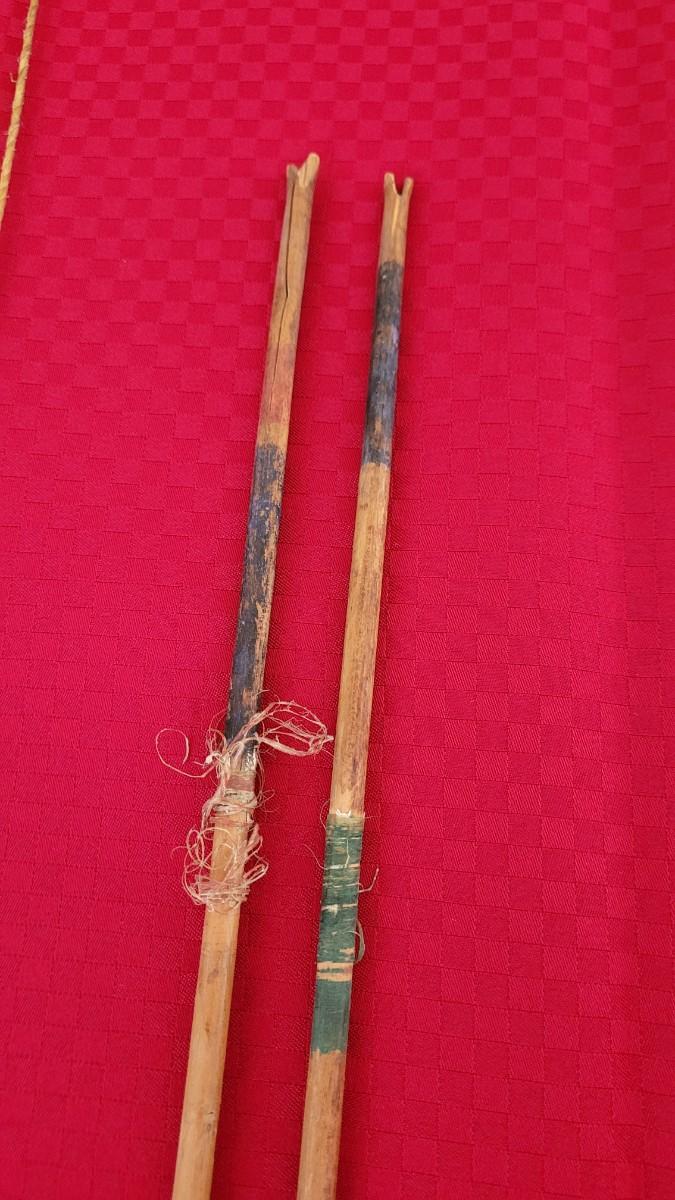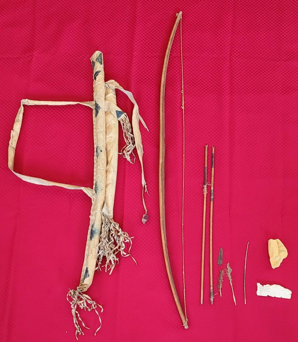 So much better in person! The Quiver and Arrows have faded blue paint decoration. The bow is absolutely stunning. It is sewn together with leather sinew. The red fabric trim is sewn on with Thread.